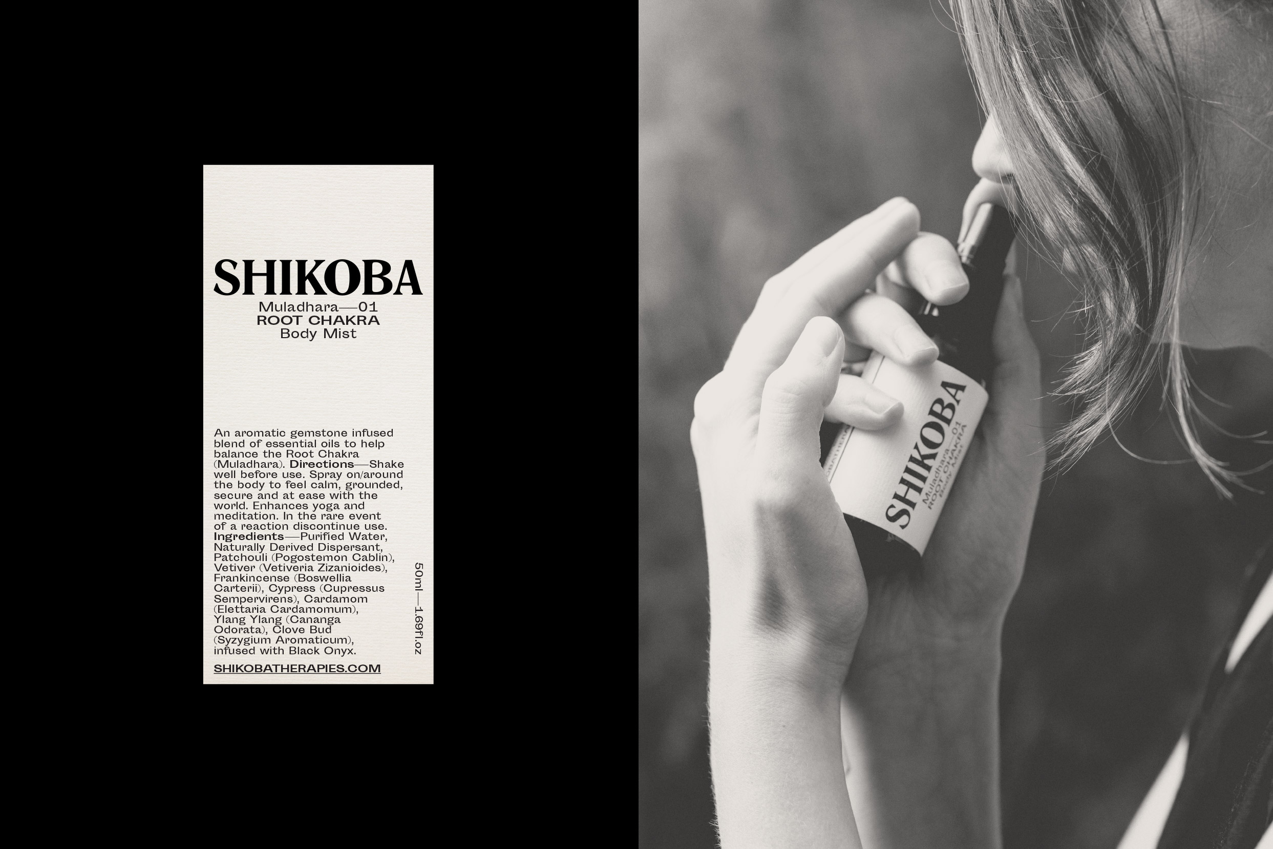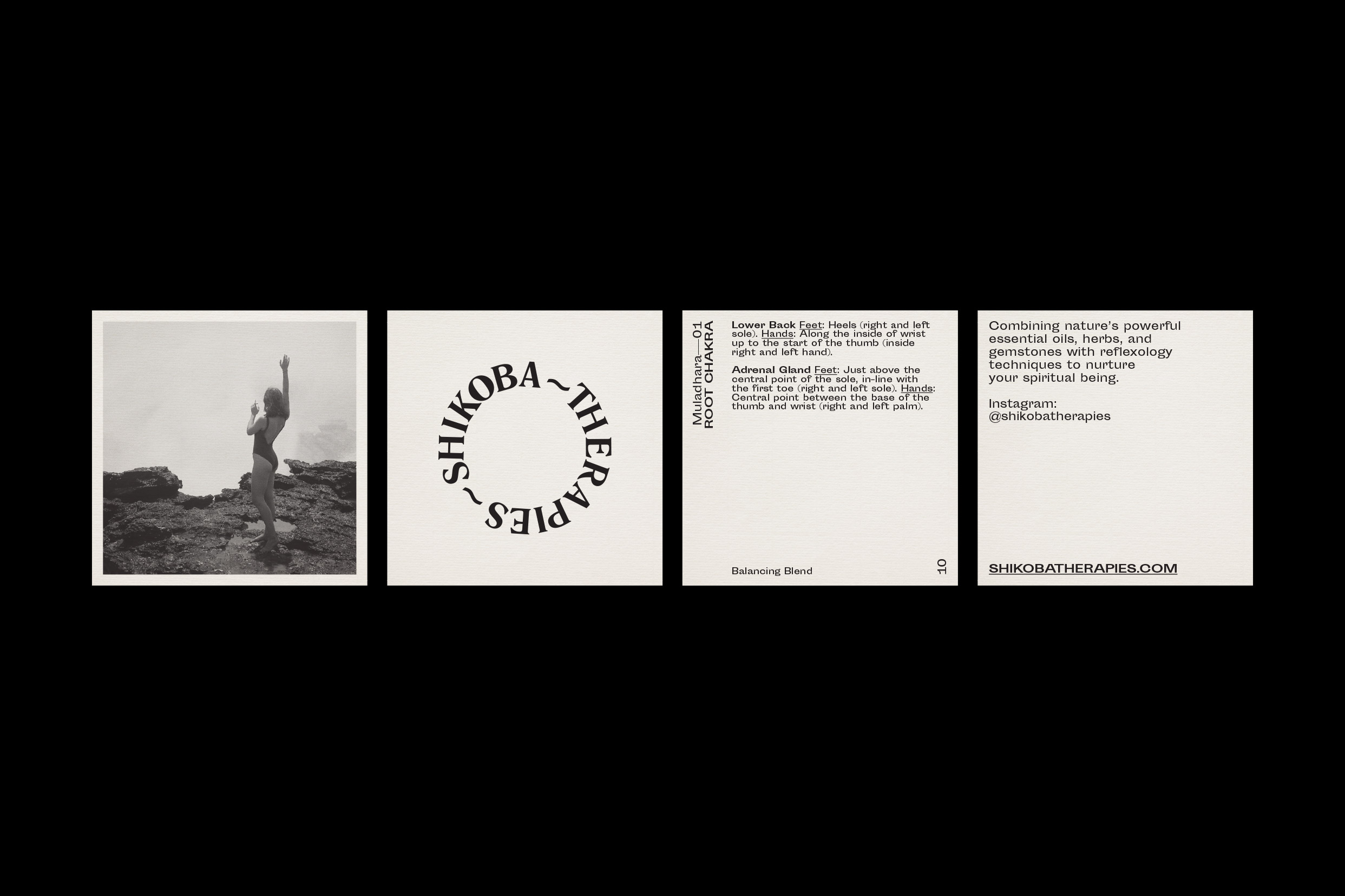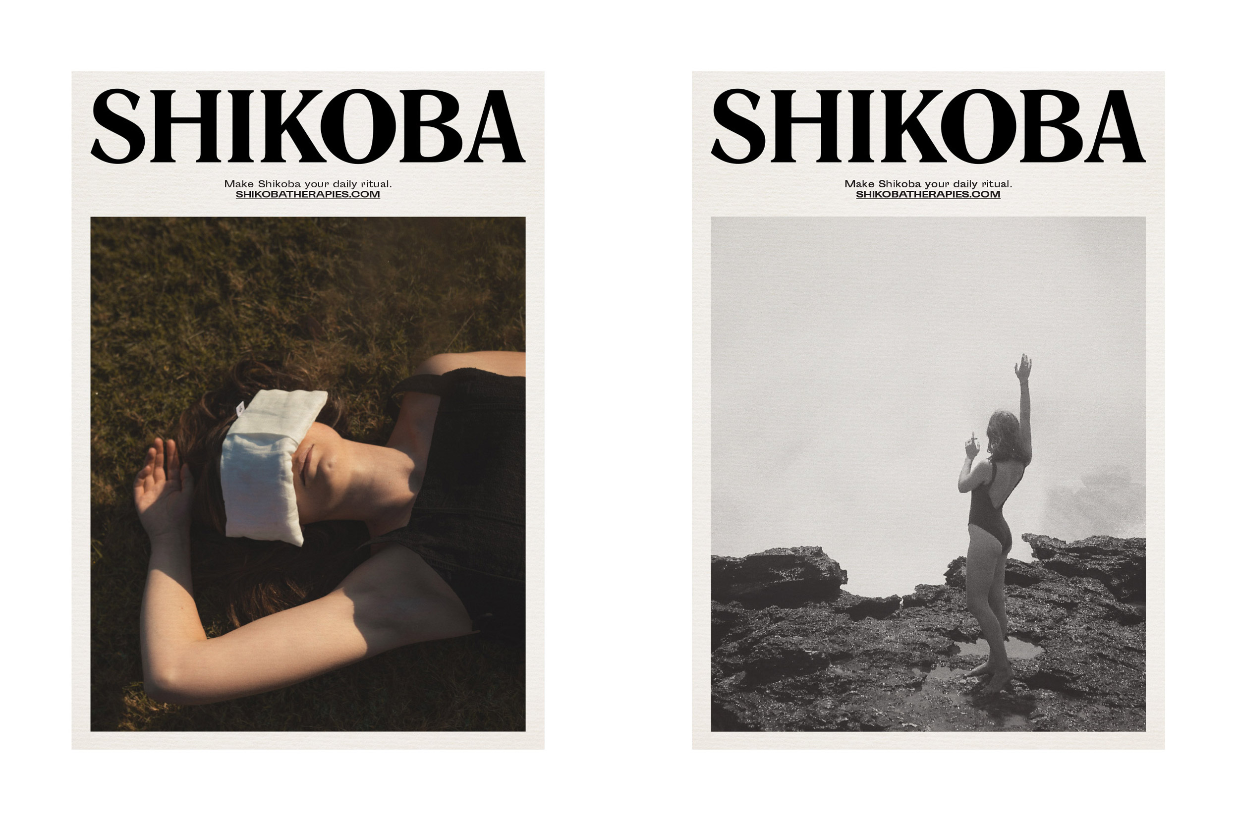 Studio Work worked closely with Shikoba Therapies to create a strategy that represented their ethos. With wellness and beauty in mind, we aimed to create an identity to attract the eye of individuals who practice self-care, ritual, and natural therapies. With a niche product and audience who practice wellness daily, it was important to look closely at where else this demographic shops and what they are attracted to. This trail of research led to us exploring outcomes, with a final execution of two typefaces, Romana for its distinctive cuts and Sporting Grotesque for its attitude and minimalist design. Art direction followed for all photographic shoots, using natural environments and candid poses of the products being used in daily life. To tie everything in primary brand colours of black and ivory deliver an effortlessly elegant aesthetic.