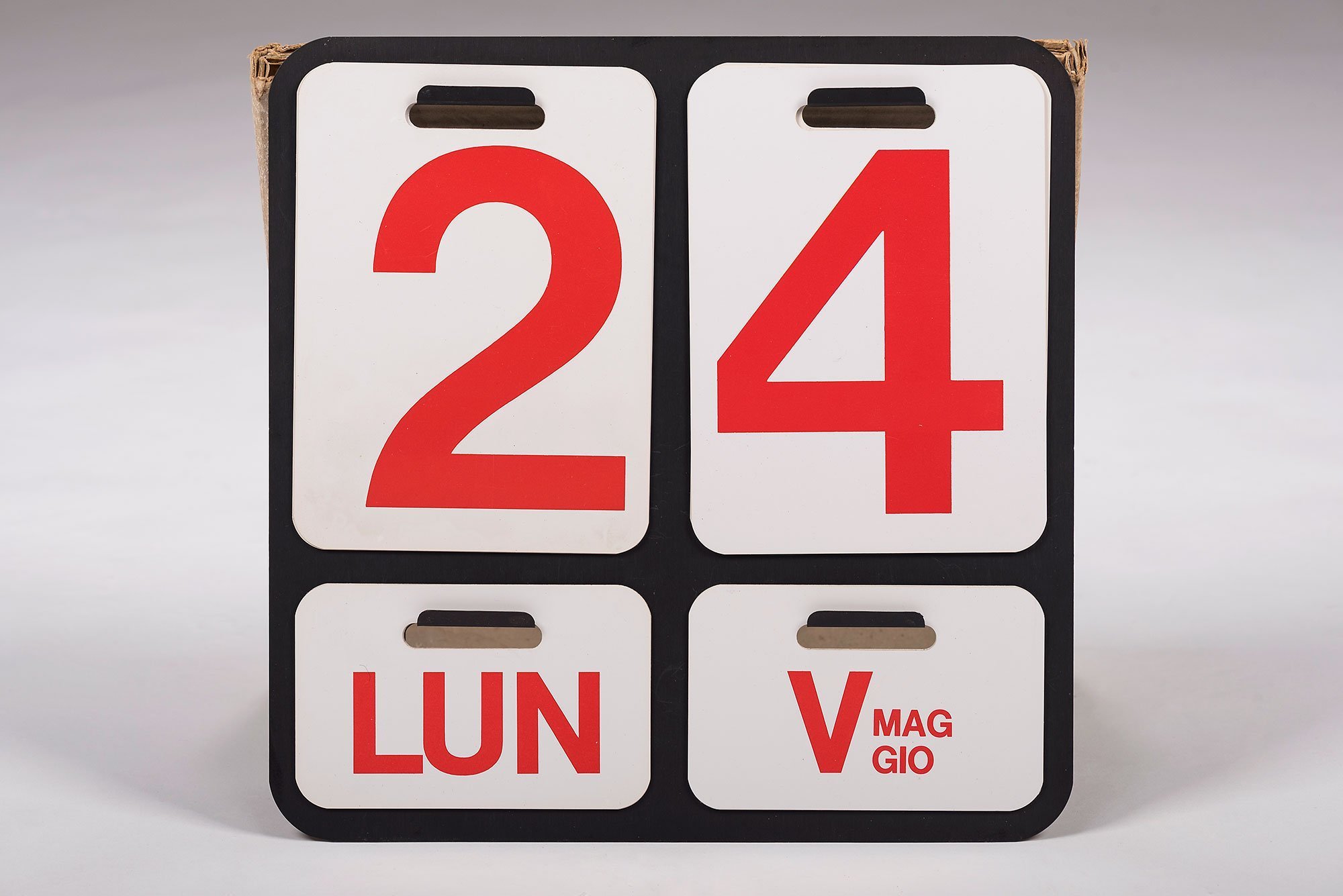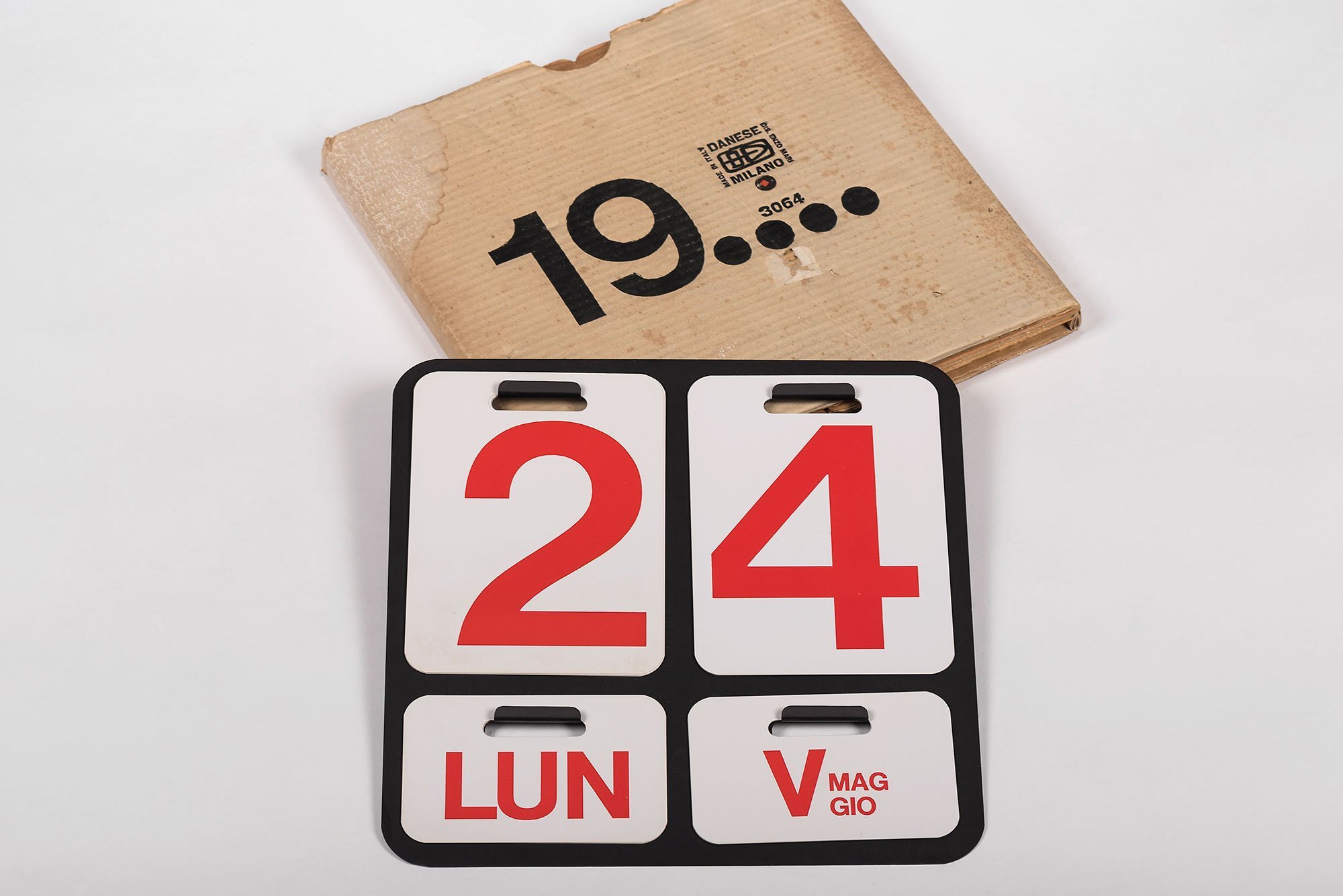 The perpetual wall calendar, one of Mari’s early successes for Formosa, was produced by Danese Milano. The calendar (12.4×12.4″) consists of an anodised aluminium back plate with protruding hooks that can be used for hanging printed PVC sheets with single numbers and abbreviated weekdays. Months are indicated with both a roman numeral and the full name set in smaller type (in Italian). All typography uses a single weight of Helvetica, using its capitals and numbers.