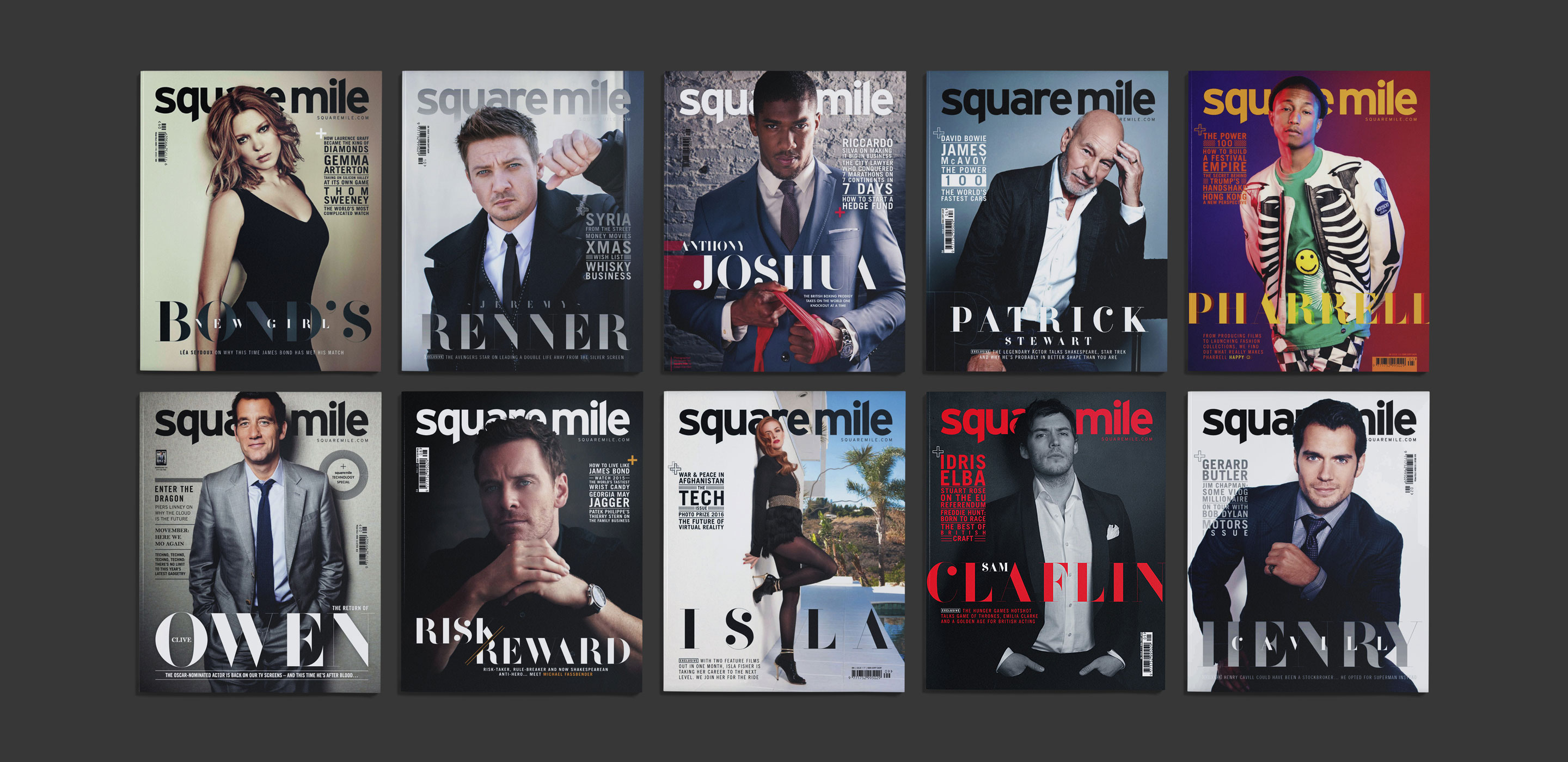 Square Mile is a luxury men’s lifestyle magazine distributed in the City, London’s financial district. It features style, celebrity interviews, cool gadgets, cars, watches and more. Square Mile magazine wanted a contemporary typeface to use on its covers and feature articles. The look and feel of the typeface needed to appeal to its target audience — mainly high-net-worth males working in the City of London.