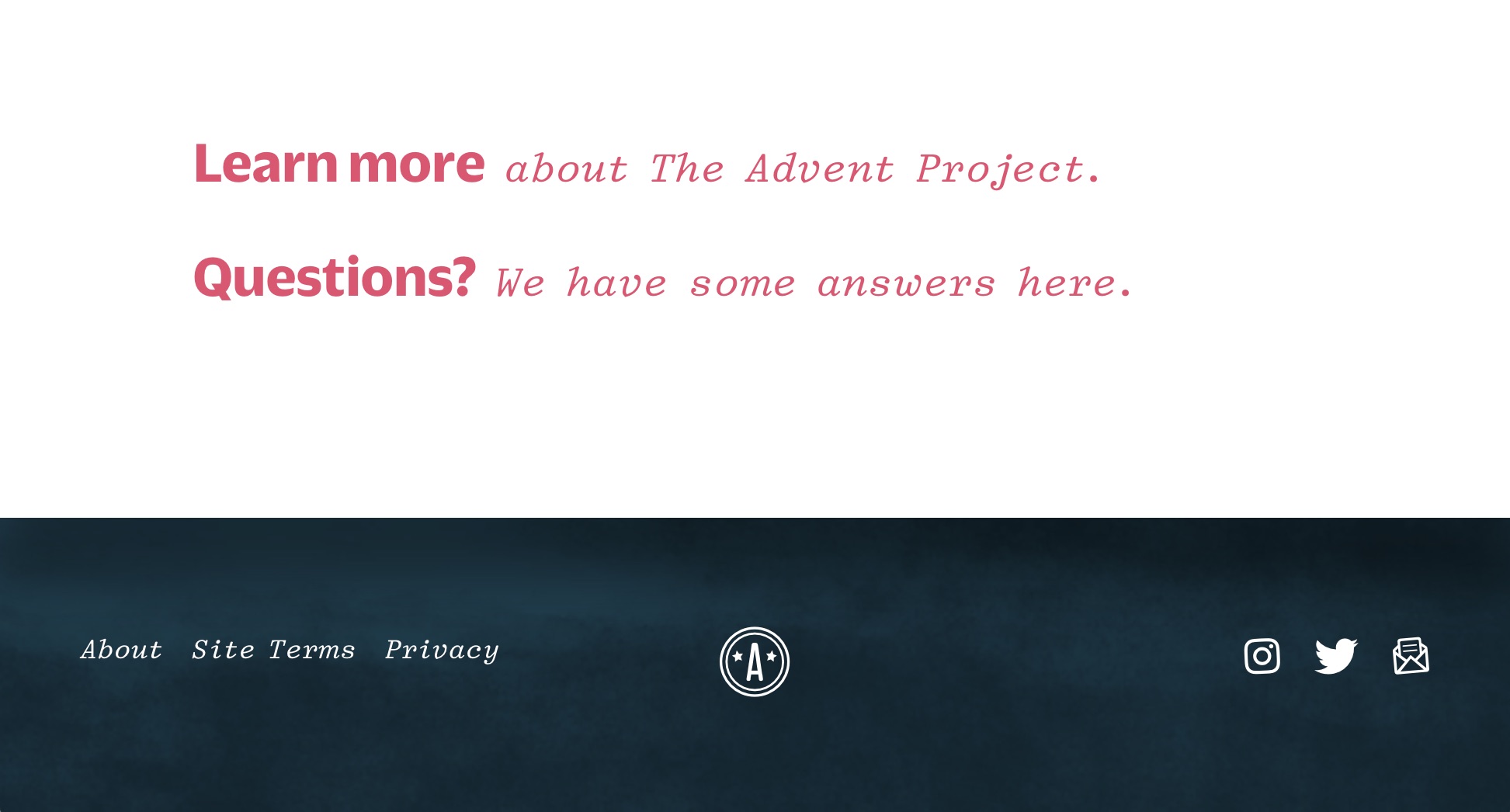 Each year’s calendar features a completely new identity and site design. Further, each of the year’s 24 artwork pages has its own color scheme, inspired by the tone and content of the piece. All of these pages are anchored by the same type — giving the site a consistent user experience, while pulling focus away from the project brand and on to the piece itself.
