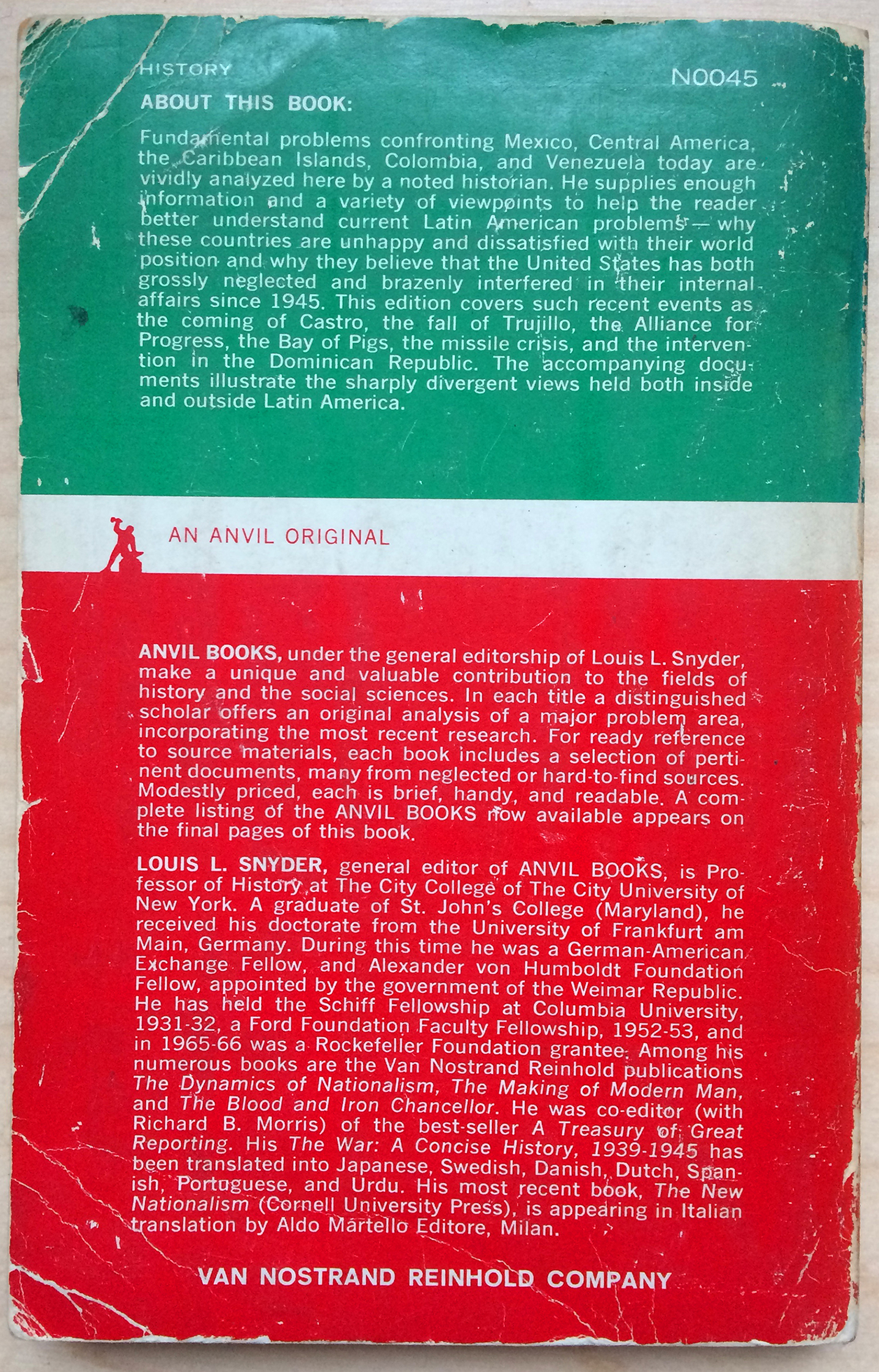 A political analysis of the current situation (as of 1967) of Latin American countries and their relation to the United States, which they feel have “both grossly neglected and brazenly interfered in their internal affairs since 1945”, written by historian Lewis Hanke of the University of California, Irvine and published through Anvil Books via Van Nostrand Reinhold Company. Sadly, many of the social and political problems covered in this over 50 year old book still seem relevant as of today.