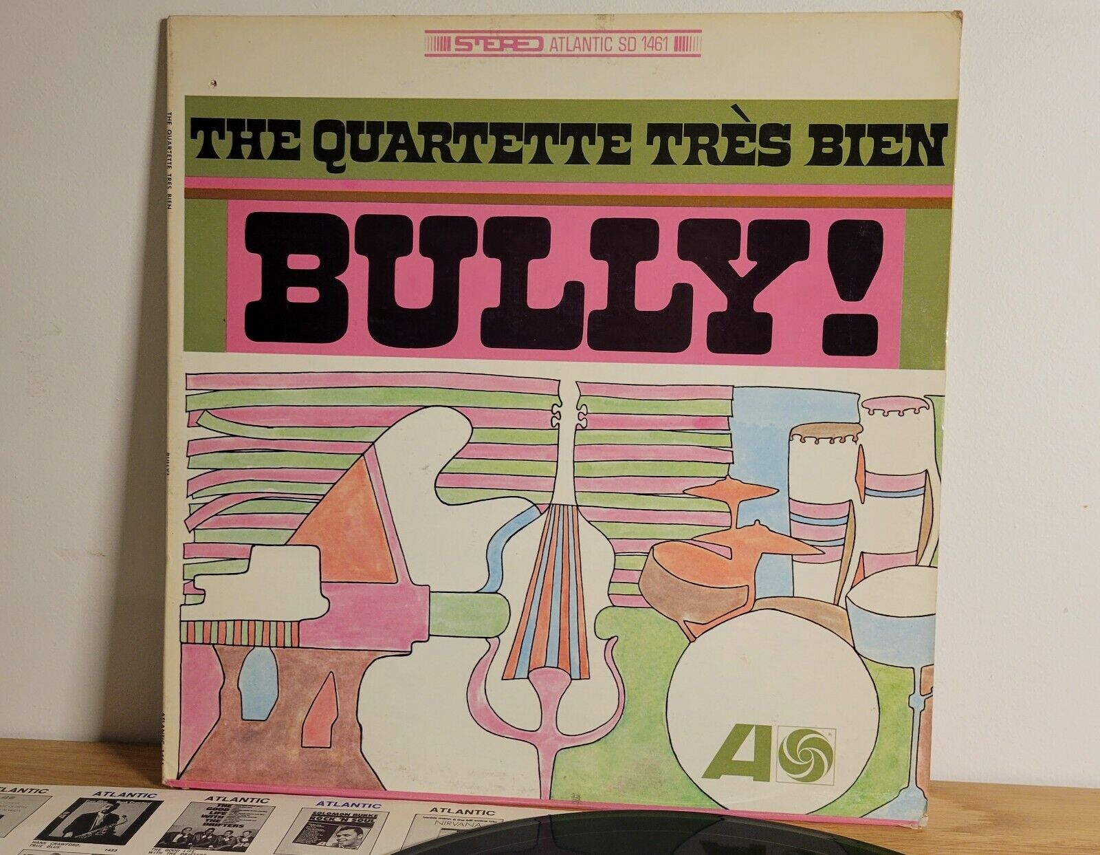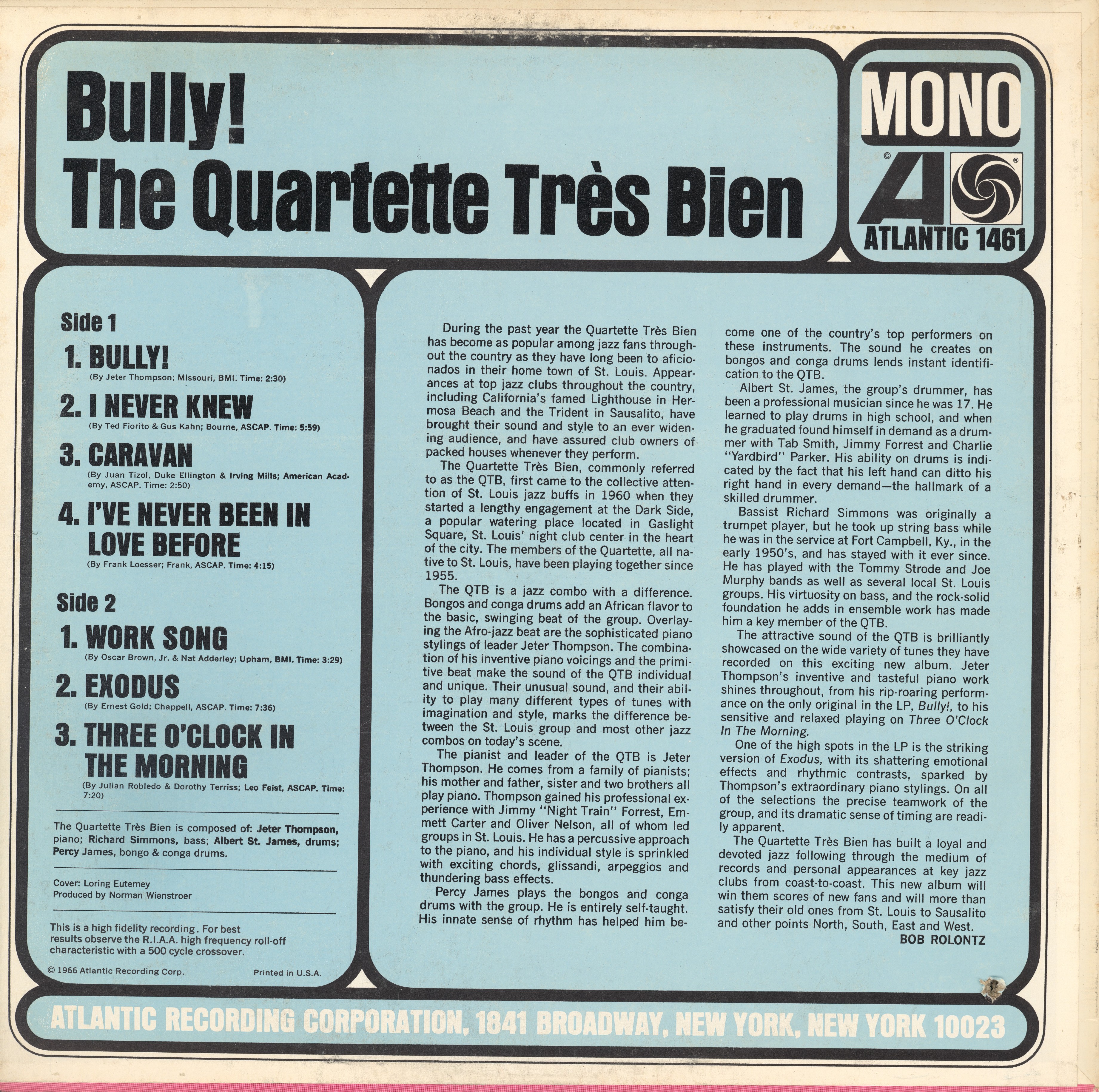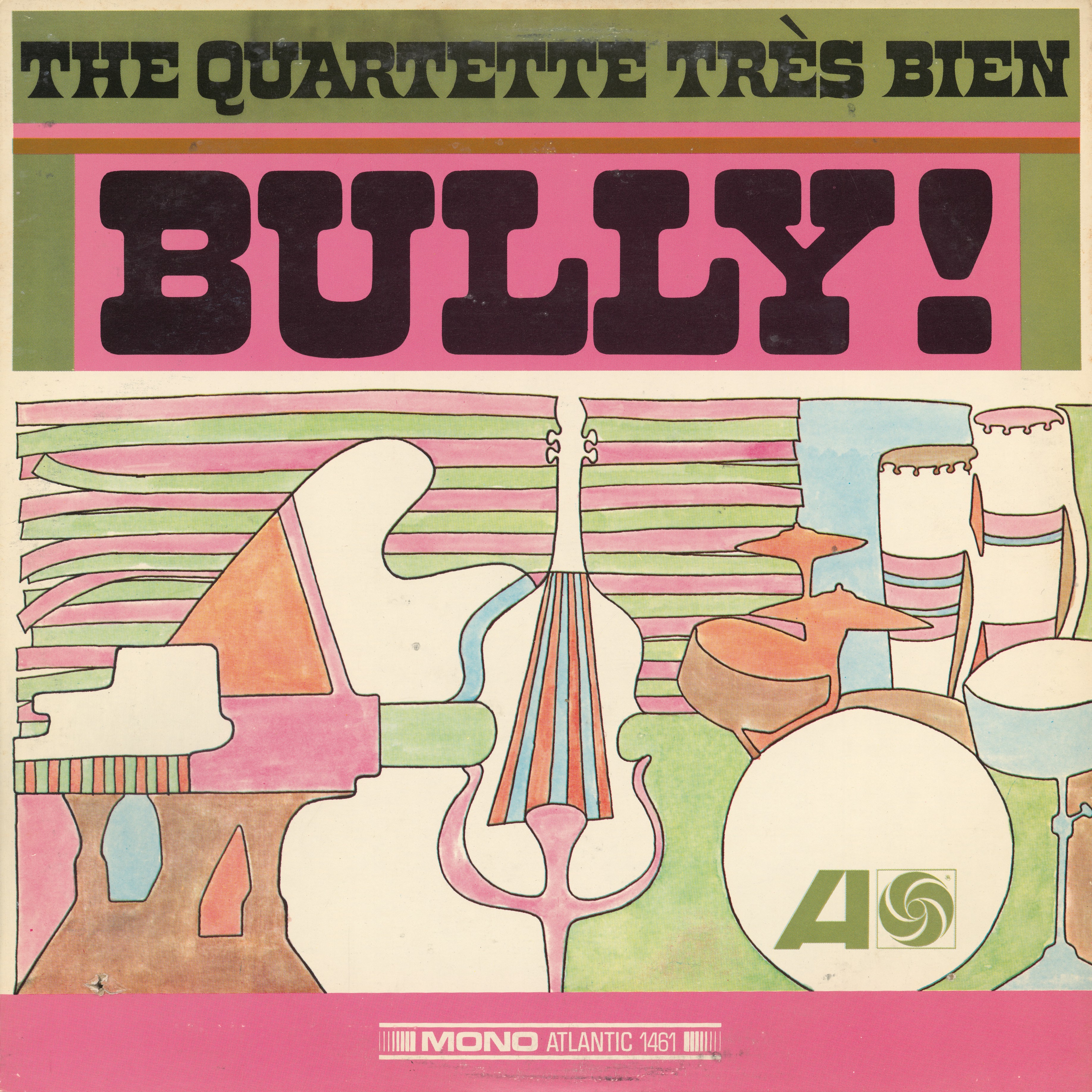 The Quartette Très Bien was a jazz combo based in St. Louis, Missouri, led by pianist Jeter Thompson (1930–2017). The cover of their 1966 album Bully! was designed by Loring Eutemey. He combined two related typefaces by the same designer: the title is in the medium width of Benguiat Buffalo. The group’s name above features Benguiat Zenedipity. Buffalo had a non-rounded companion named Serendipity. Zenedipity appears to be a spinoff of Serendipity, with flared bottom halves. Eutemey worked with both Buffalo and Zenedipity for several other record covers, too.