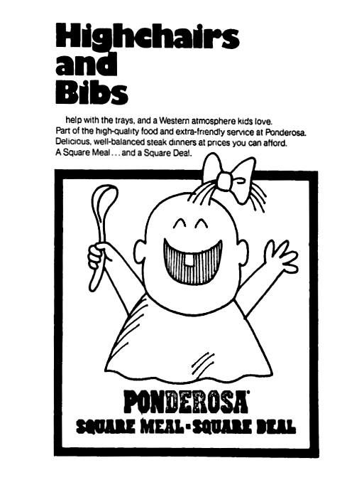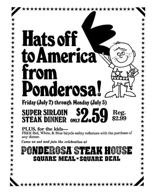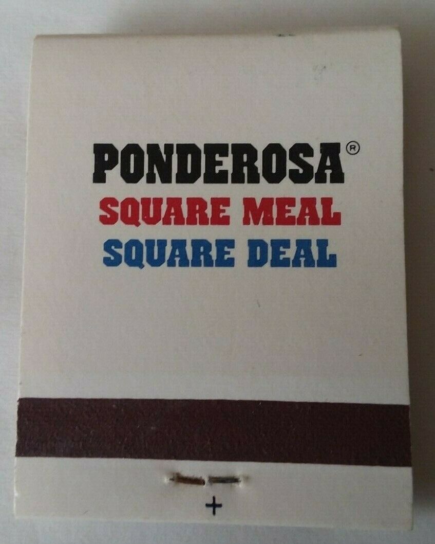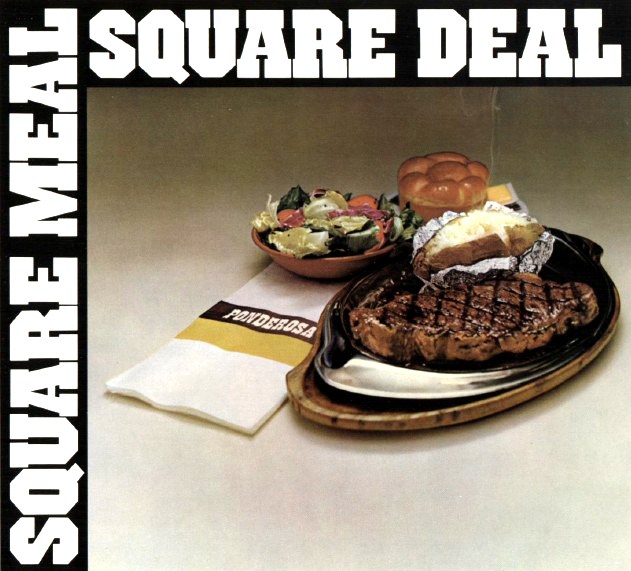 Texas-based Ponderosa Steak Houses have had a variety of logos since their founding in 1959. From 1975 to 1977, the logo was set in Frank Bartuska’s Bartuska Satanic at certain restaurants in the chain. This includes the slogan, “Square Meal Square Deal”.
