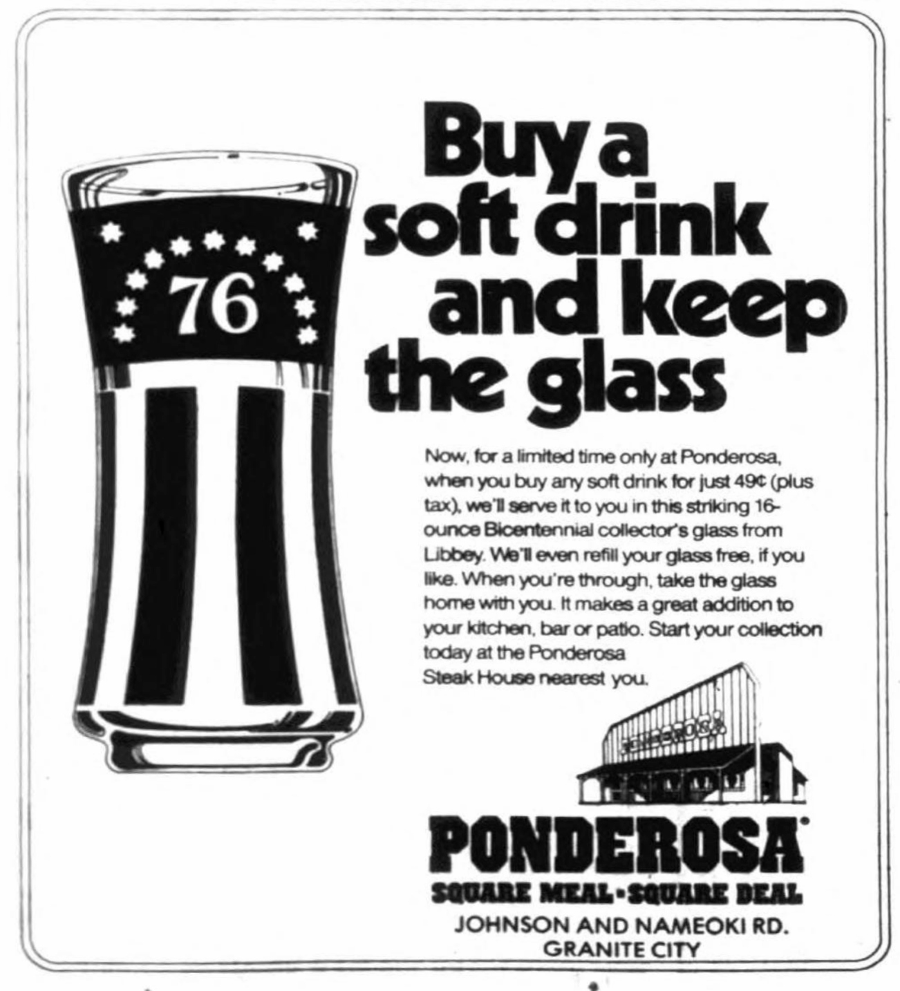 “Buy a soft drink and keep the glass” newspaper ad, June 1976, ft. Kabel Black