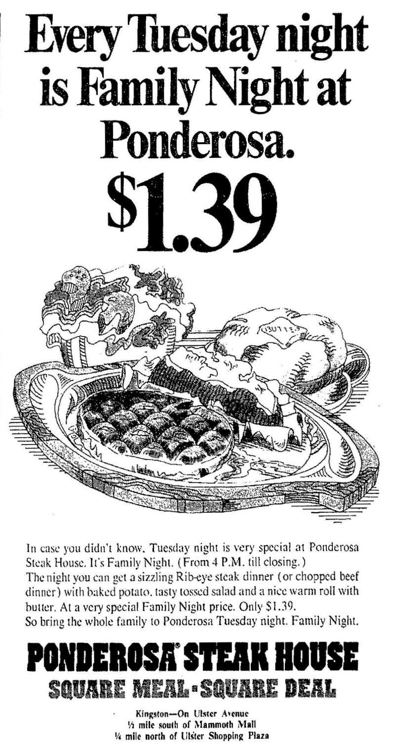 “Tuesday Family Night” newspaper ad, 1975, ft. Gill Kayo and Helvetica Condensed