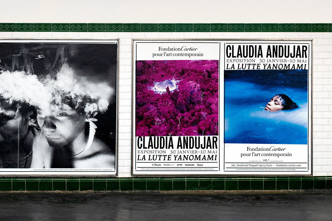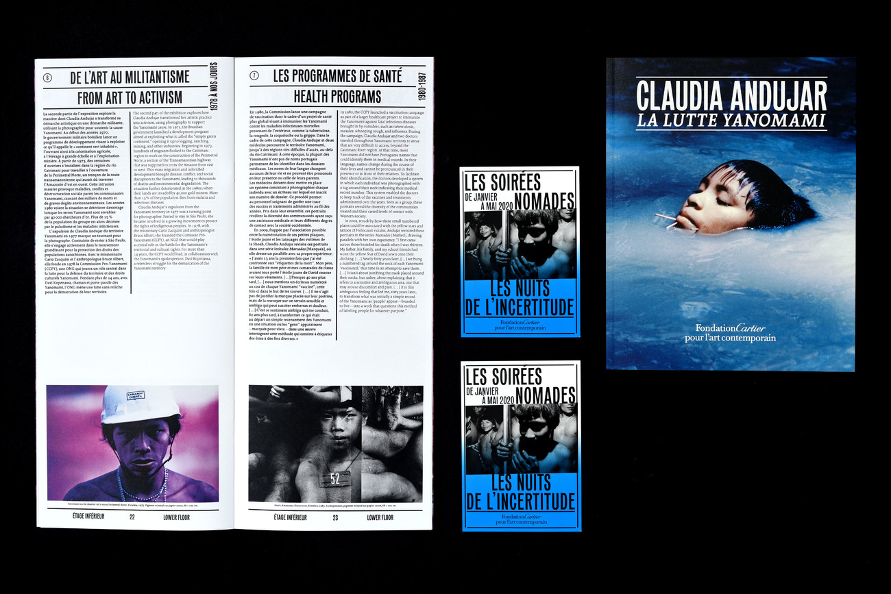 Pursuing their collaboration with the museum, design studio deValence was in charge of the visual identity of the exhibition. It’s characterized by the use of Mars Condensed from Production Type, which is present in all media to catch the eye. In fact, the vertical lines of the condensed typeface appear almost as stripes, contrasting on the posters with the bright-colored homogenous photographs. The letters somehow evoke the verticality of the Amazon forest in which the Yanomami live, an impression that’s reinforced by the exhibition’s scenography, with the walls painted in green. However, the effect of Mars Condensed on the viewer is not one of natural serenity: It rather is imposant, visible, urgent – very much like the recognition the Yanomami have been fighting for, for so long. Through the use of Mars Condensed, deValence succeeded in visually transmitting the dedication of Claudia Andujar to her cause.