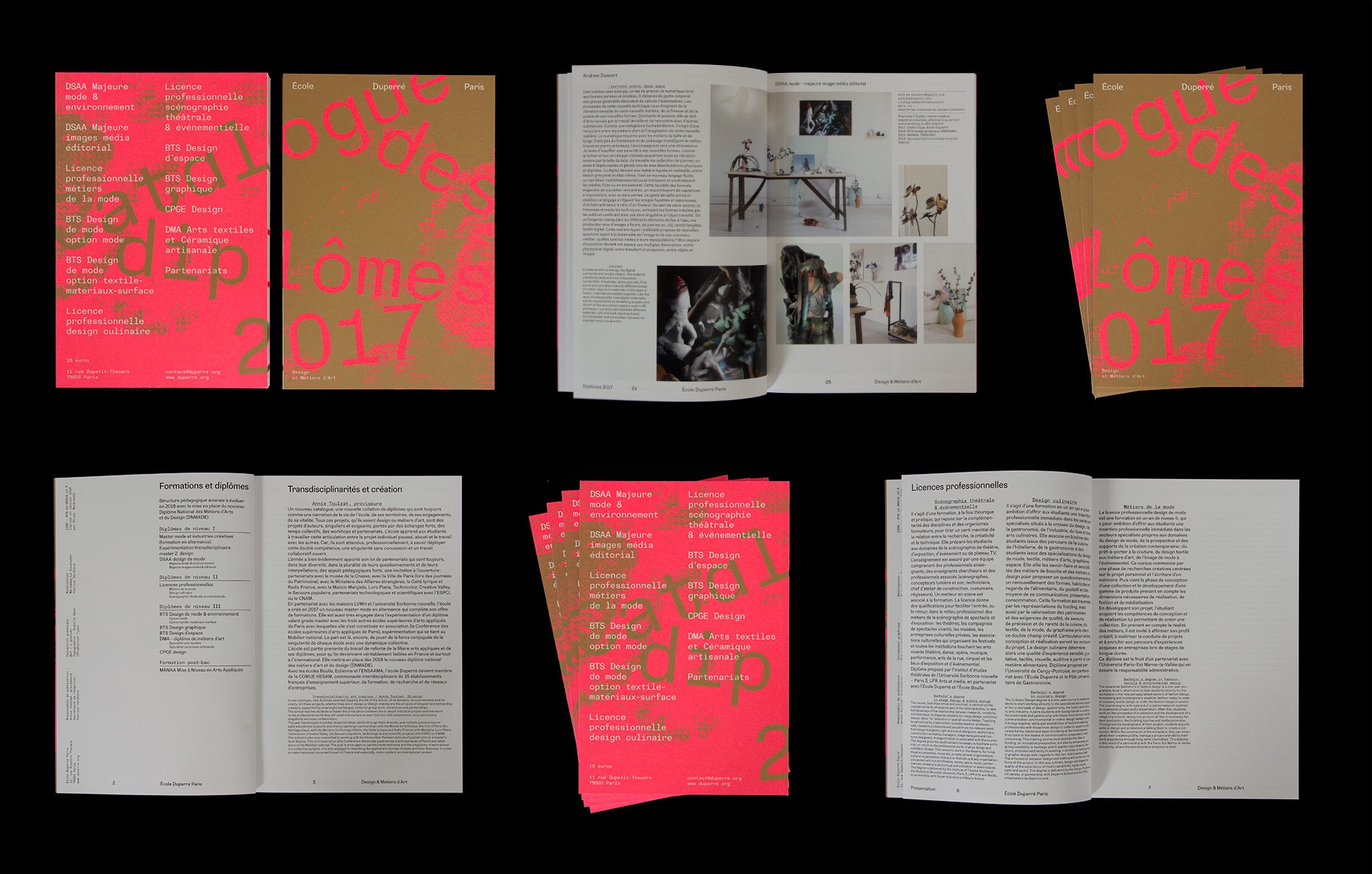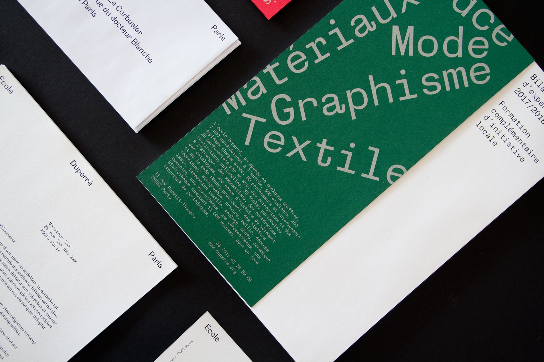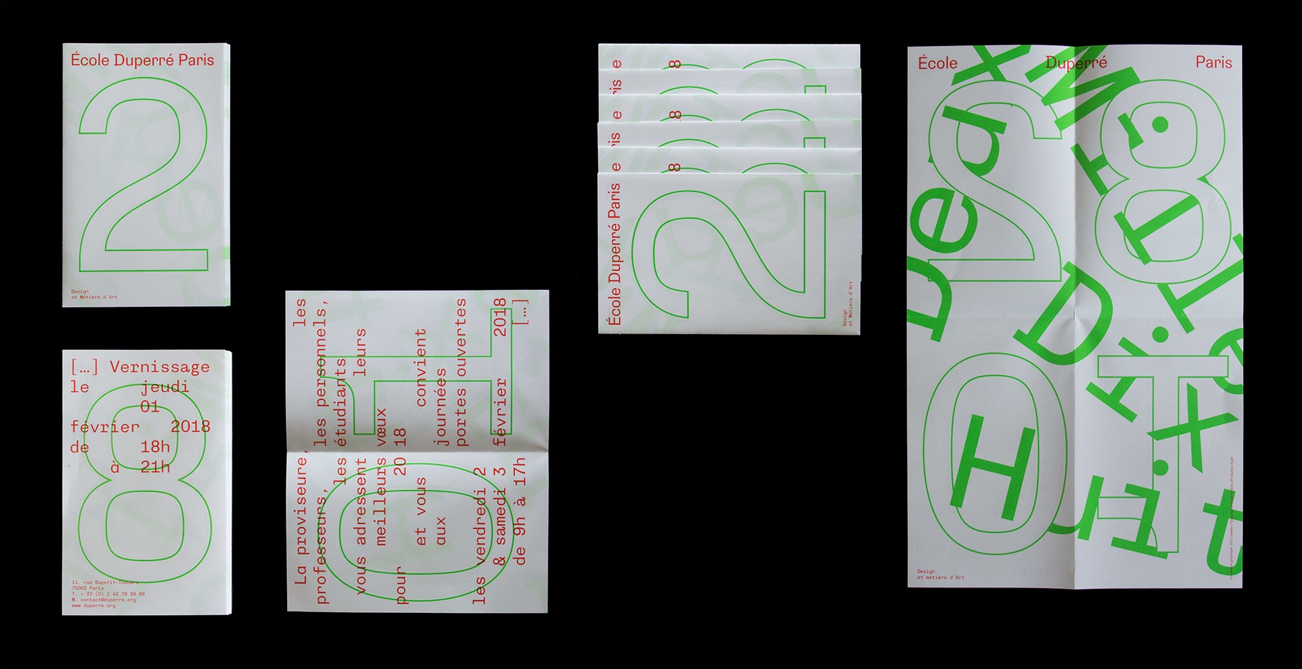 Duperré Sans is a stable yet quirky font family, composed of a regular version – in two weights and an italic – and a monospaced one, Duperré Courrier. This setup led to a playful identity, where the monospaced style is used for display and the proportonially spaced ones whenever the focus is more on text. The choice of a monospace is rather appropriate for a school with a technical legacy: the location at rue Dupetit-Thouars in the third arrondissement used to host the first school ever to offer courses in “esthétique industrielle” (the French equivalent of industrial design) in Paris. Moreover, monospaced fonts tend to be used in art publications, as a reminder of conceptual art’s esthetics of the 60s, showing typewritten statements. The identity created by Passages and Production Type is an update to this technical and artistic legacy. The Duperré typeface shows some characteristics of grotesque typefaces, evading the trap of historicity by mixing the references. On the other hand, the graphic design is versatile, and doesn’t play by the rules for what the corporate identity of an art school should look like: in each instance, the publications offer a different view of the school. The use of neon and bright colors make it dynamic, lively, reflecting the creativity that we expect from art students.