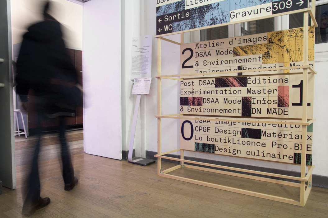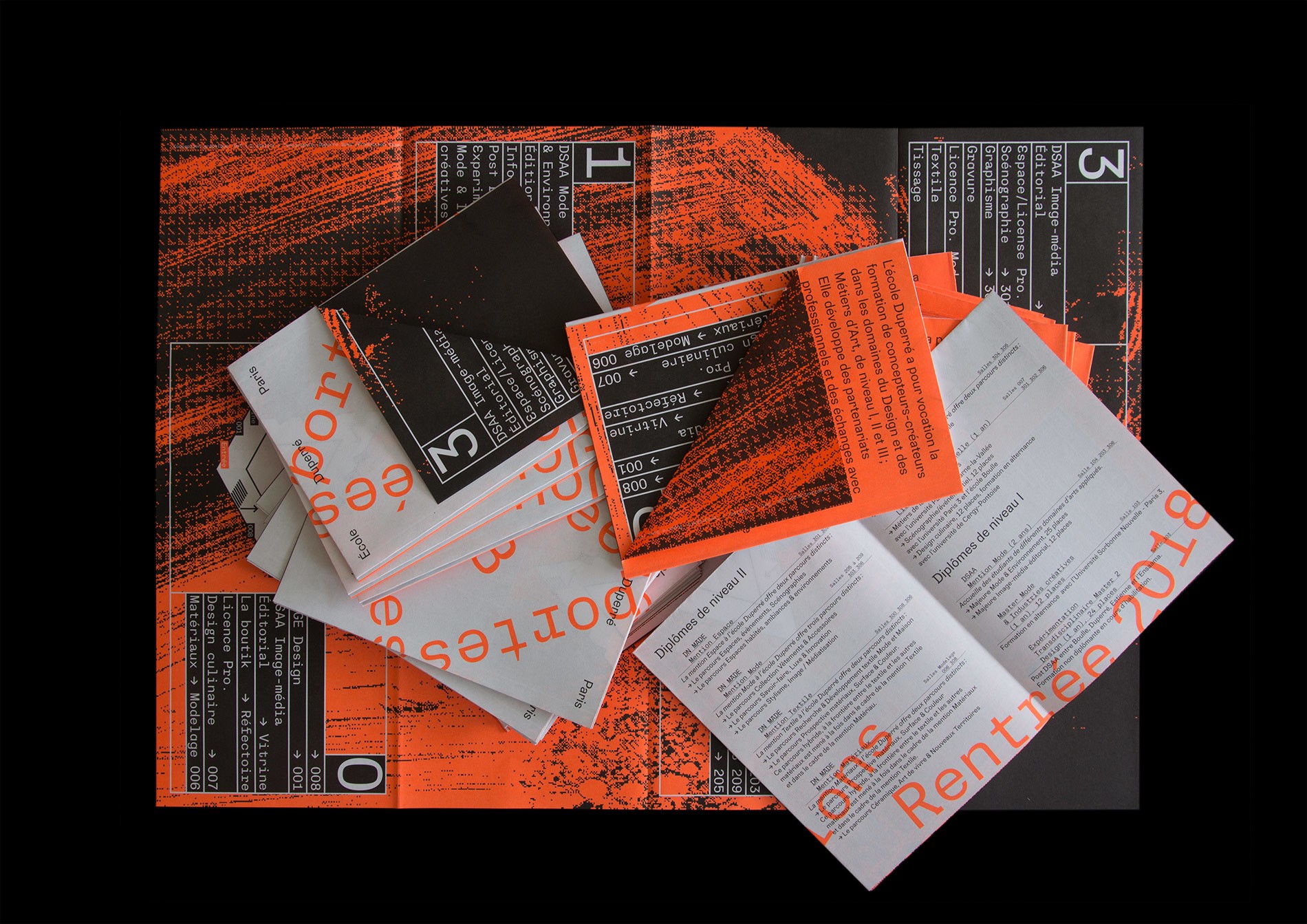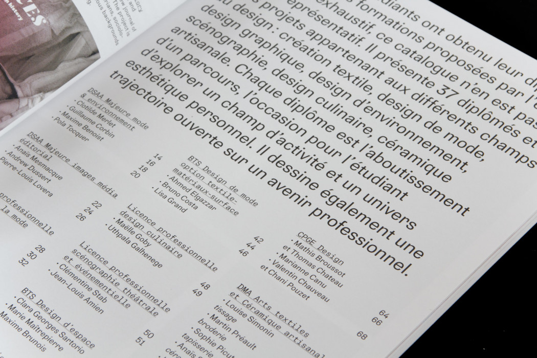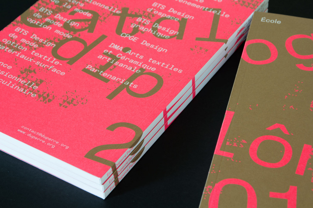 Duperré Sans is a stable yet quirky font family, composed of a regular version – in two weights and an italic – and a monospaced one, Duperré Courrier. This setup led to a playful identity, where the monospaced style is used for display and the proportonially spaced ones whenever the focus is more on text. The choice of a monospace is rather appropriate for a school with a technical legacy: the location at rue Dupetit-Thouars in the third arrondissement used to host the first school ever to offer courses in “esthétique industrielle” (the French equivalent of industrial design) in Paris. Moreover, monospaced fonts tend to be used in art publications, as a reminder of conceptual art’s esthetics of the 60s, showing typewritten statements. The identity created by Passages and Production Type is an update to this technical and artistic legacy. The Duperré typeface shows some characteristics of grotesque typefaces, evading the trap of historicity by mixing the references. On the other hand, the graphic design is versatile, and doesn’t play by the rules for what the corporate identity of an art school should look like: in each instance, the publications offer a different view of the school. The use of neon and bright colors make it dynamic, lively, reflecting the creativity that we expect from art students.