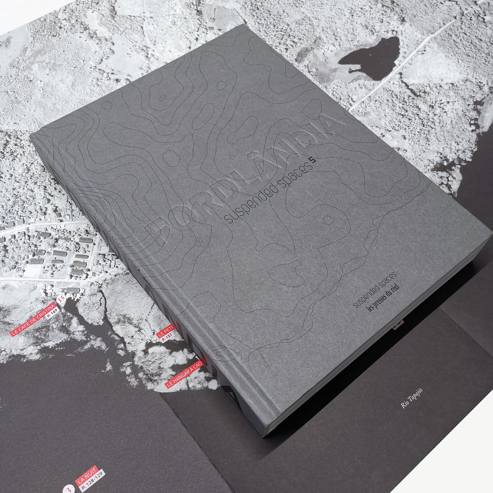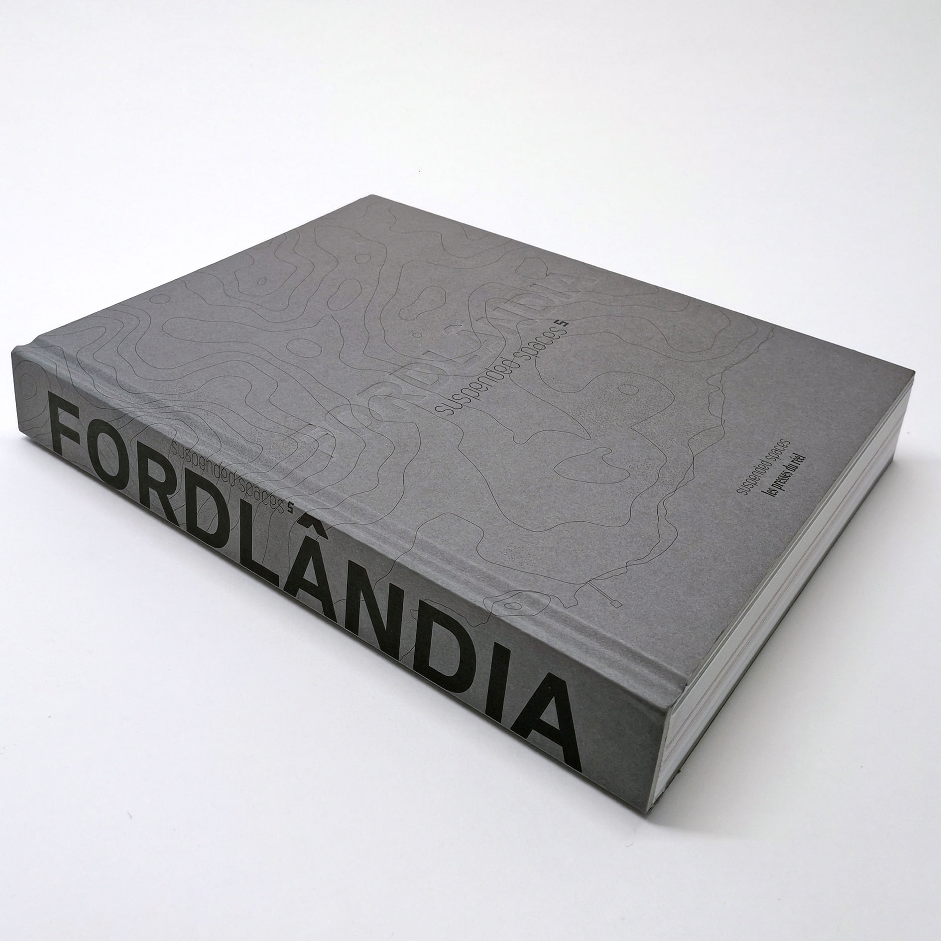 The title as seen on the cover and on the huge spine of the book is set in Boreal from Production Type, a choice by designer Jean-Claude Chianale. On the spine, Boreal takes the whole space – a visual metaphor for how Ford tried to settle and take advantage of a territory. On the cover, the roles change: the title is blind-embossed into the cover and disappears into the drawing of the map – the territory is taking over. Boreal is a “neutral”, highly legible font, convenient for corporate identity, administrative uses, etc.; here we see how it can evoke industrial and technical worlds, contrasting with the serpentine isolines of the wild untamable territory.