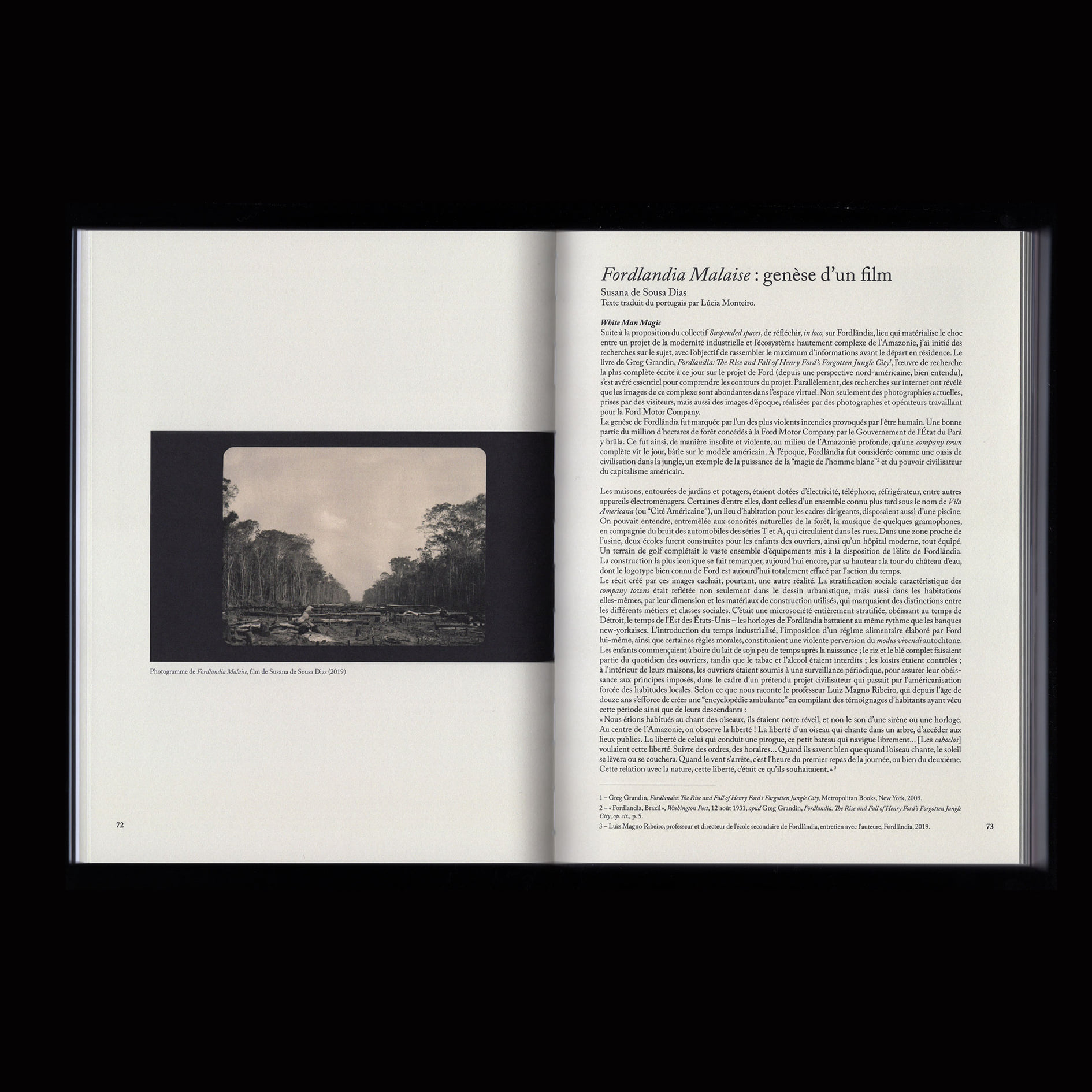 The interior of the bilingual publication (Portuguese and French) is set in Adobe Caslon. Fordlândia was published by Les Presses du Réel in October 2020 as Suspended spaces #05.