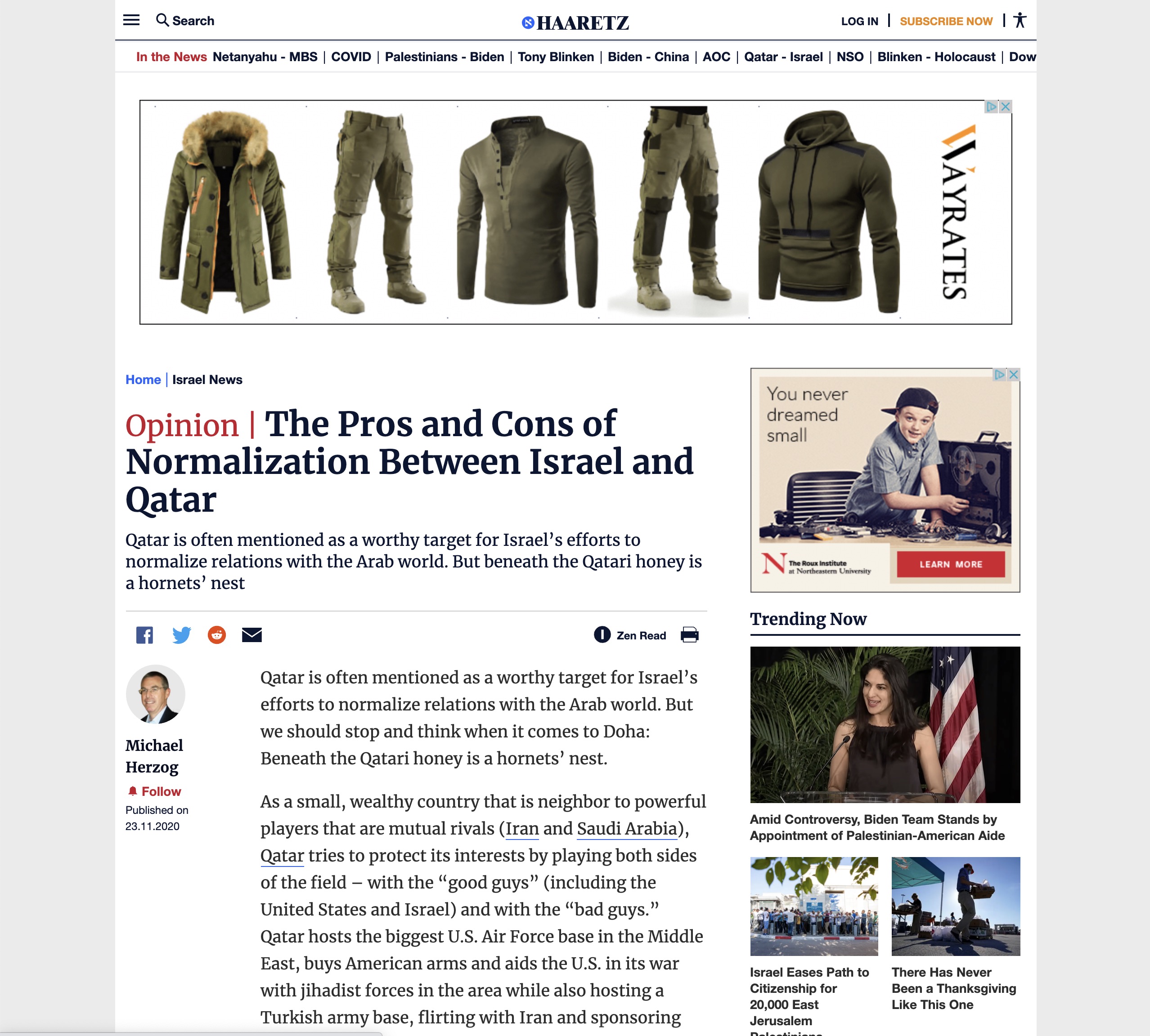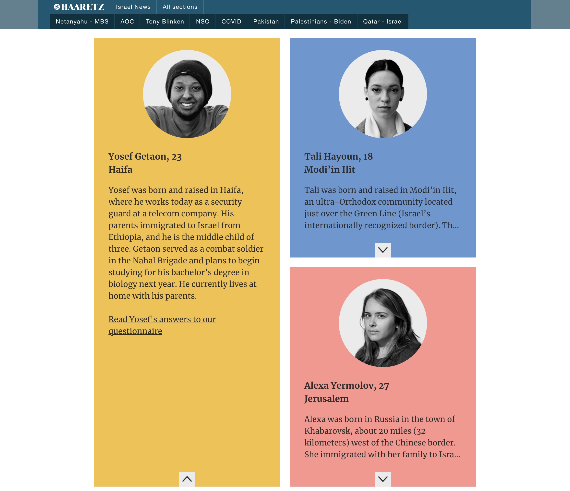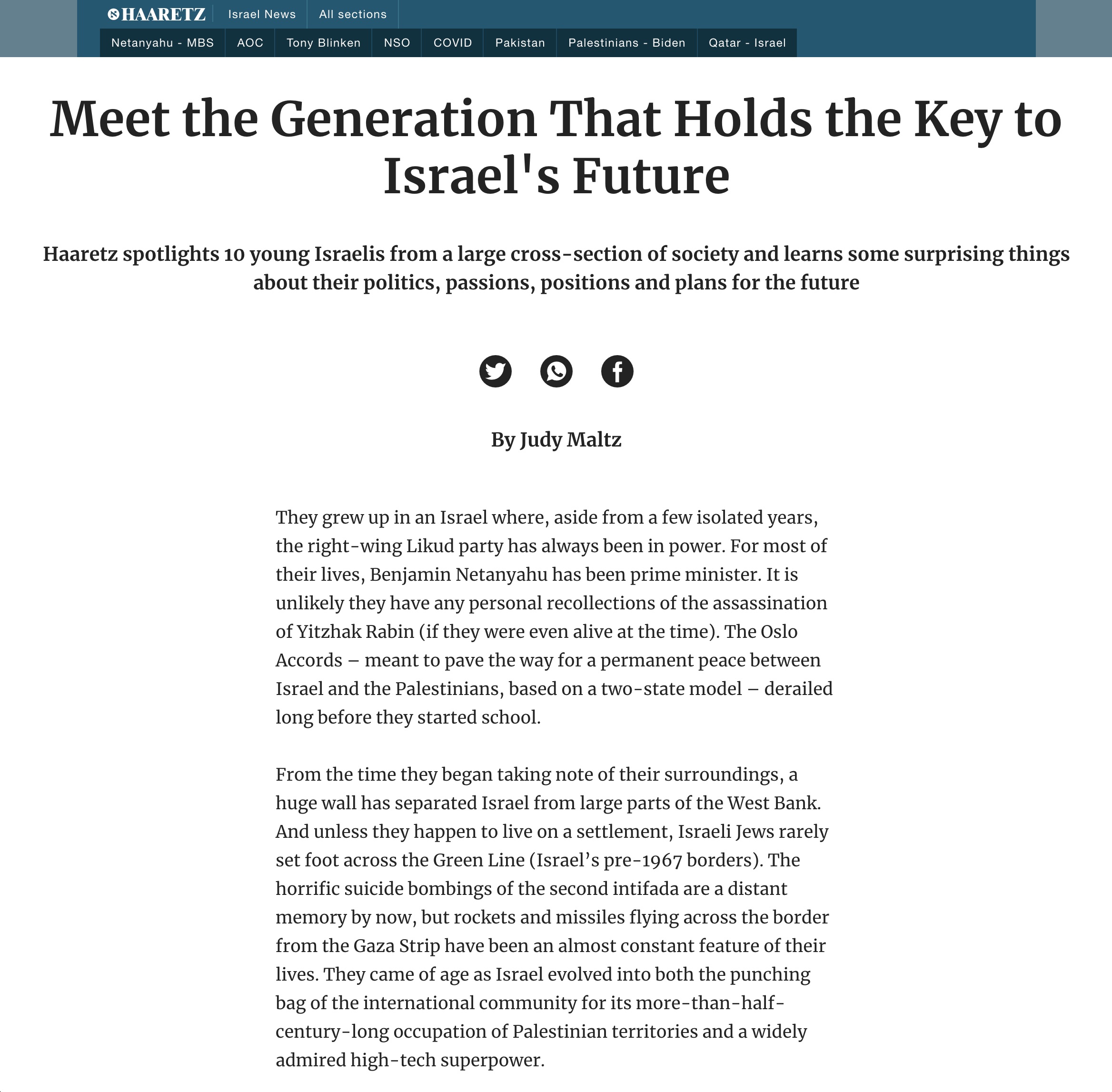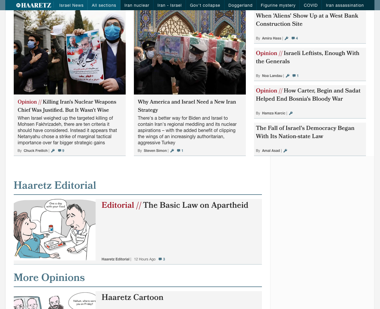 Haaretz.com is the international online edition of the Haaretz newspaper from Israel. It uses a range of typefaces including Merriweather. Merriweather tends to be used in full articles rather than in lists of articles and is used in special or featured content. It appears in several weights and is paired with the sans-serif Neue Helvetica (or Arial in some environments). Other typefaces used include Open Sans and Bookmania as well as Roboto (not pictured here).