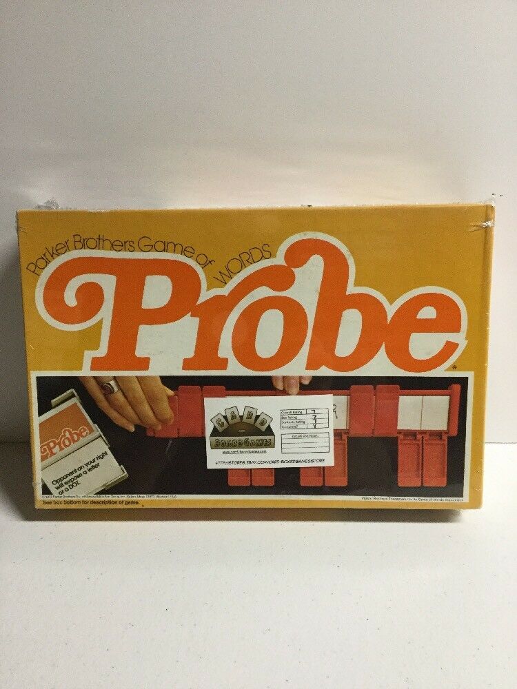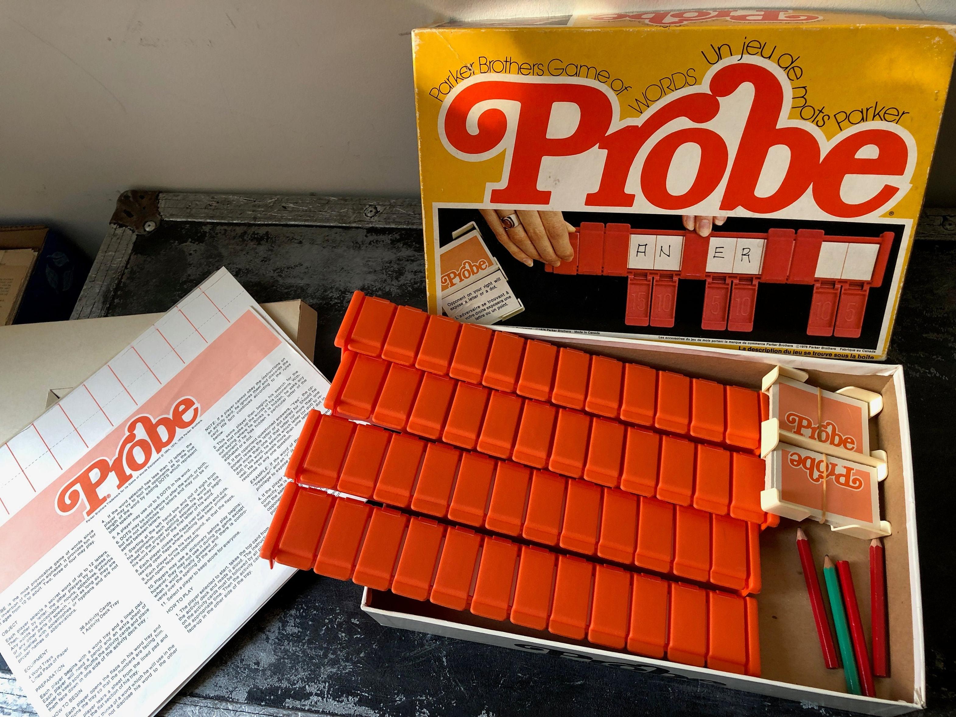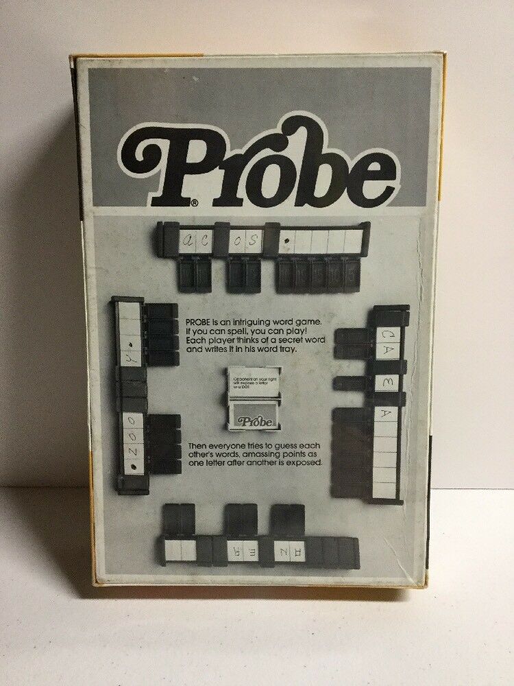 Probe is a board game for 1–4 players, “introduced in the 1960s by Parker Brothers. It is reminiscent of the simple two-person game Hangman, whose object is to guess a word chosen by another player by revealing specific letters. Probe […] introduces additional game elements that increase the levels of both skill and chance. Like Hangman, each player has a secret chosen word. But unlike Hangman, the game ends when the last word, not the first word, is revealed. All players remain in the game until the end. It was created by Ted Leavitt and licensed by him to Parker Brothers.” [Wikipedia]