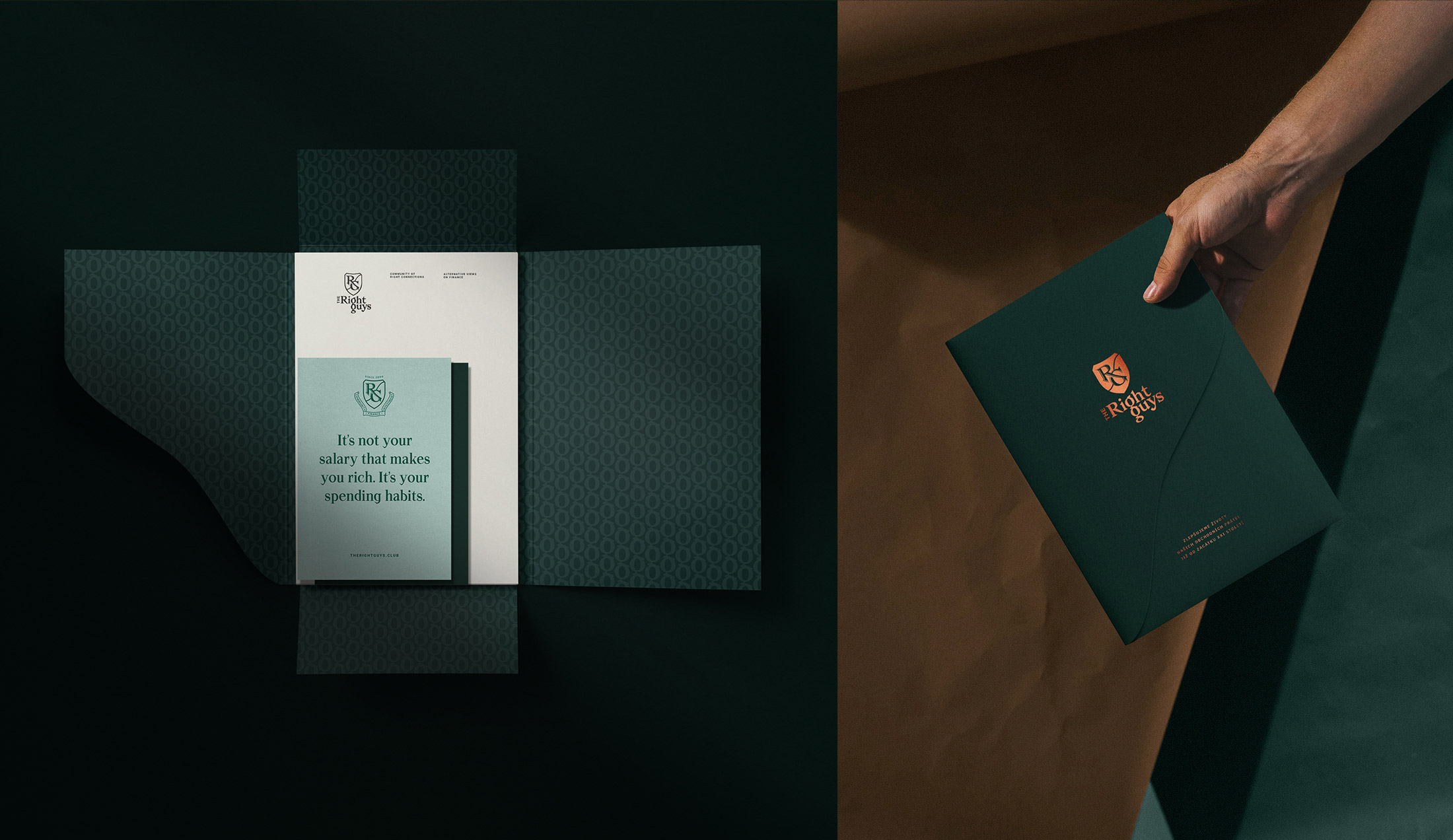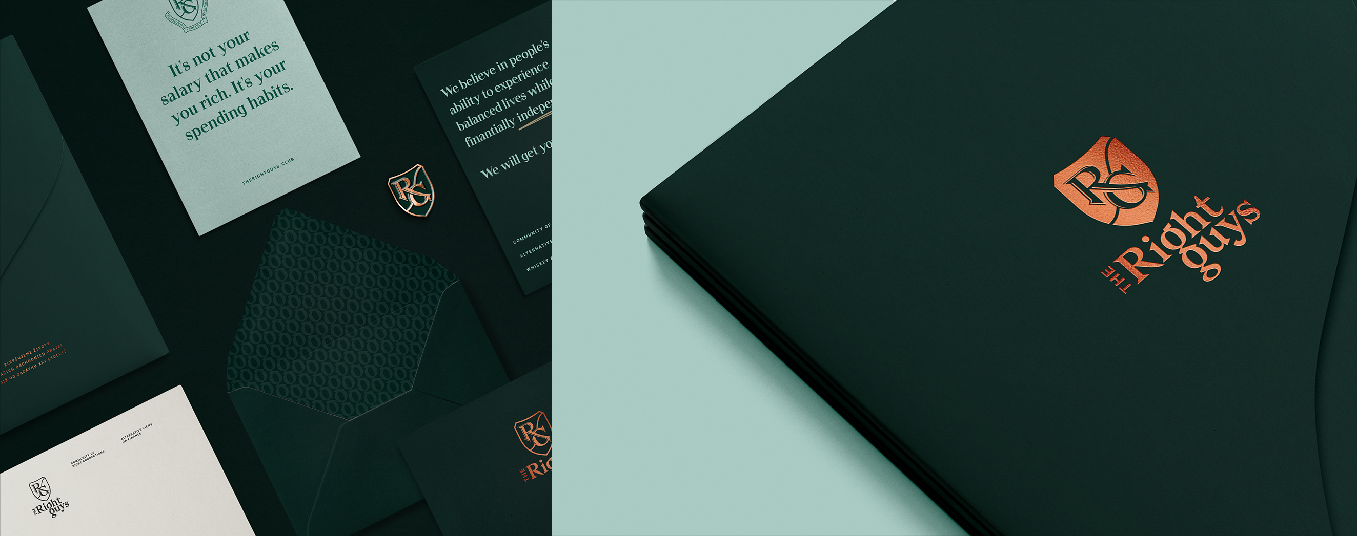 The Right Guys are a group of financial specialists, consultants and investment experts based in Prague. For their branding, we used Apoc as an interesting typeface that held that majestic feel, while looking modern and playful. The logo has been created with Bagnard. Two of its beautiful letters g create an interlinear ligature and a brand symbol – a chain of connections, which then ended up worming a brand pattern used on stationery, club jackets and handkerchiefs. Loosely spaced capitals of Roboto are used in small sizes for the logo and additional information.