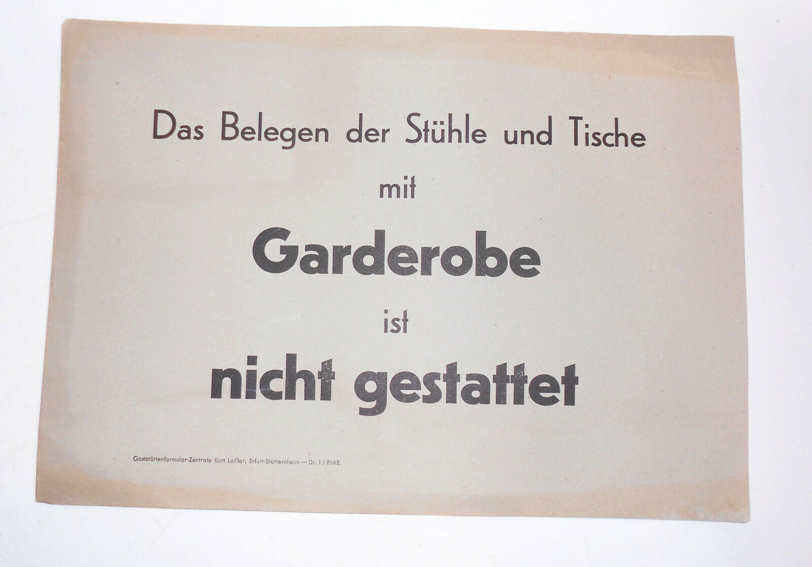 The more concise variant “Das Belegen der Stühle und Tische mit Garderobe ist nicht gestattet” (“It is not permitted to occupy the chairs and tables with clothes”) features the most modern type: This sign is set in two weights from Erbar-Grotesk (1926). It includes a credit that reads “Gaststättenformular-Zentrale Kurt Leffler, Erfurt-Stotternheim — Dr1 / PhKE”. The latter abbreviation stands for Druckerei Philipp Kühner Eisenach. Its inclusion suggests that at least this sign was produced at a later date. Such printer identification codes were introduced in the GDR in 1951.