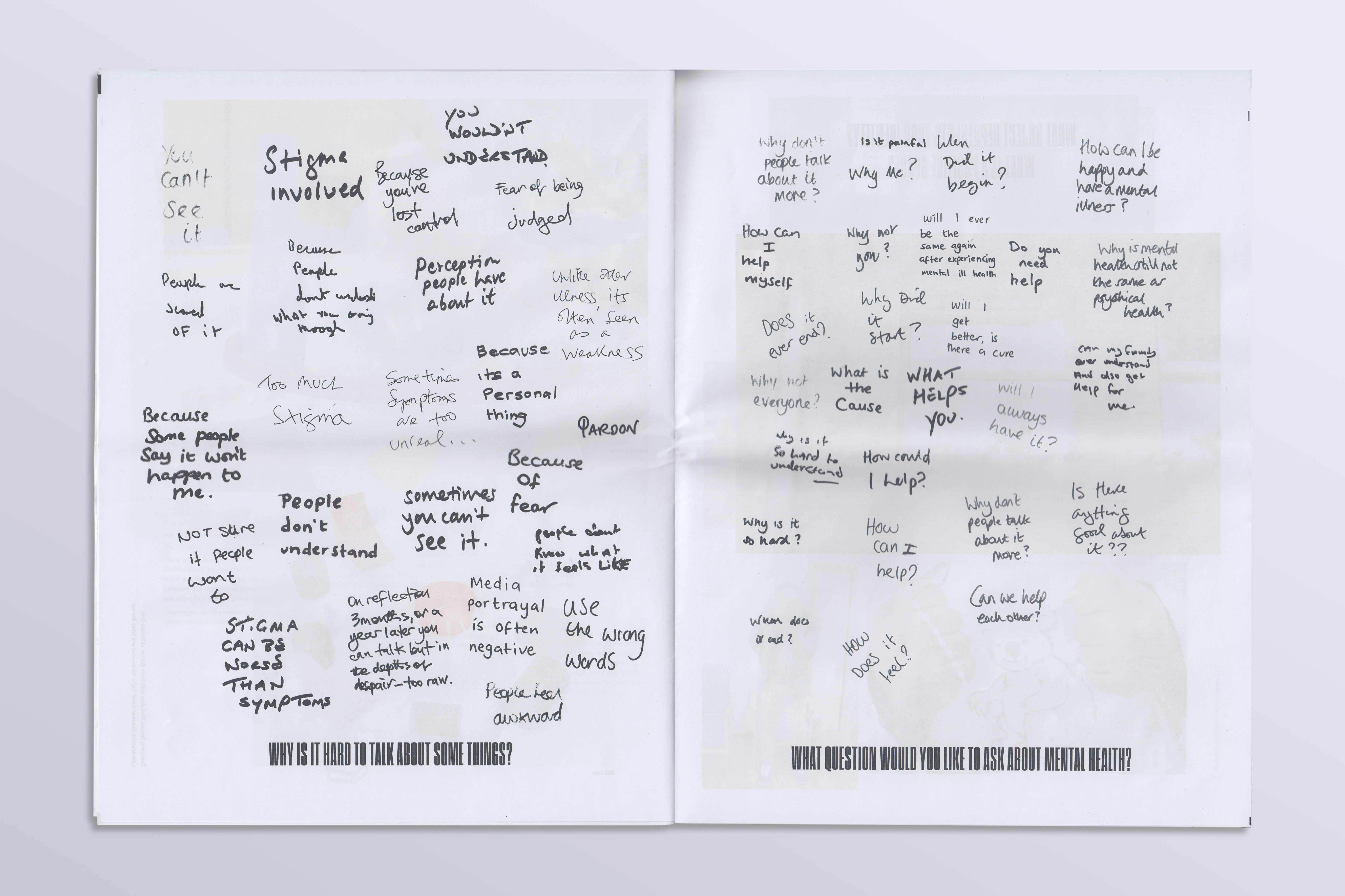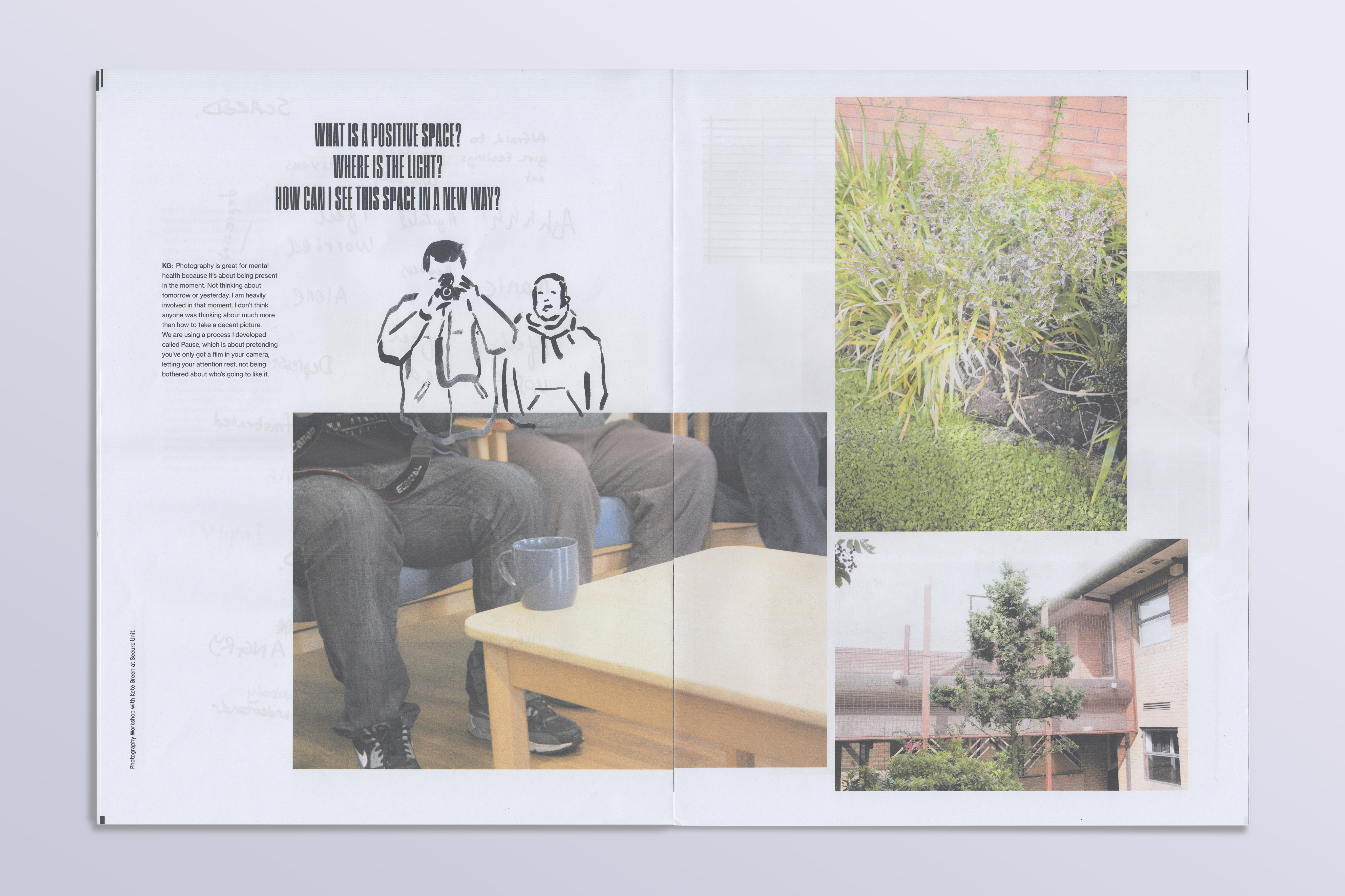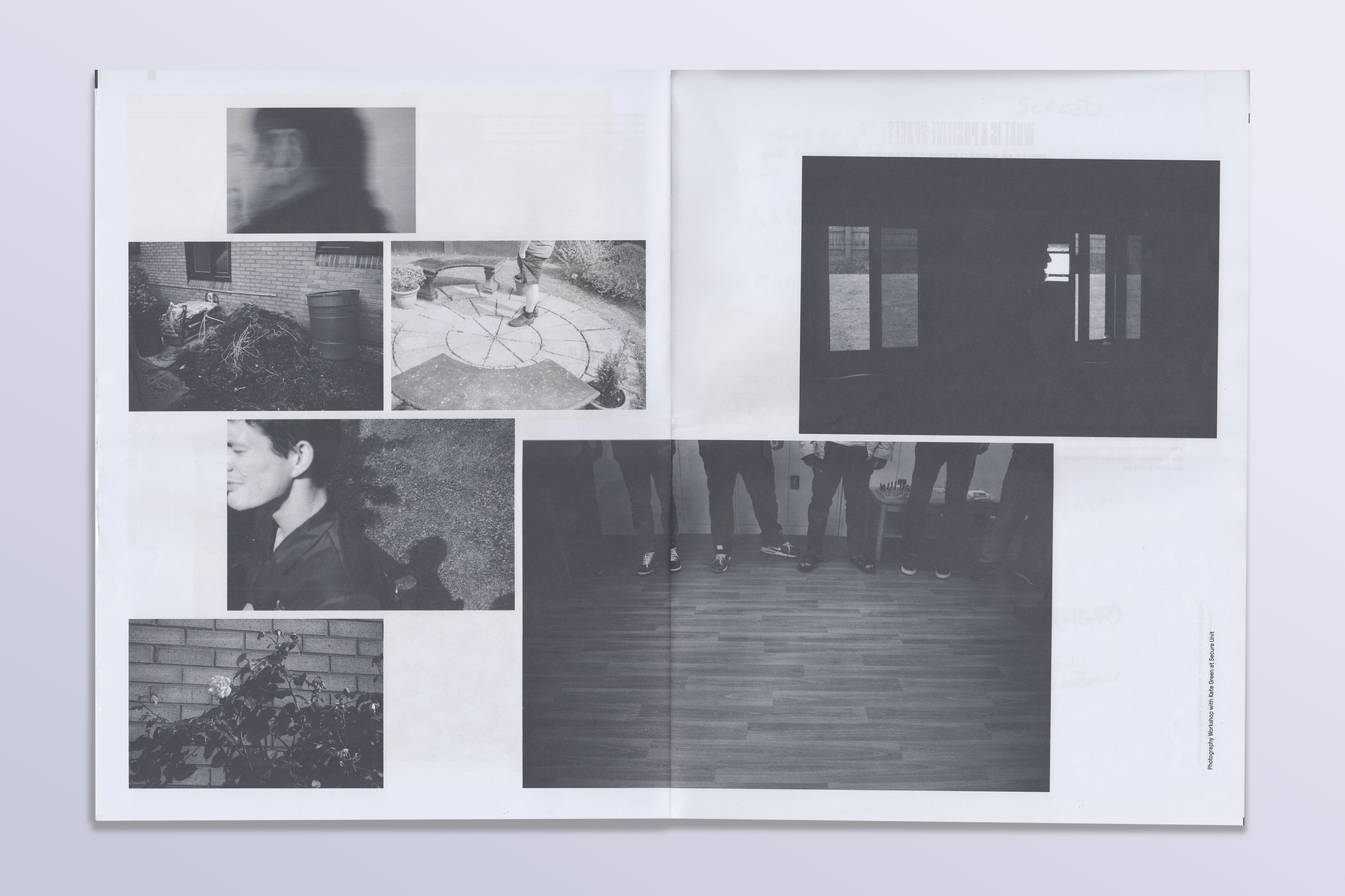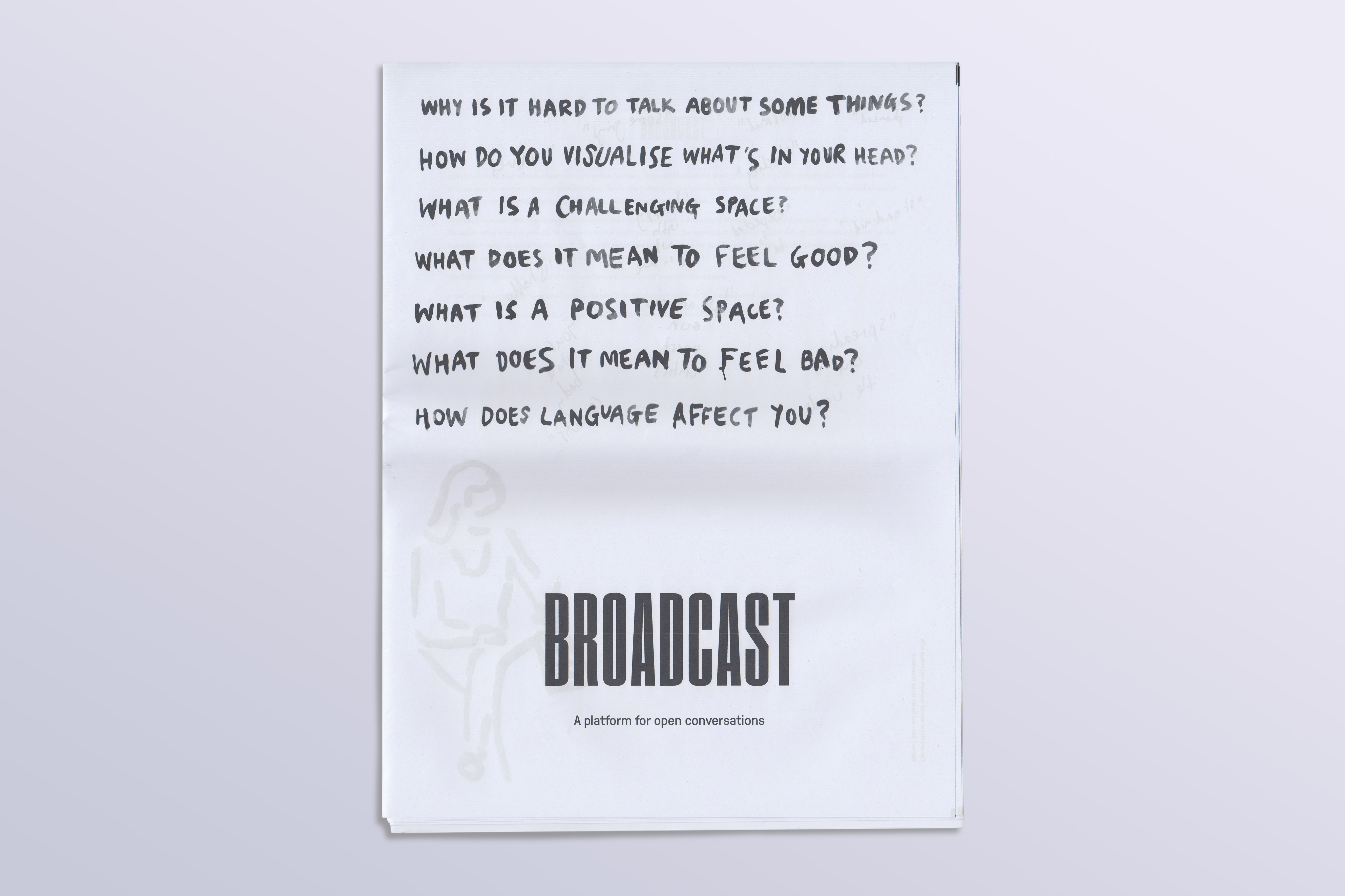 Tabloid newsprint publication accompanying Sarah Taylor Silverwood’s Broadcast exhibition at MAC Birmingham. It documents Silverwood’s work with mental health service users and staff, often in secure units. Headlines use all-caps Pressio №25; tag line and captions are set in GT Pressura. Helvetica is used for the interview text.