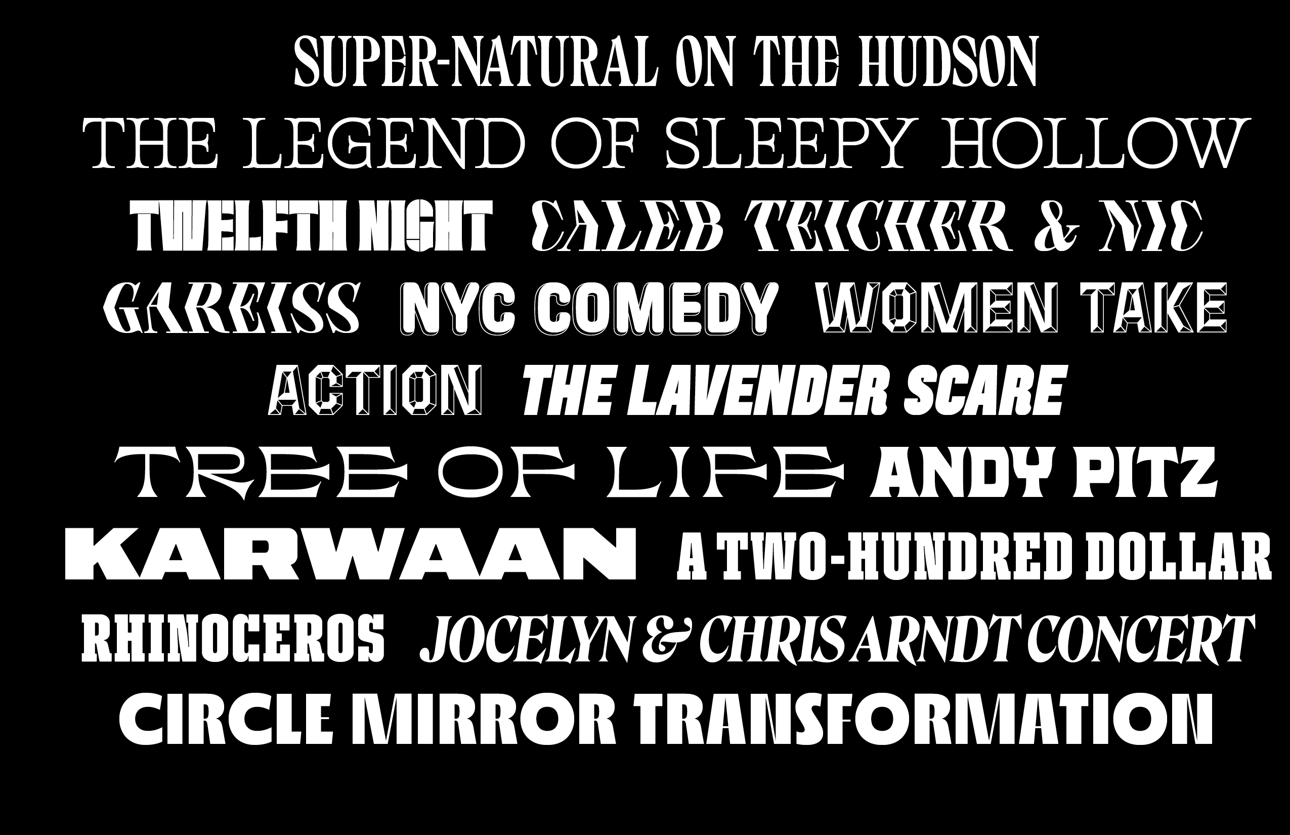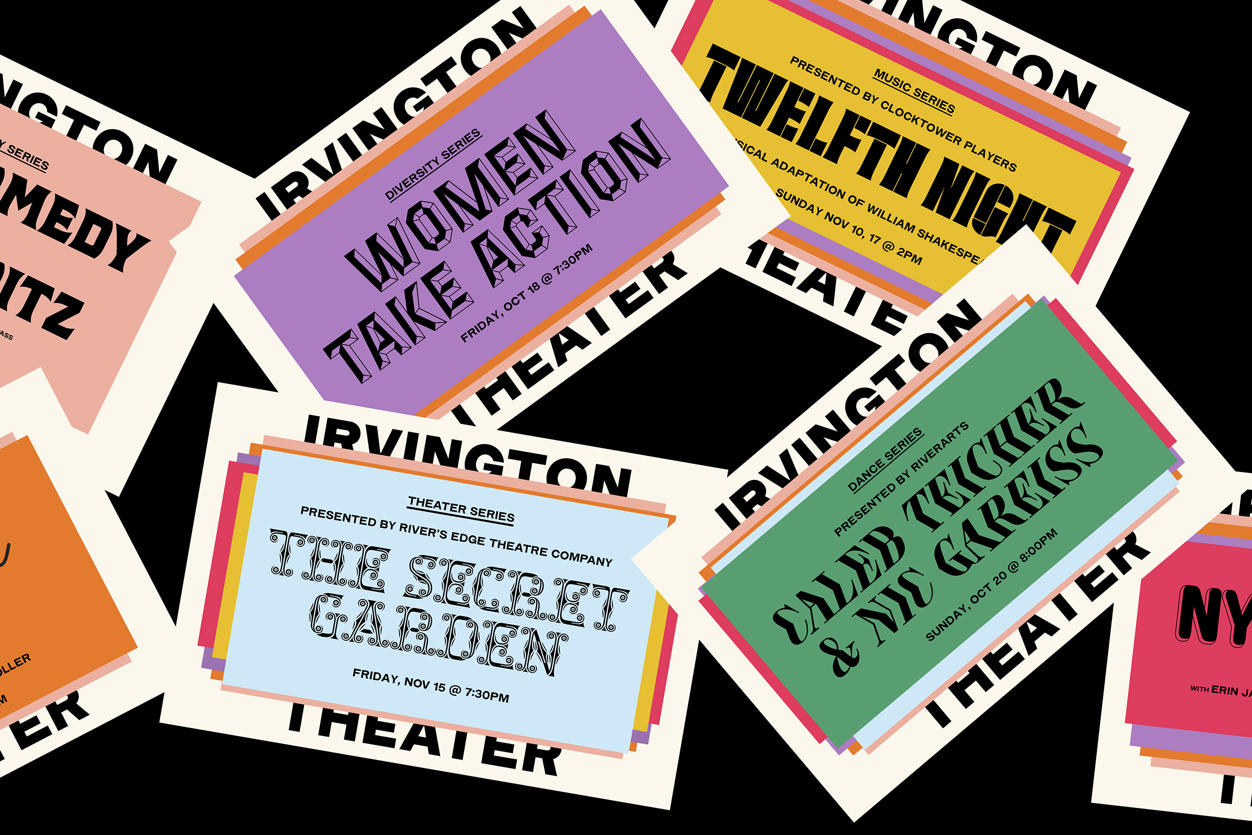 The new brand identity designed by Andrea Trabucco-Campos and Pràctica Design should capture the cultural energy flowing through the theater: inspired by the visual language of 19th century playbills and theater ephemera, the system is based on two main elements: 1. The layering and stacking of elements and colors, giving a sense of the passage of time and a continuity in the output of the theater. 2. The use of vernacular typography, acting as a metaphor for the diversity of the programme as well as the varied cultural personalities passing through Irvington Theater.
