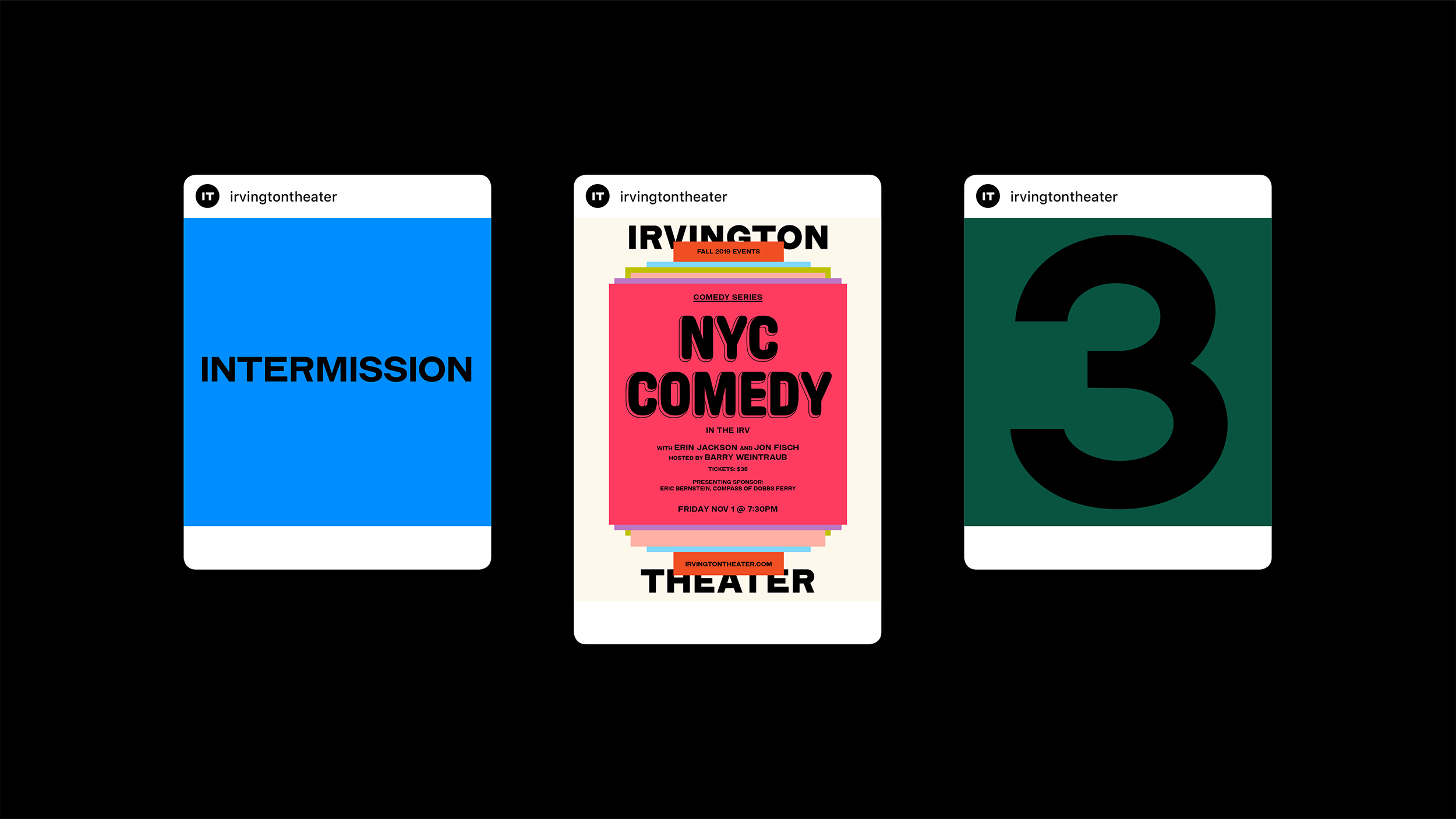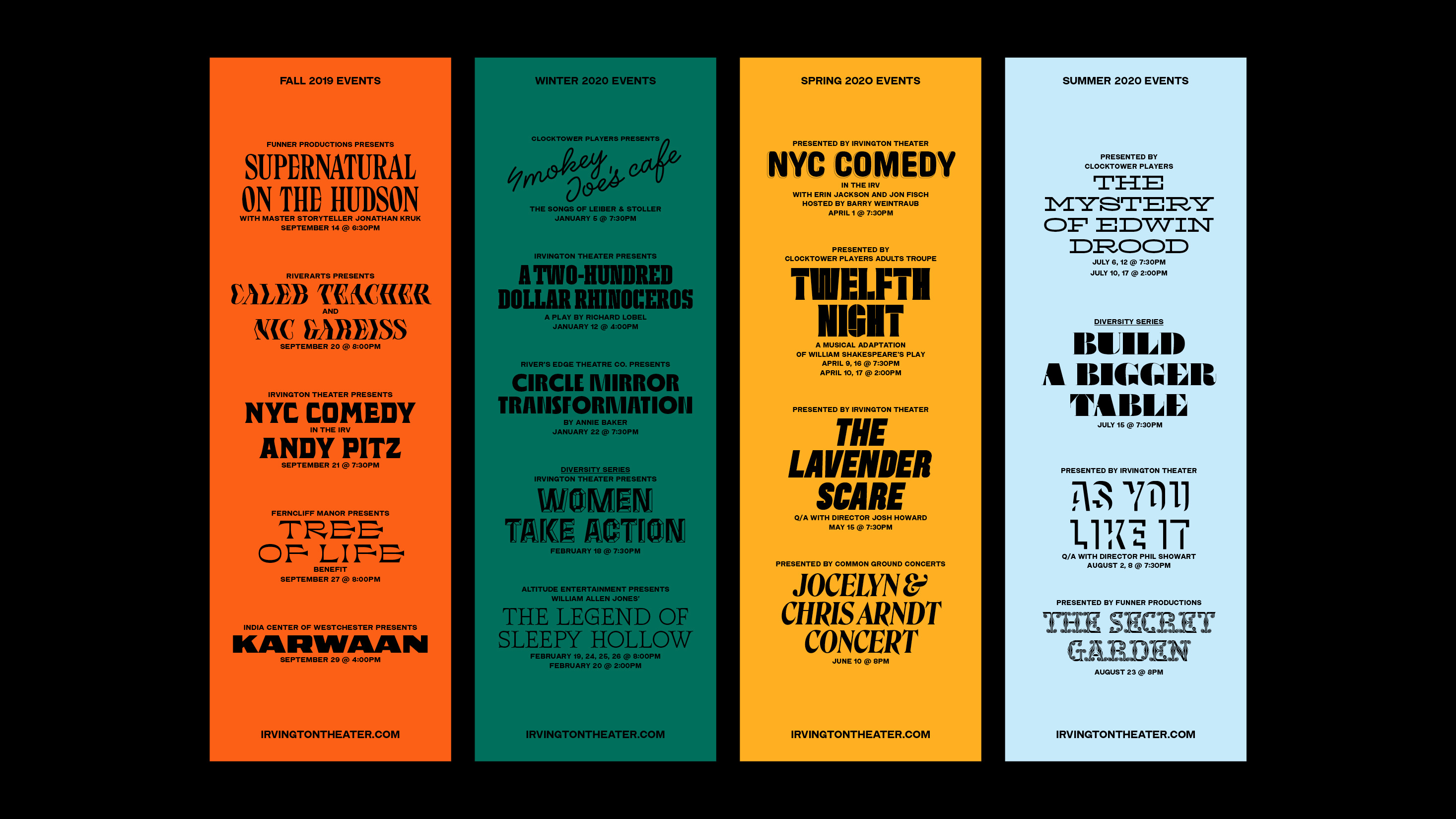 First opened in 1902, Irvington Theater has become one of the cultural hearts of the Hudson Rivertowns. In 2019 the theater commission built new ambitions for their programming. The aim became to showcase the diverse range and wealth of events produced by the theater and their artistic partners, revitalize and centralize their brand identity in a way that could be executed by their newly assembled internal team.
