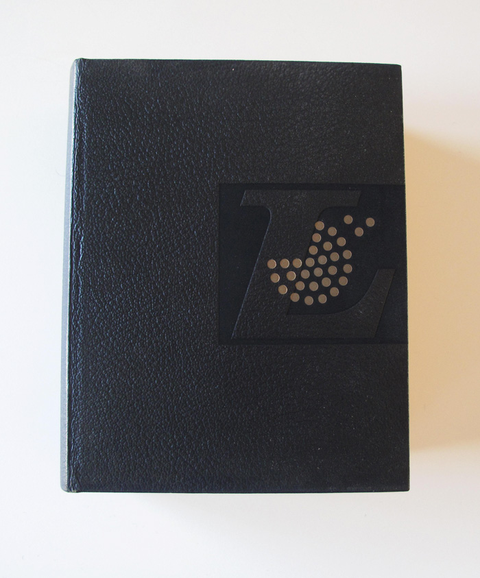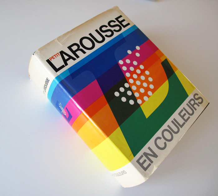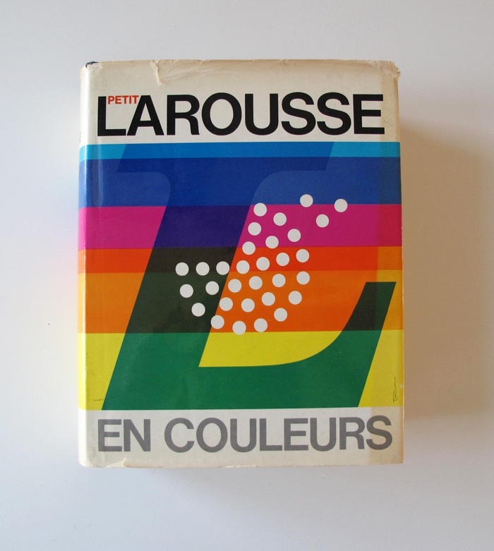 The motto of the French publishing house Éditions Larousse is: Je sème à tout vent – “I sow to all winds”. It is ascribed to architect and designer Émile Reiber (1826–1893). The first logo from 1876 features this motto together with a dandelion. Later versions of the Larousse logo – including the current one – depict a woman blowing flower seeds, known as the semeuse (“the sower”). Excoffon dispenses with the semeuse and goes back to the roots by reducing the logo to the dandelion – indicated as stylized white seeds. The background consists of rainbow-colored stripes, since this version of the Petit Larousse illustré comes in color.