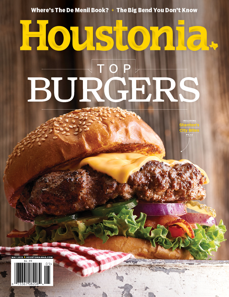 Cover design of the May 2013 issue of Houstonia magazine. To go along with the wonderful burger photograph by Ralph Smith, design director Chris Skiles used all caps Turnip Regular and Salvo Sans Regular by The Font Bureau as well as Salvo Sans Condensed Black for the teasers up top.
