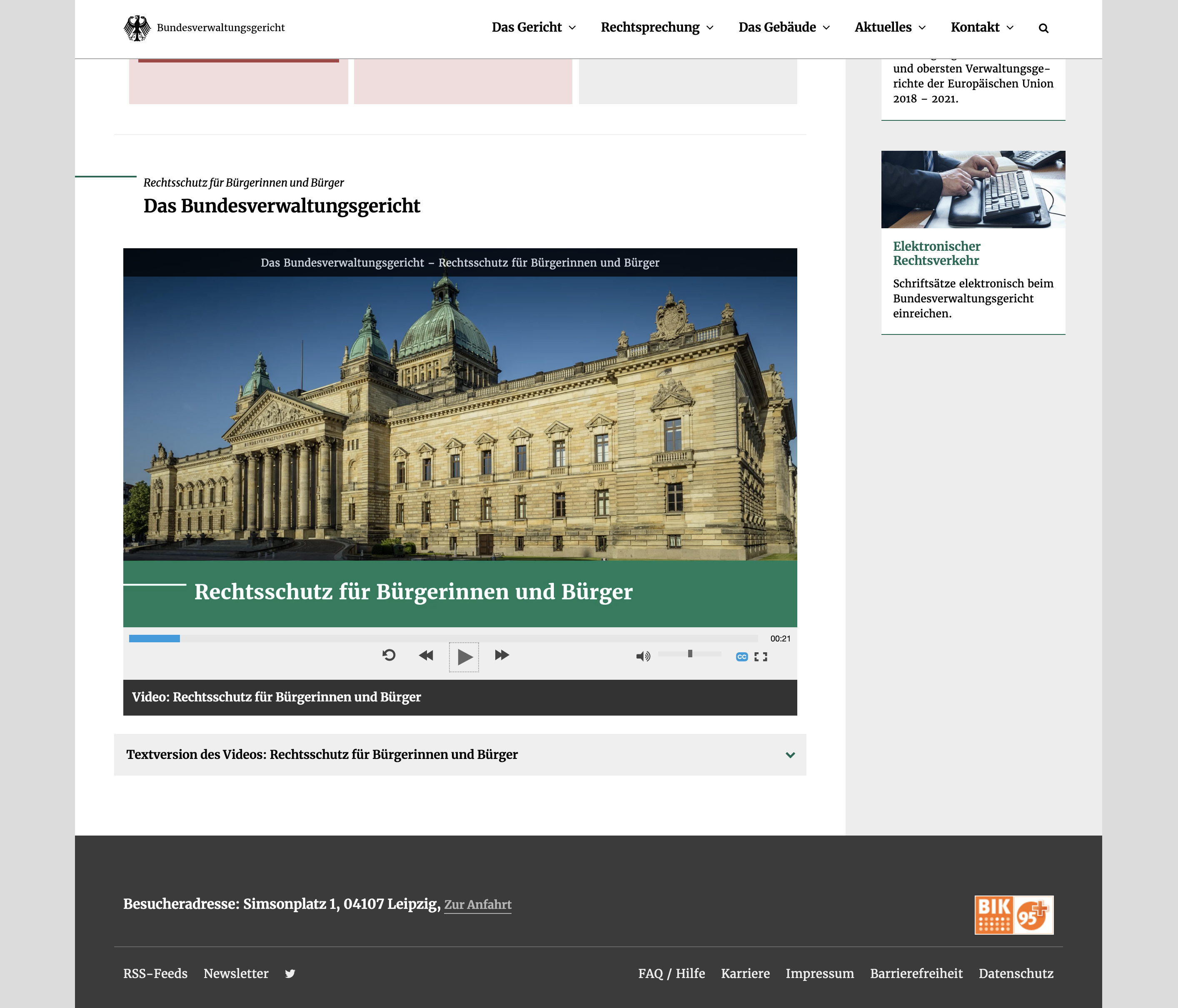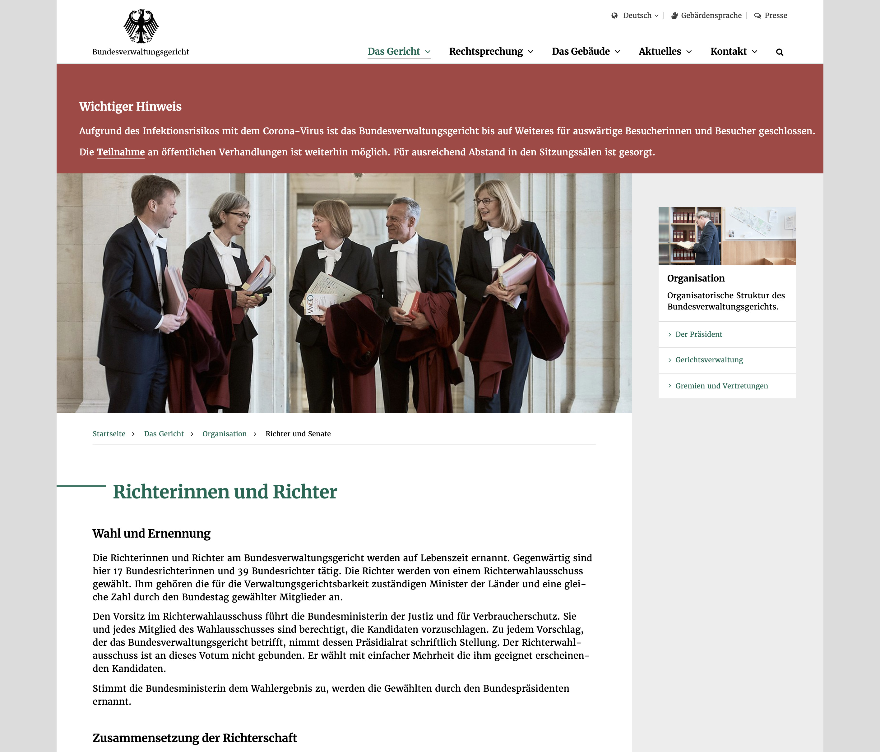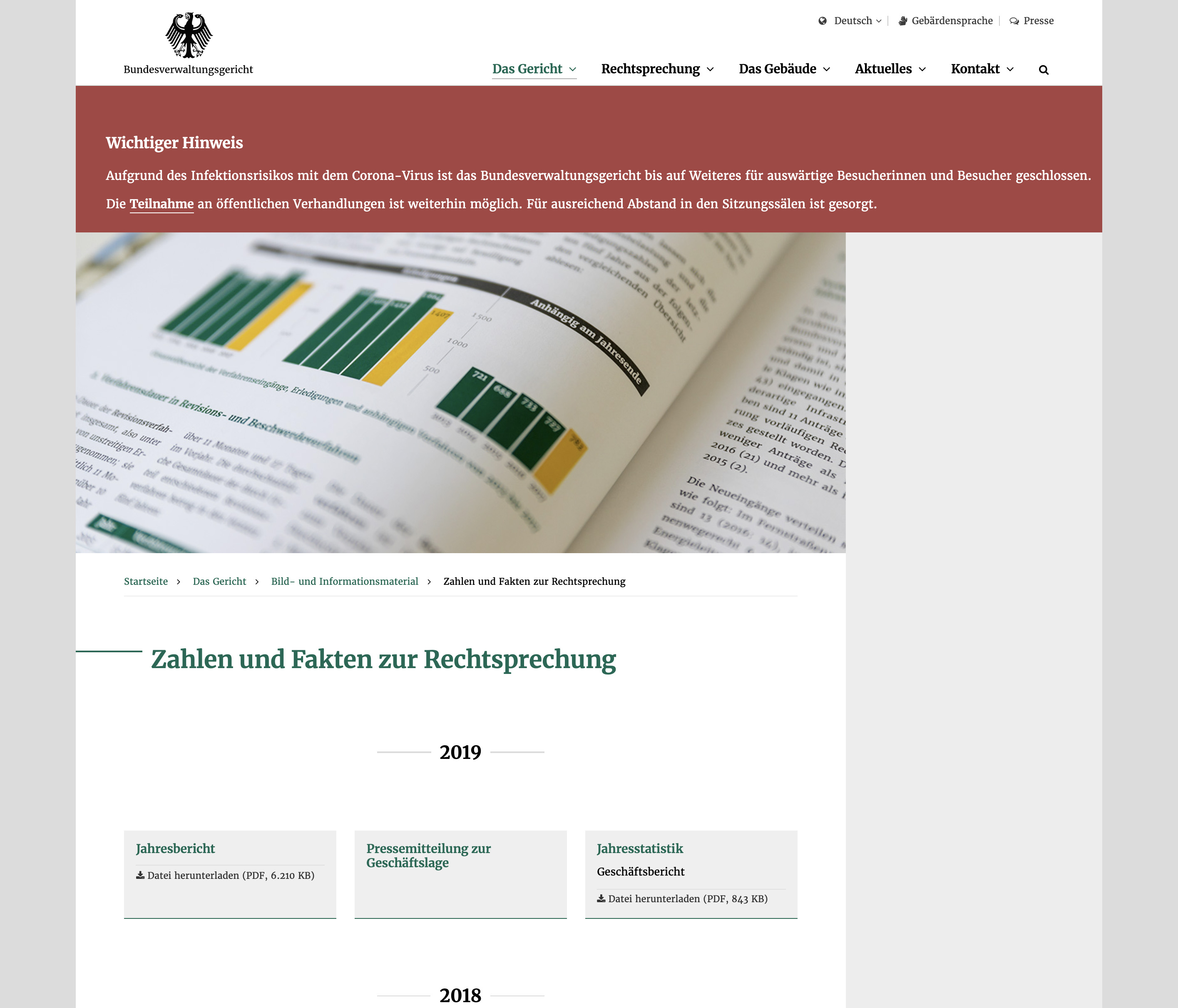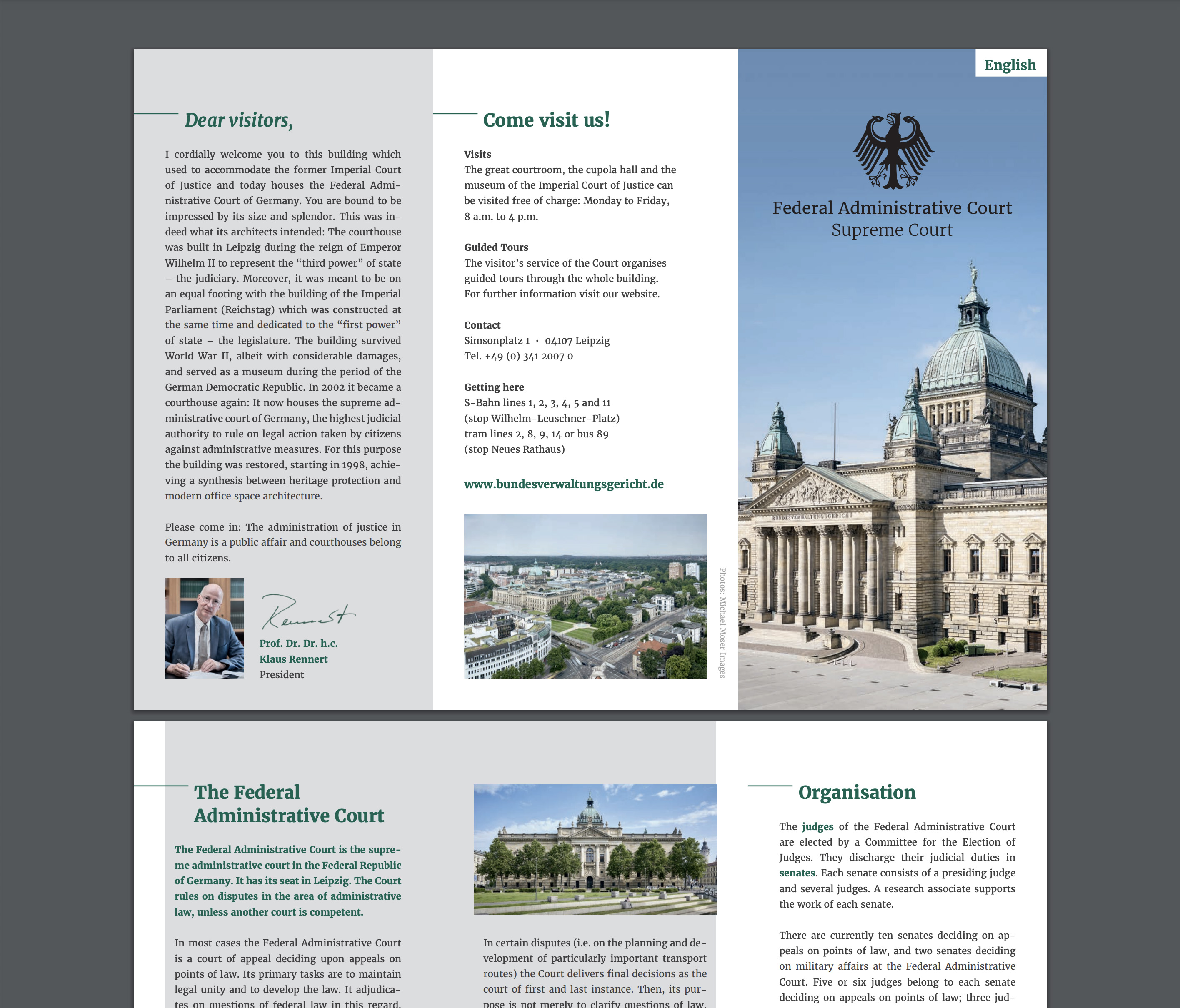 The Bundesverwaltungsgericht (Federal Administrative Court) is the supreme administrative court in the Federal Republic of Germany. The website for the court makes use of Merriweather for all typography, from headlines and subheads to body text. Other documents using Merriweather include pre-printed documents and PDFs and videos. The site and and other media are made available for use in three languages: German, English, and French.