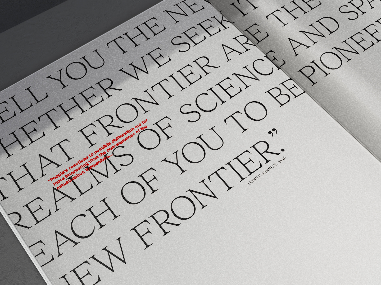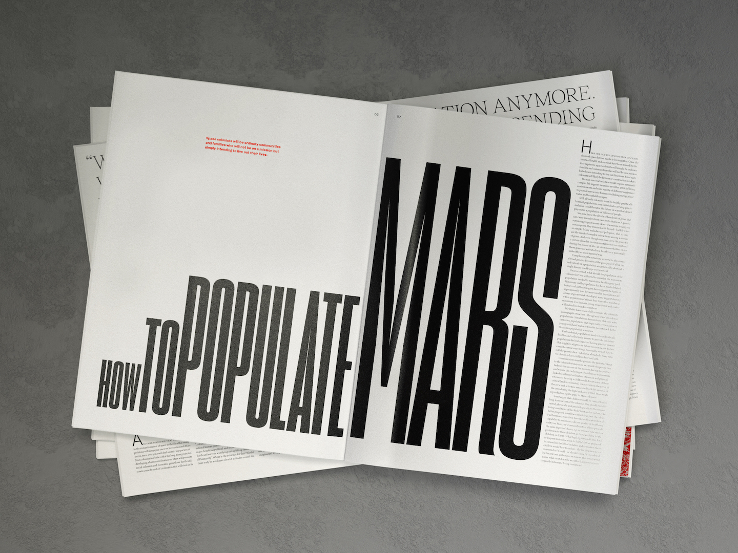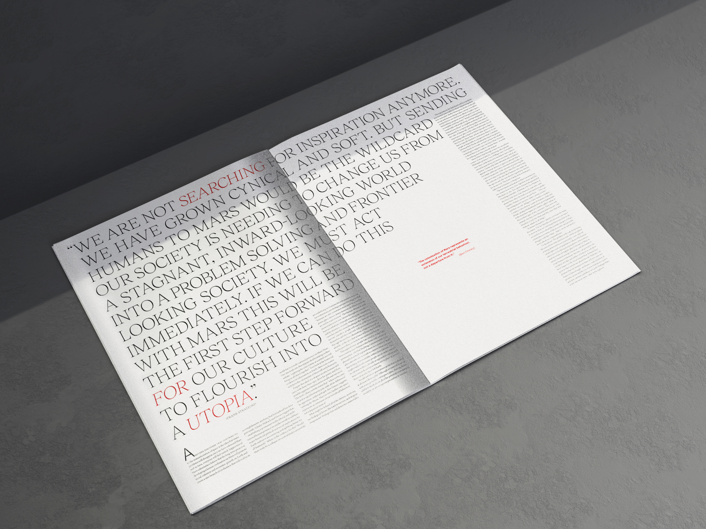 The (fictional) publication is designed for adventurous individuals excited by the unknown. The audience is deeply invested in the future of humanity, far beyond their own lifespans. They embrace new technology, being excited by the prospects its presents, but also recognise its potential dangers.