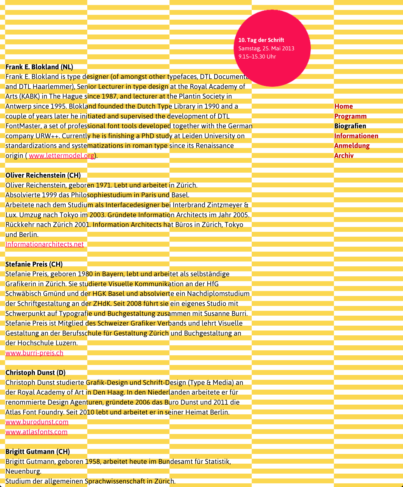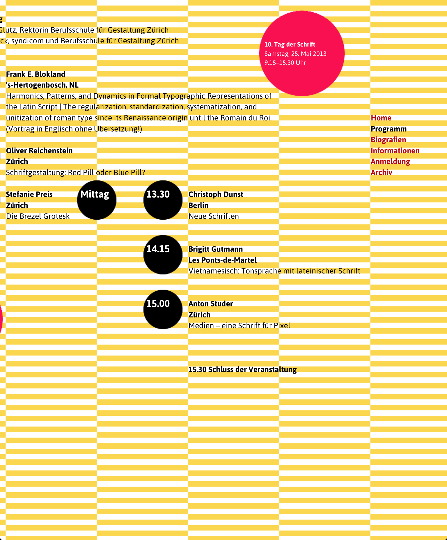 The 10th edition of Tag der Schrift is a rather small event organized by the local vocational school of design. Its program has some high-profile and international names, though. The website makes heavy use of stripes – too much for my taste, I almost missed the menu on the start page. Although some of this year’s speakers have created fonts for web use, the designer of the site preferred an unrelated nondescript font from Google.