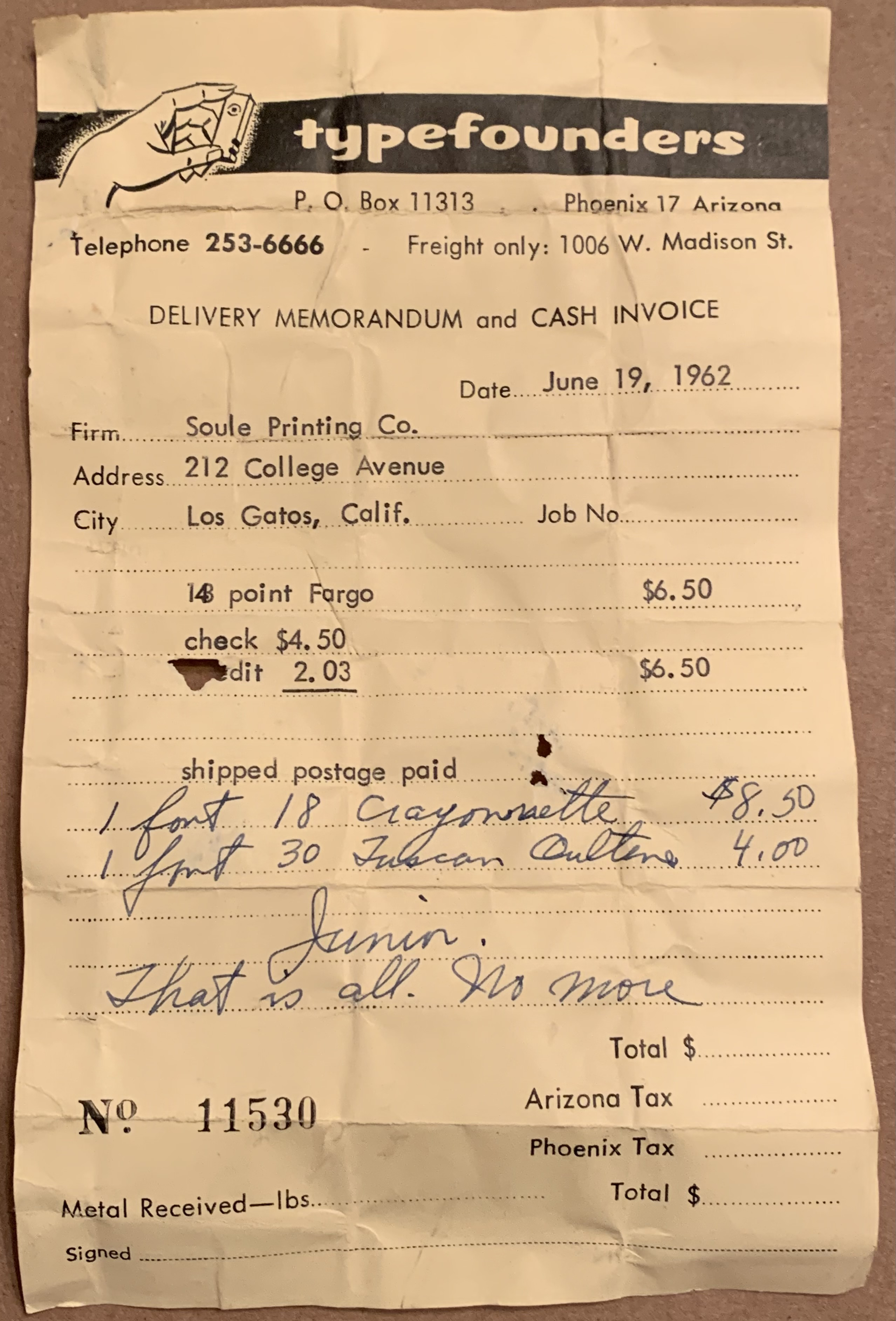 This invoice from Typefounders of Phoenix was tucked inside a type case of metal handset 14 point Fargo caps.