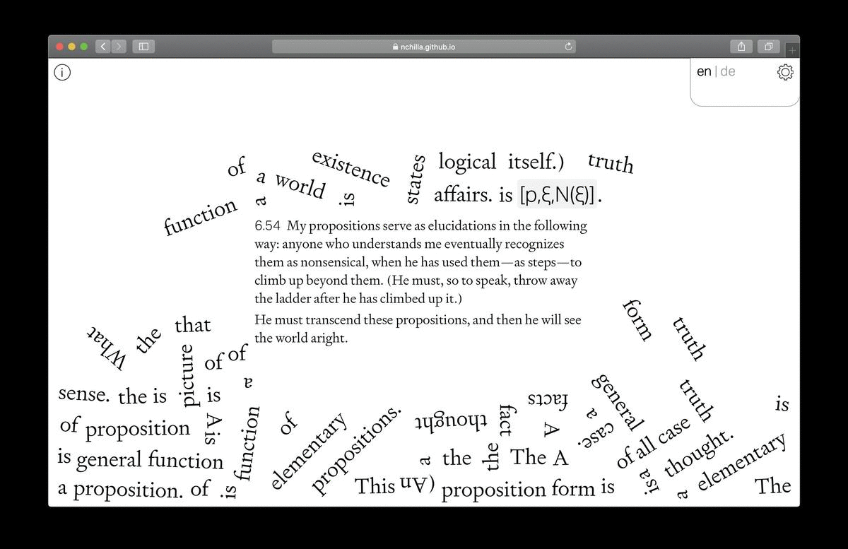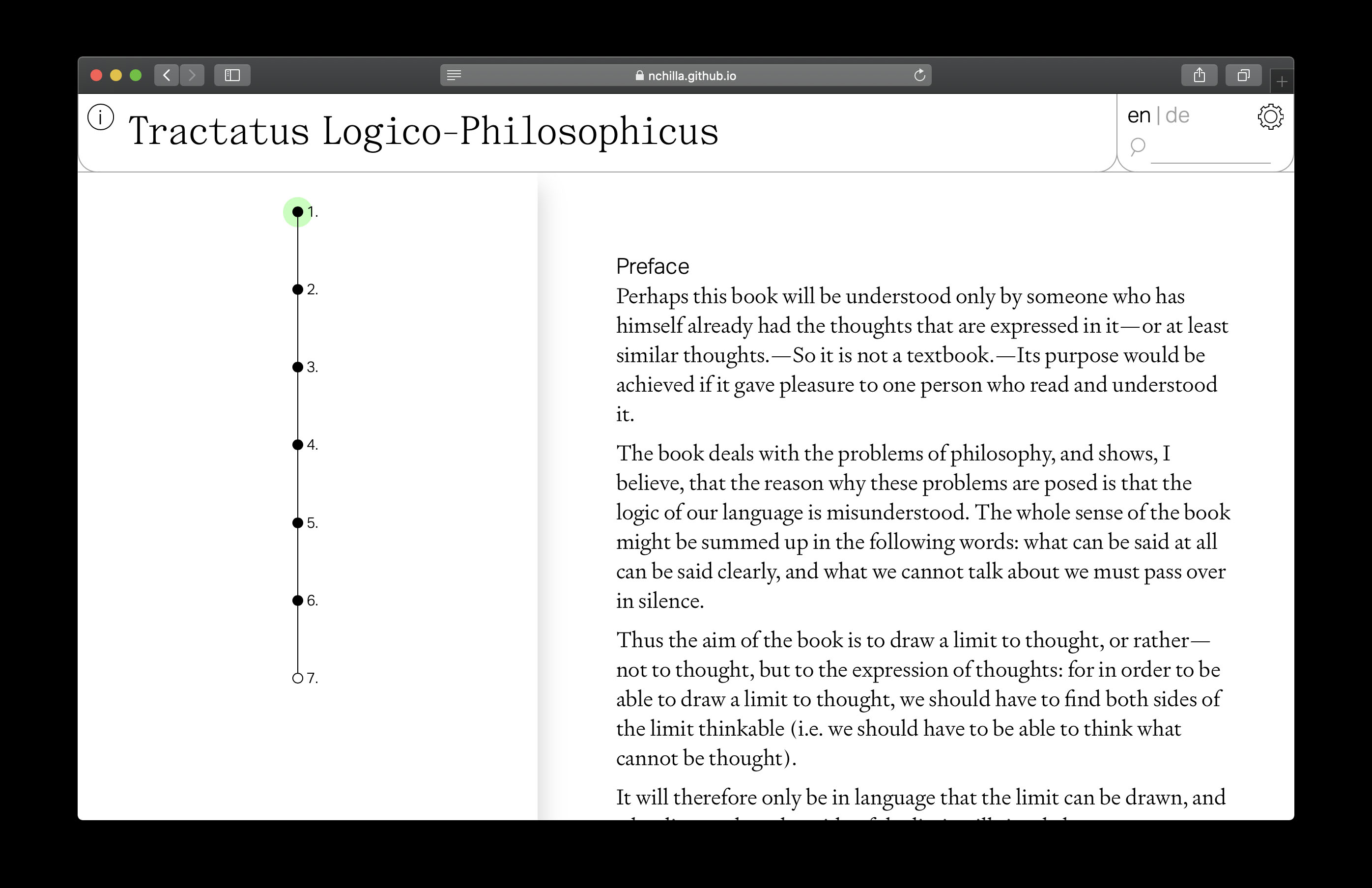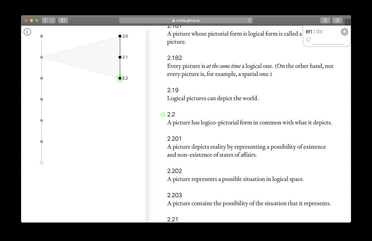 Ludwig Wittgenstein’s Tractatus Logico-Philosophicus is a landmark philosophical text composed of propositions in a tree structure (e.g. 2, 2.1, 2.1.1, etc). This project was made while studying design and philosophy at Parsons School of Design and Lang College. It consists of a website that explores different methods of reading and visualizing the Tractatus’ hierarchy, with more or less practical utility.