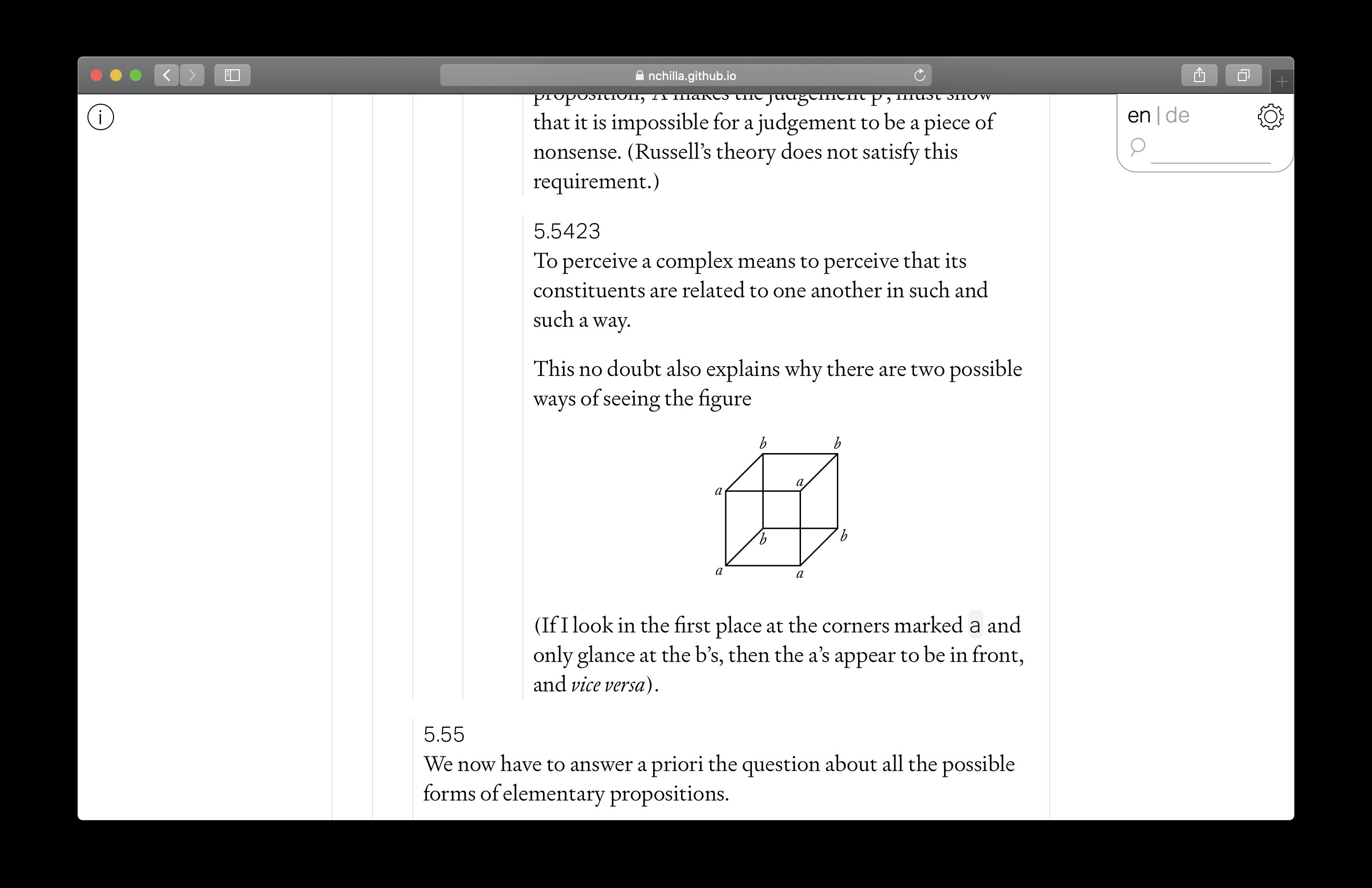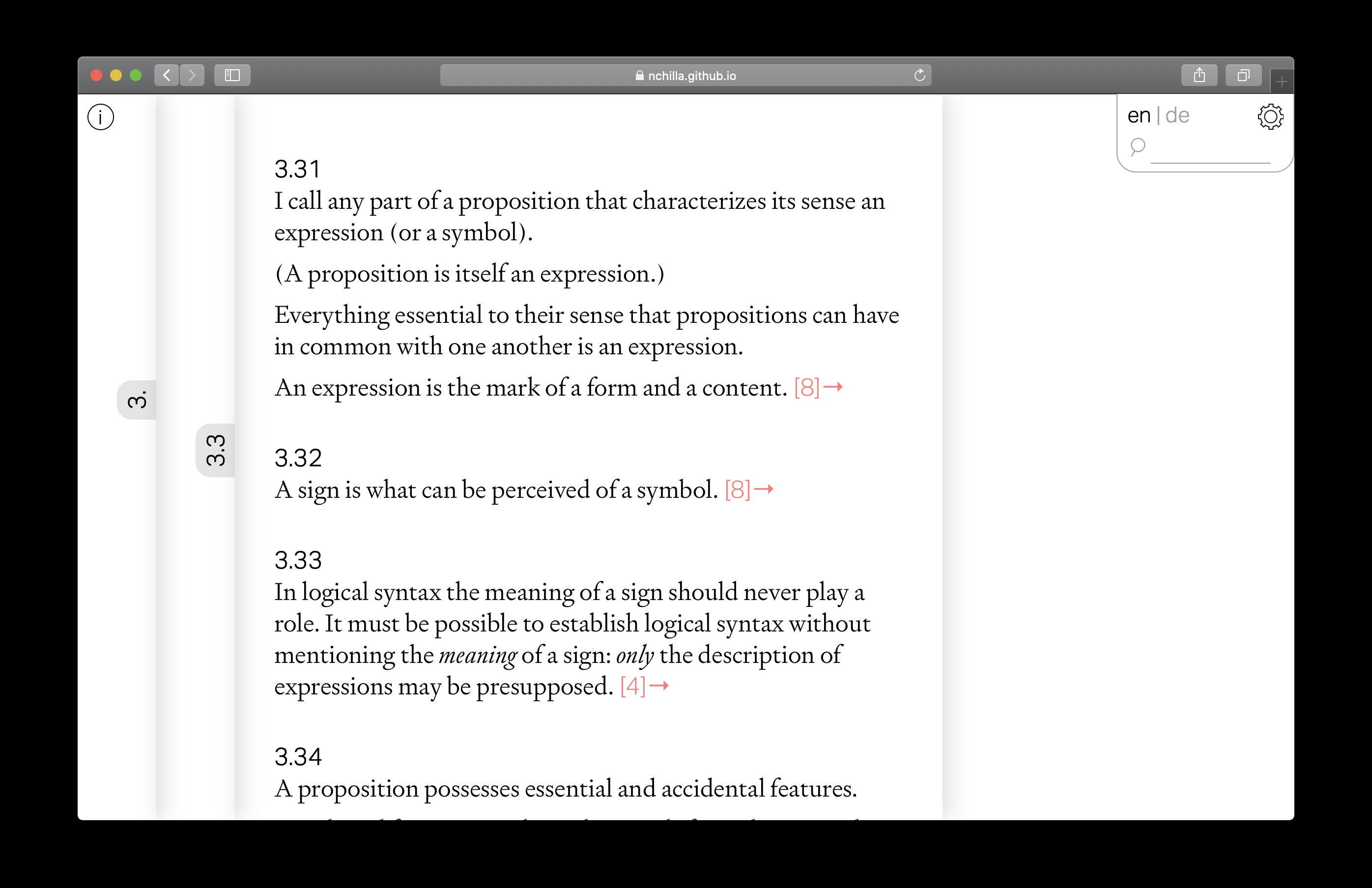 The Tractatus is about the logical structure underlying human language. It describes how relations of words resemble reality, and how to distinguish between meaningful and nonsensical statements (as if sentences were mathematical proofs).