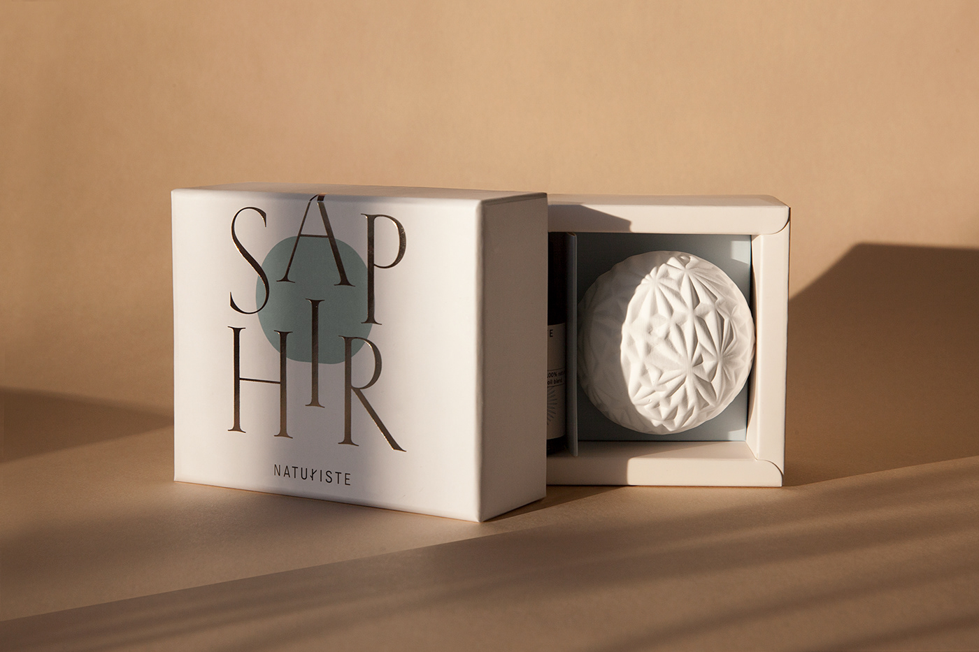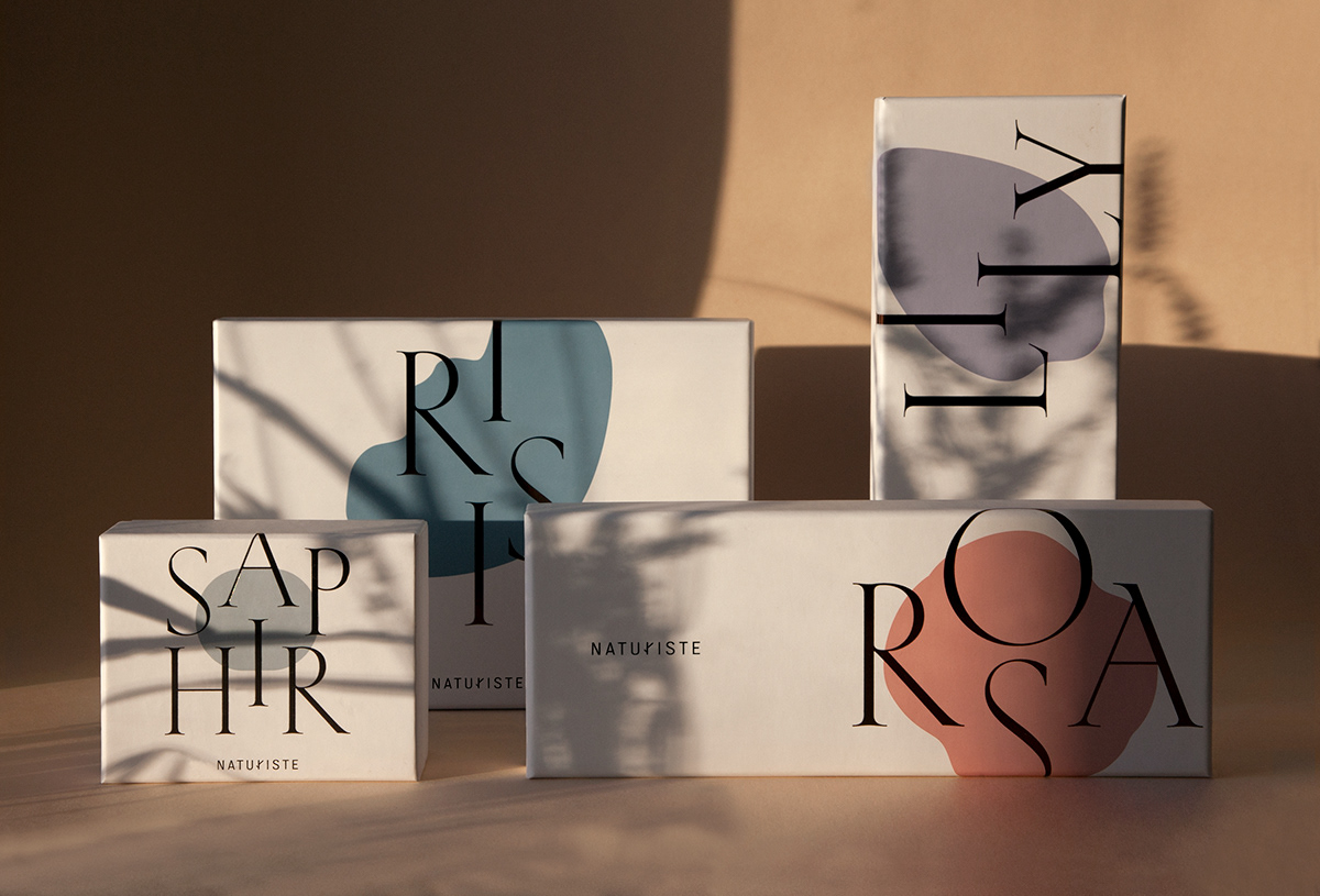 The products in this line are all dedicated to aromatherapy and offer either sets of essential oils only, or box sets with diffusers. The whole design uses Kessler from Production Type, designed by Alaric Garnier. It’s set in harmoniously arranged caps, making the words look like they’re floating in the air. Each box features a different pastel color: the choice of tones reminds us of colors found in plants, giving these artificial objects a fairly natural look. At the same time, the packaging conveys a sense of preciousness: the hot-foil stamping makes the different product names look like monograms, while Kessler’s caps, with their light weight and contrast, bring the delicacy of an inscriptional style. The packages seem to contain jewels – which are, in this case, treasures taken from nature.