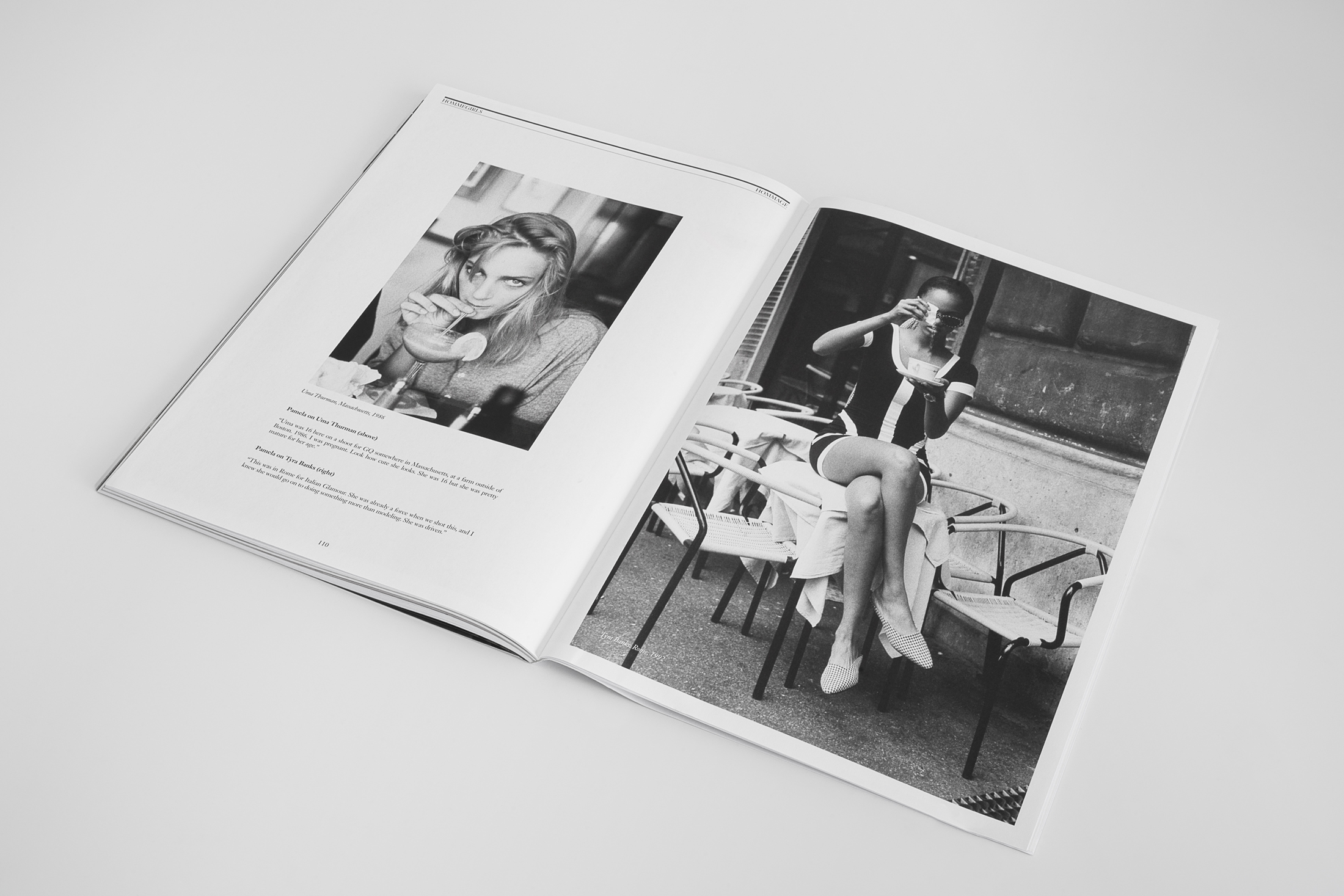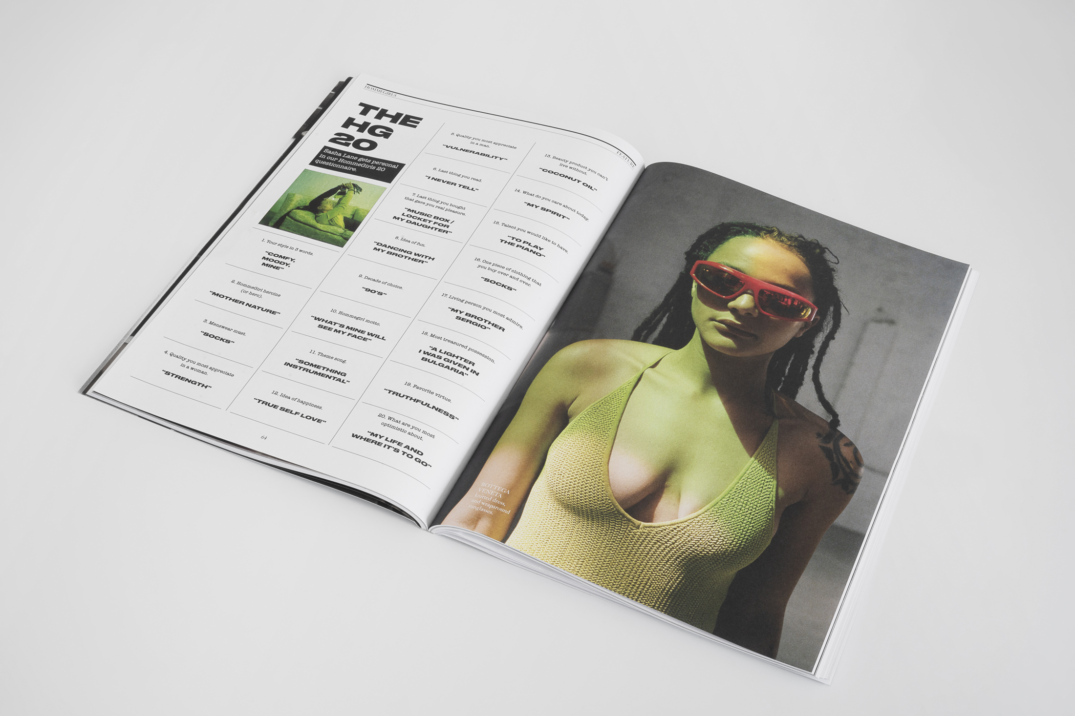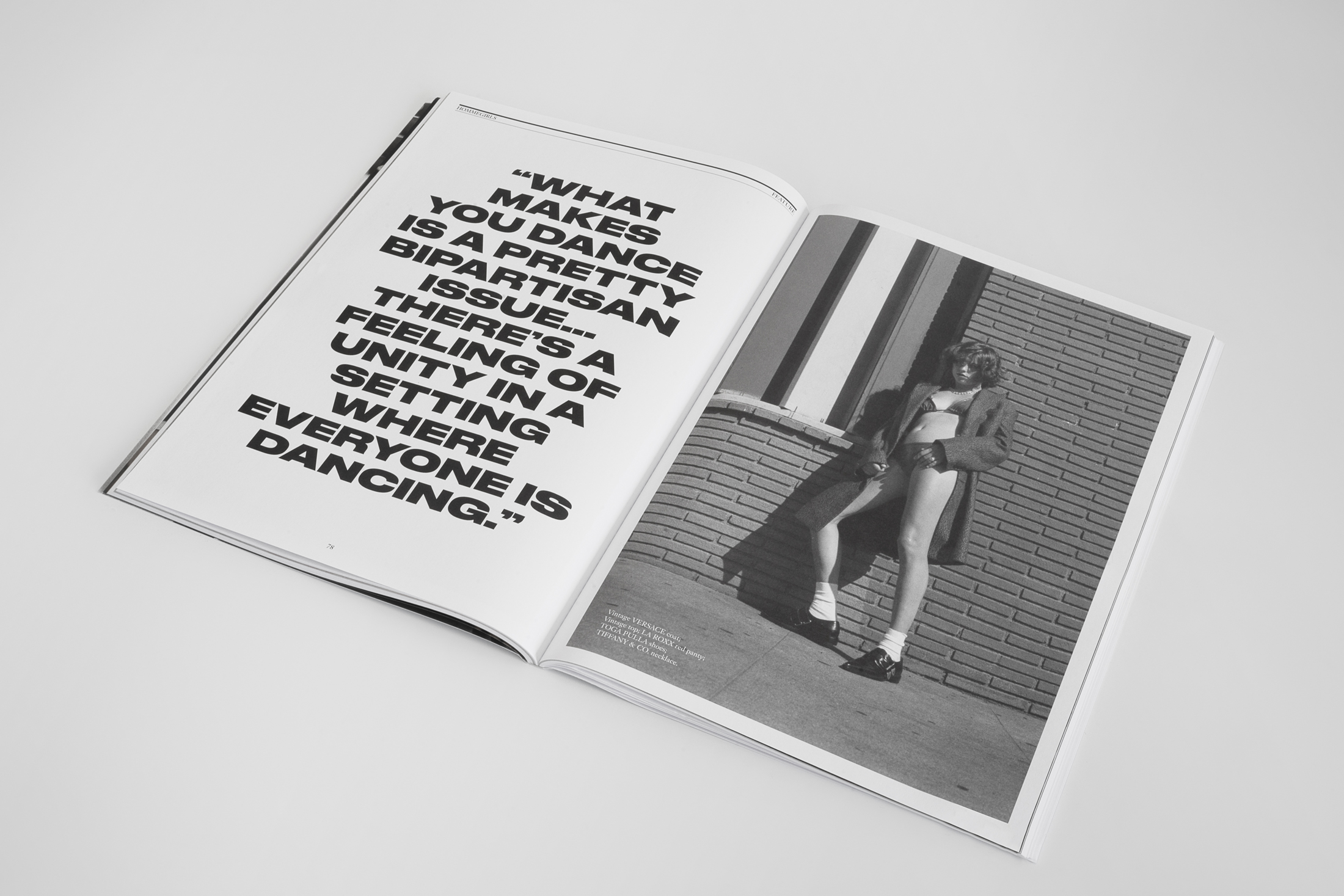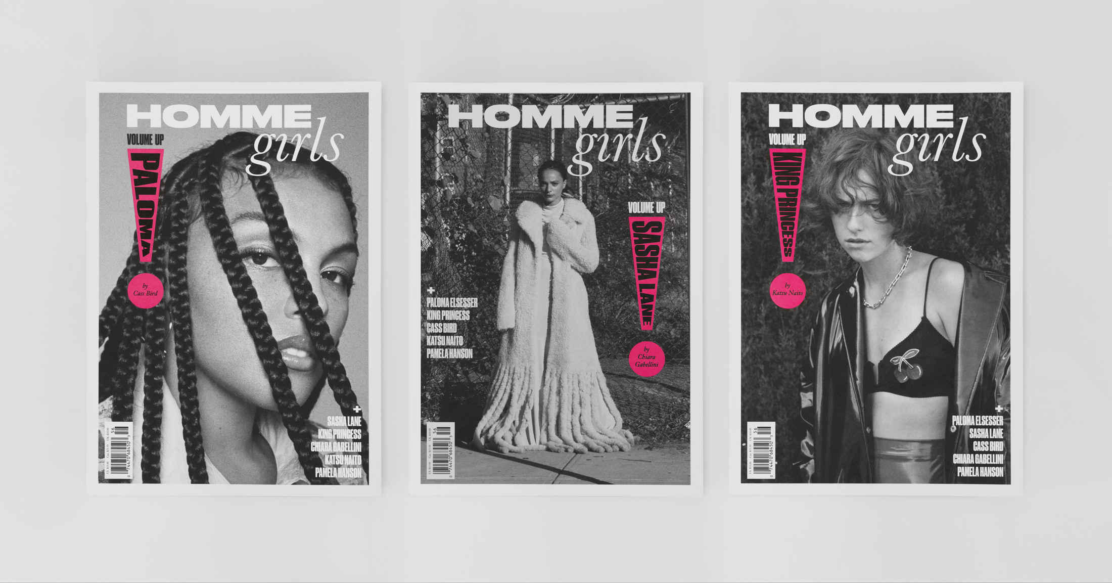 For the fourth volume, “Volume Up” – Hommegirls Fall 2020, the three covers feature a spot-foiled and fluorescent pink Pantone exclamation point as a marker to celebrate the various voices inciting change within their respective fields within the issue. This is contrasted against black and white imagery and a grainy matte paper. Druk was used to signify the volume’s name, adapted for the cover stars names within the exclamation point, and further used in the heavy weight of Druk Wide for headlines throughout the publication. Janson Text in Roman and Italic variations was used for team credits, fashion credits, and copy, with a cameo for ITC American Typewriter Italic for the “The HG 20” piece.