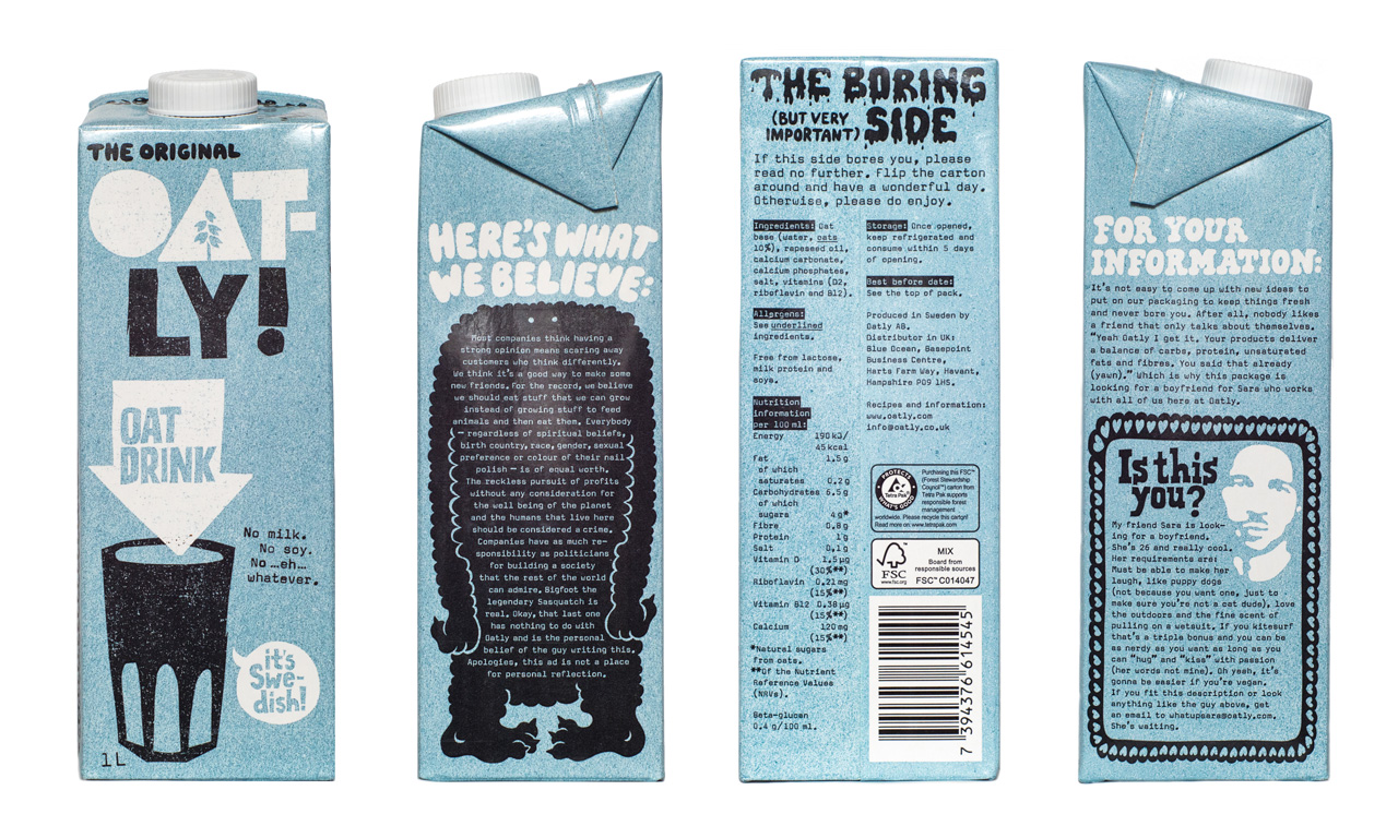 Oatly is a Swedish manufacturer of oat based foods and drinks. A tiny company with huge ambitions. They have a lot to say and want to be in the middle of the discussion concerning sustainability and health. The only problem is that their media budget is, to put it mildly, limited. Which is why we decided to treat the packaging as Oatly’s main media channel, as an advertising space in itself.