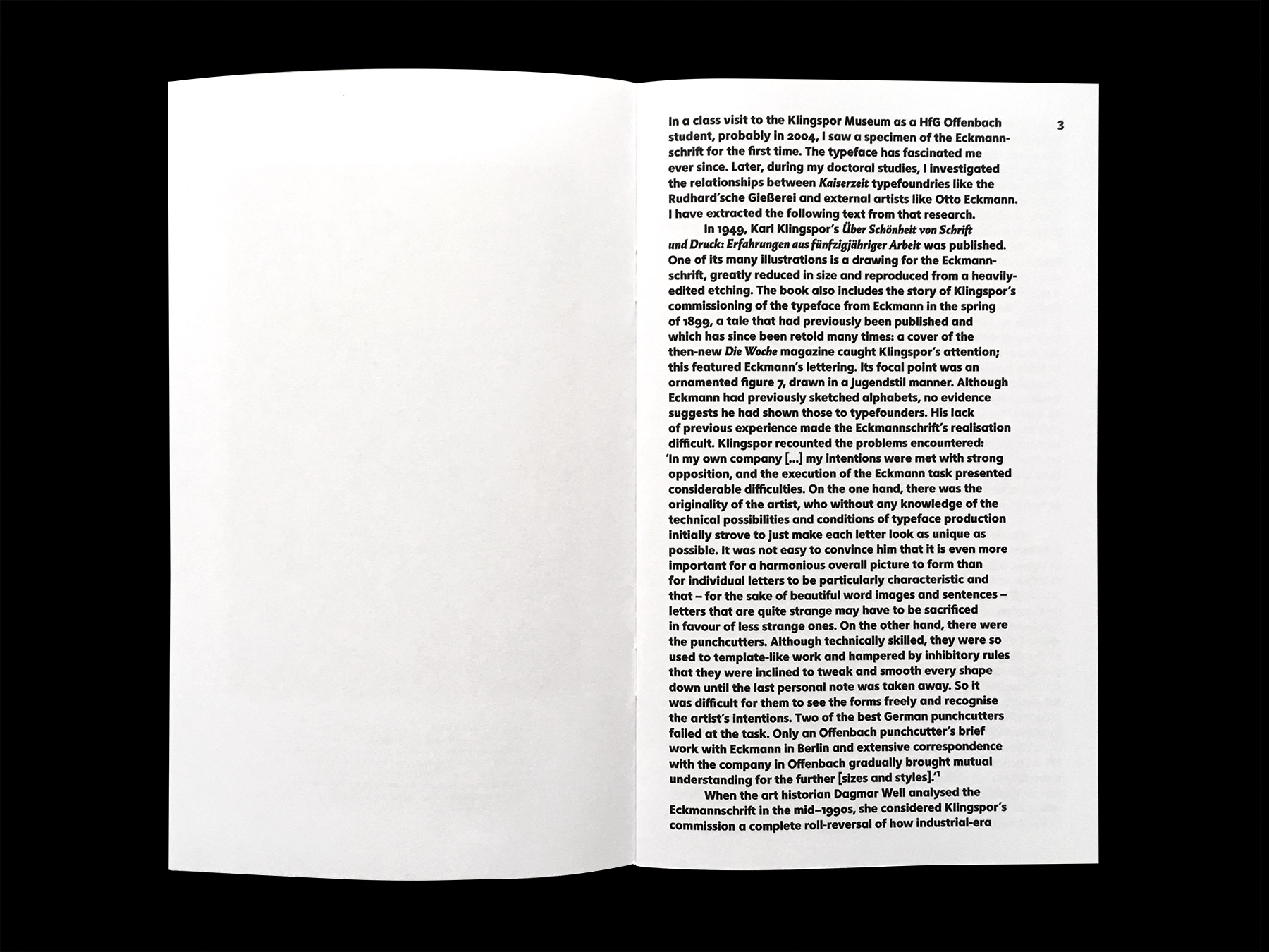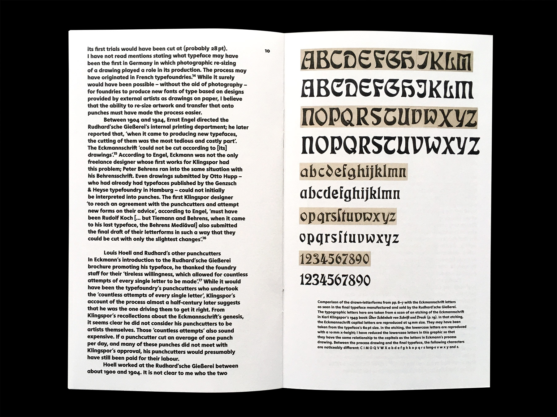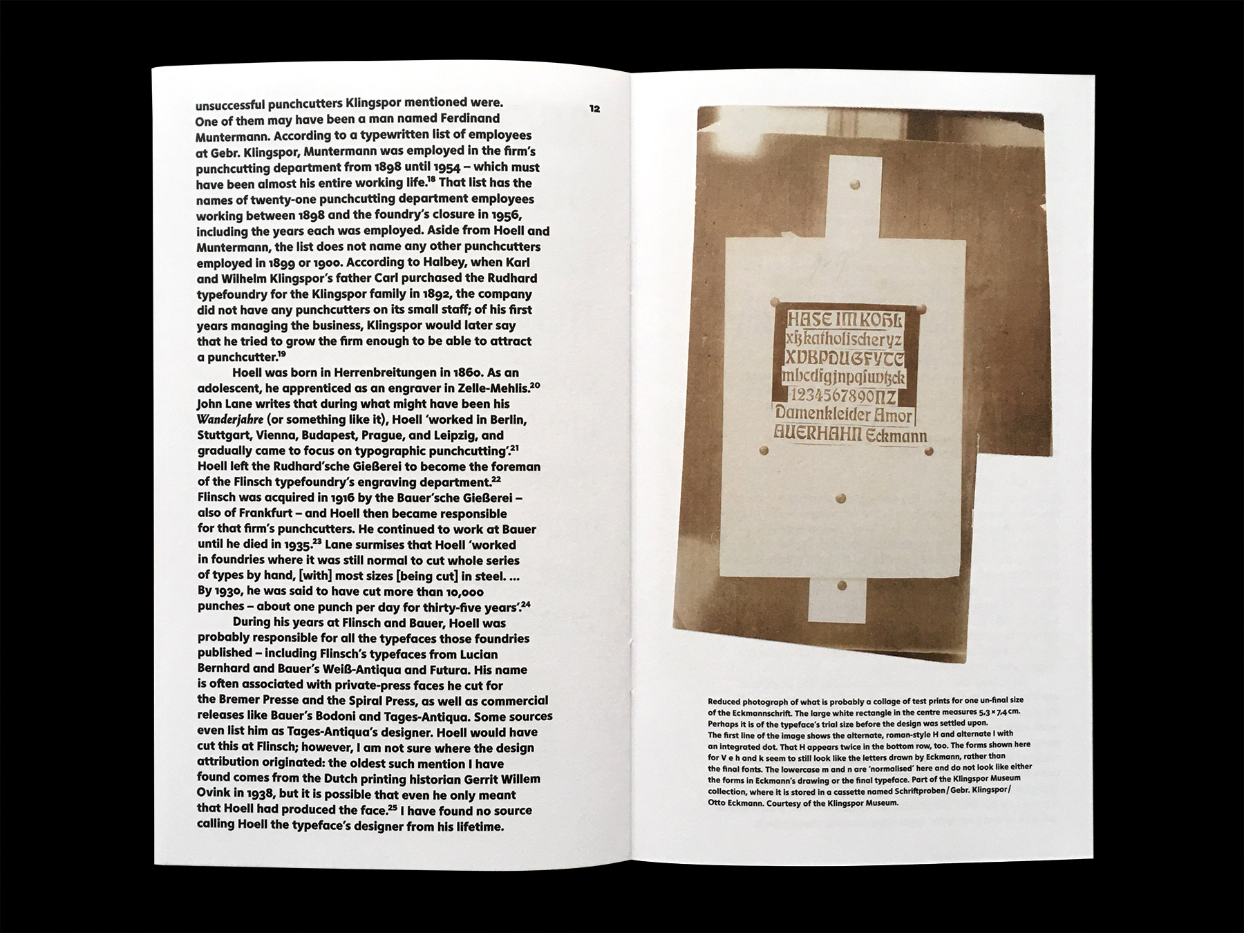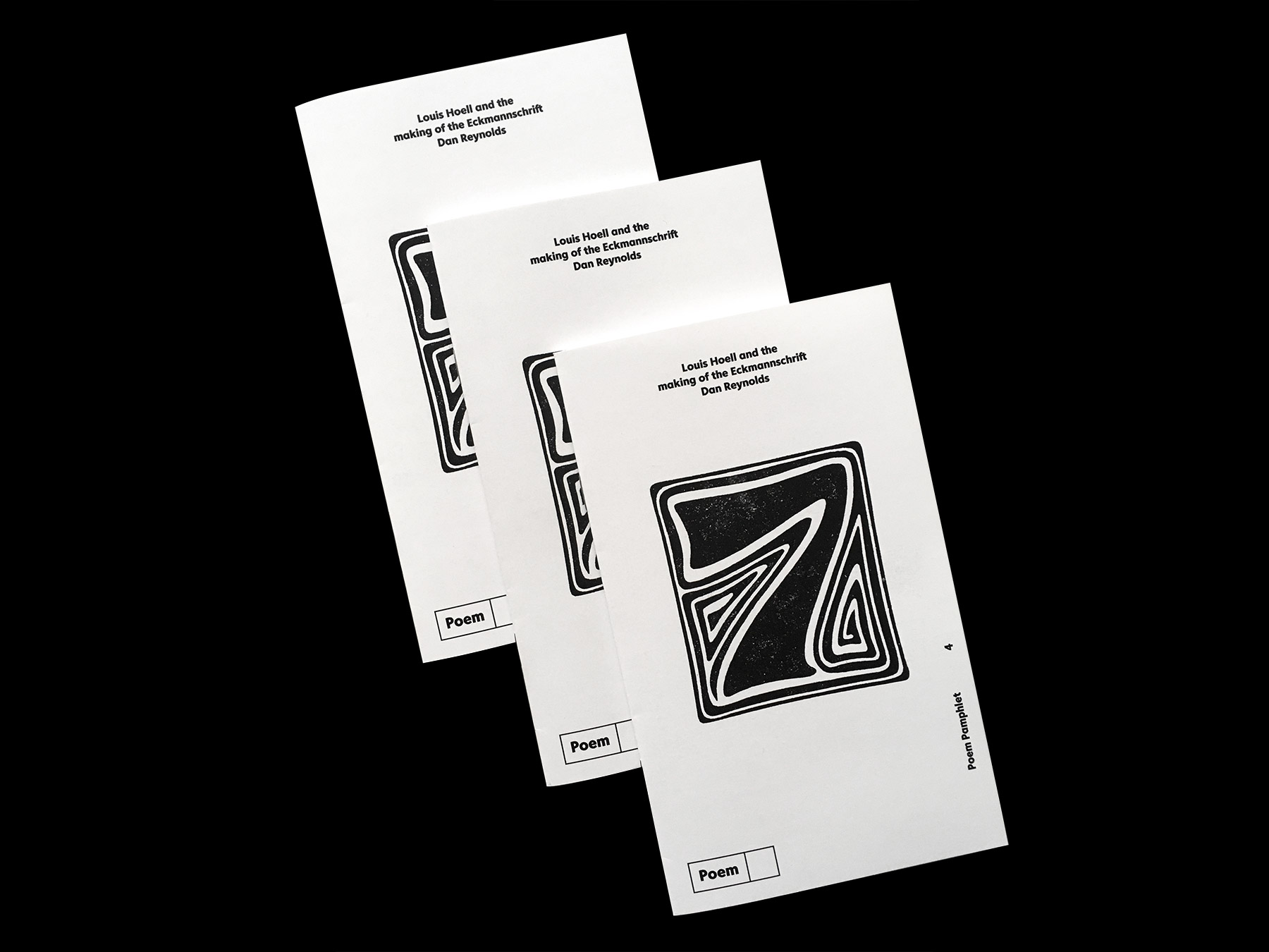 Louis Hoell cut the punches for the only published typeface Otto Eckmann ever designed. The story of the Eckmannschrift’s creation has often been told. In retrospect, it was the release that made Karl Klingspor’s reputation as a typefoundry director of note. Yet instead of looking at the Eckmannschrift from Klingspor or Eckmann’s point of view, Dan Reynolds’s essay directs its focus to what Hoell’s design contributions to the project might have been. With rare and unpublished material from the Klingspor archives in Offenbach am Main. Edited by Alice Savoie & Jérôme Knebusch as fourth in the Poem Pamphlet series.
