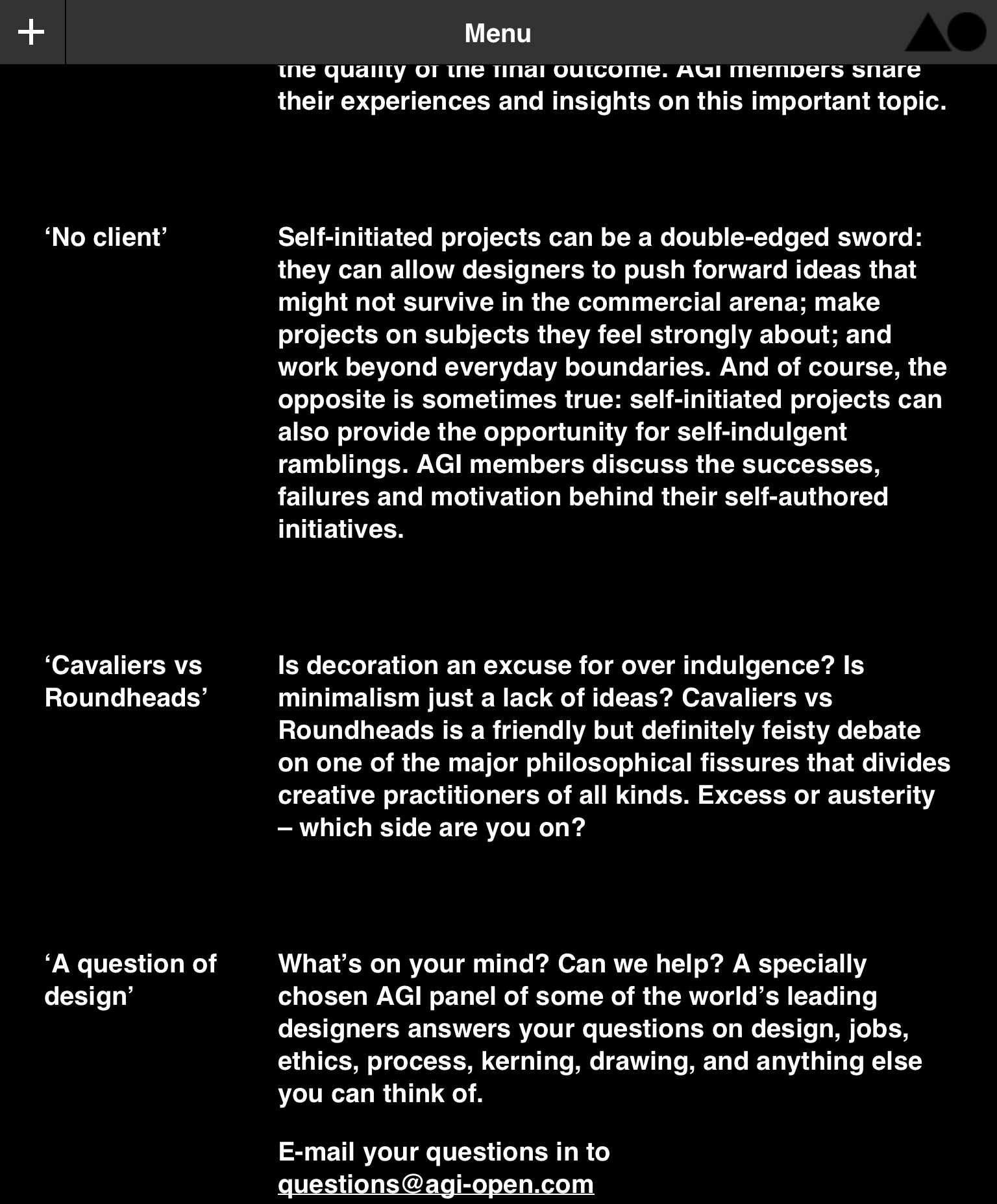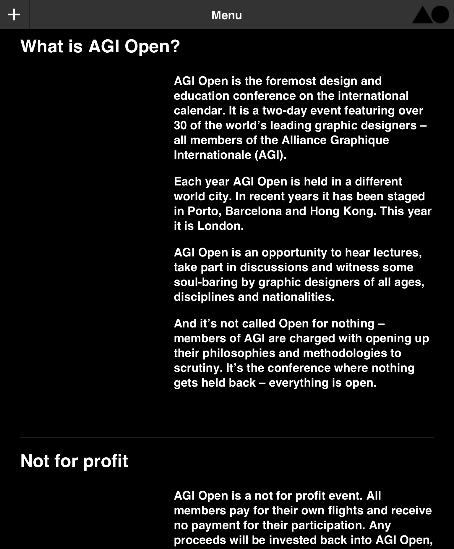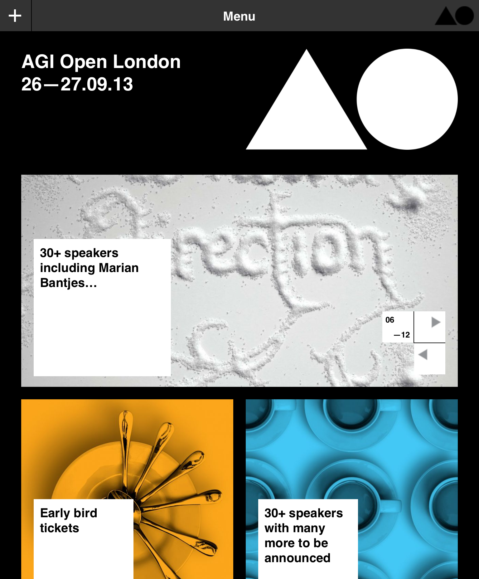 AGI Open demonstrates that having novelty webfonts in plenty styles is not a prerequisite for a striking and contemporary event website. Spin specified system Helvetica Bold only, white on black, in big and bigger. Maybe it’s not cutting-edge, but I found it appealing to look at and easy to navigate. The responsive design with the tiles and the flat buttons feels very app-like. The imagery is of outstanding quality.