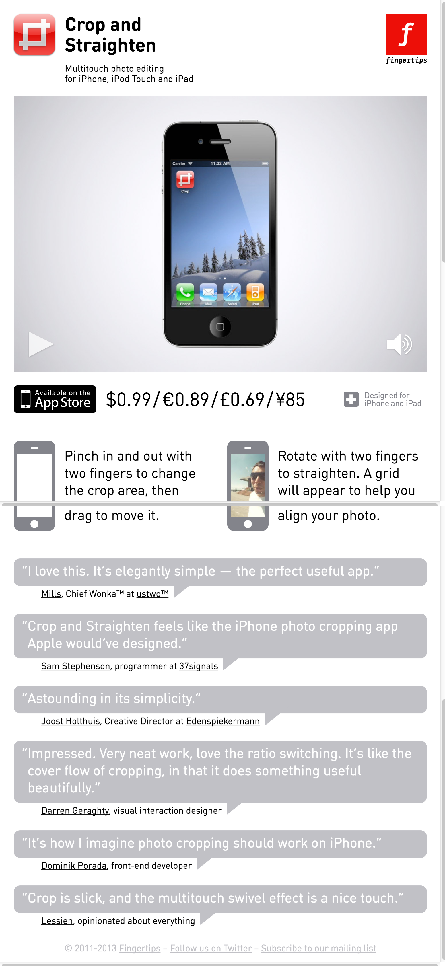 Crop and Straighten Contributed by Stephen Coles on Apr 25th, 2013. Artwork published in 2011. Source: crop.fngtps.com License: All Rights Reserved. Typefaces More about FF DIN RoundGet FF DIN Round Formats Web (5675) Topics Technology (1495) Designers/Agencies Thijs van der Vossen (1) Fingertips (1) Tagged withiPhone apps (69)photography (983)apps (235)webfonts (449) Post a comment Name Email – will not be published Website Your response Submit Comment More FF DIN Round in use Hello gorgeous magazinec. 2010gebr.silvestriContributed by gebr.Silvestri IGN.com reviews2012IGNContributed by Angus Shamal Marseille-Provence European Capital of Culture 20132013Thomas SerrièreContributed by BVH Type Sponsor More in Technology Sanity websitec. 2025unknownContributed by Johannes Pejas (Kimera) Electronic Skeet Shoot game by Tiger Electronics1987unknownContributed by Bryson Stohr Launch America visual identity2020Chris LogsdonOxcart AssemblyContributed by Pablo Balcells red_mad_robot rebranding2021Maria DruzhininaRoman BortsovMaksim ArbuzovContributed by Anastasia Balashova (Contrast Foundry) More in Web Barons2023GrafikrContributed by Jan Maack Ultimate Beer Run2014BlackletterOld MachineContributed by John Rice The New York Times article redesign (May 2013)2013The New York TimesContributed by Robin Rendle Staff Pick ACED Platform for Design and Journalism2018Lauren GrusenmeyerContributed by Matthijs Sluiter Staff Pick More Fonts In Use The Politics of Designc. 2016Ruben PaterUntold StoriesContributed by Swiss Typefaces Staff Pick NZZ Bellevue2016EdenspiekermannAnna Maria CiupkaCarolin SchnurrerContributed by Revolver Type Foundry Staff Pick Blickfang Zürich2017aaastudioBerger + CoClovis ValloisContributed by Nouvelle Noire Staff Pick The Band – Stage Fright album art1970Bob CatoContributed by Florian Hardwig Staff Pick