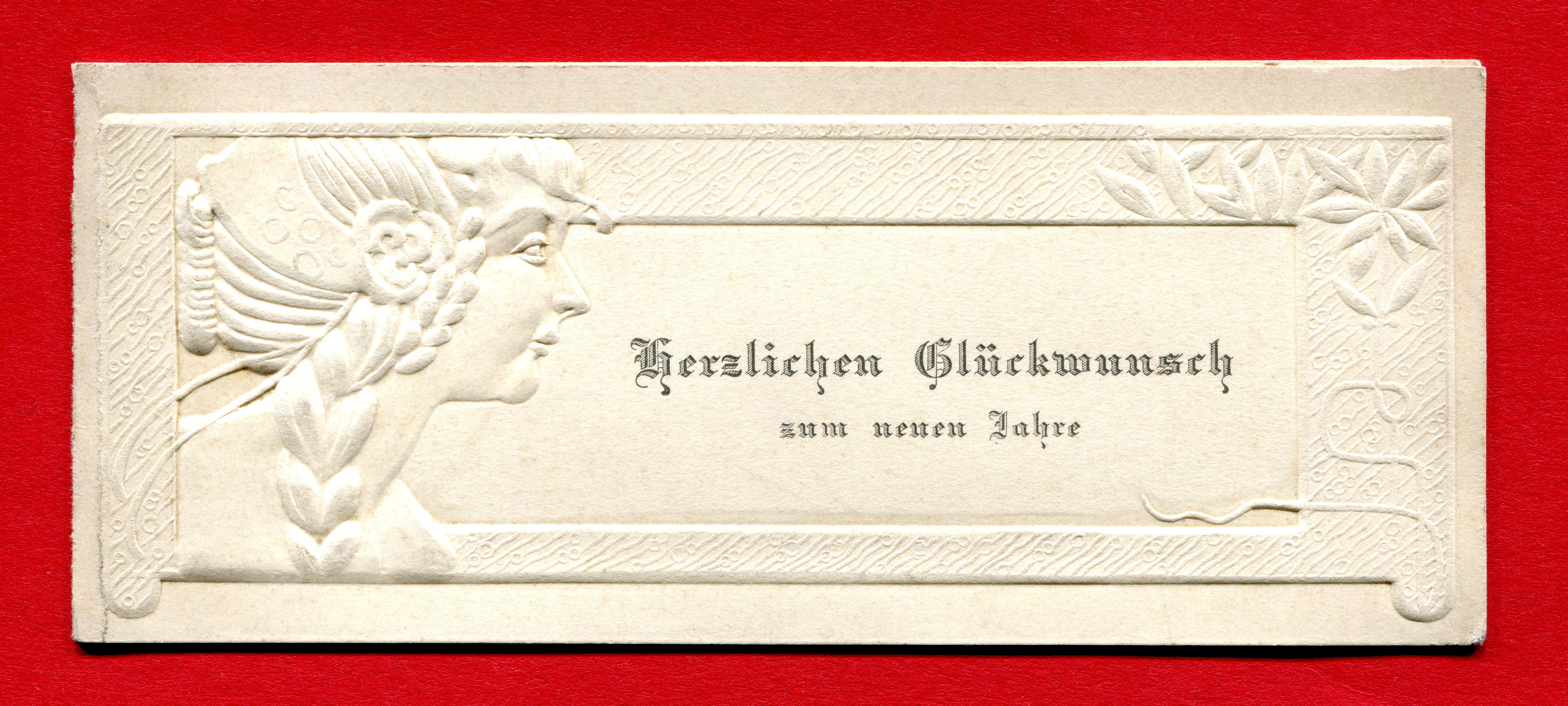 New Year’s greeting card with embossed women’s head, probably from the first decade of the 20th century. The textura with diagonal hatching originated at the Bruce Type Foundry in New York, as Invitation Text. The same face or a similar one was shown by ATF in 1901 as Tiffany Text, and was renamed to Typo Text before 1912.