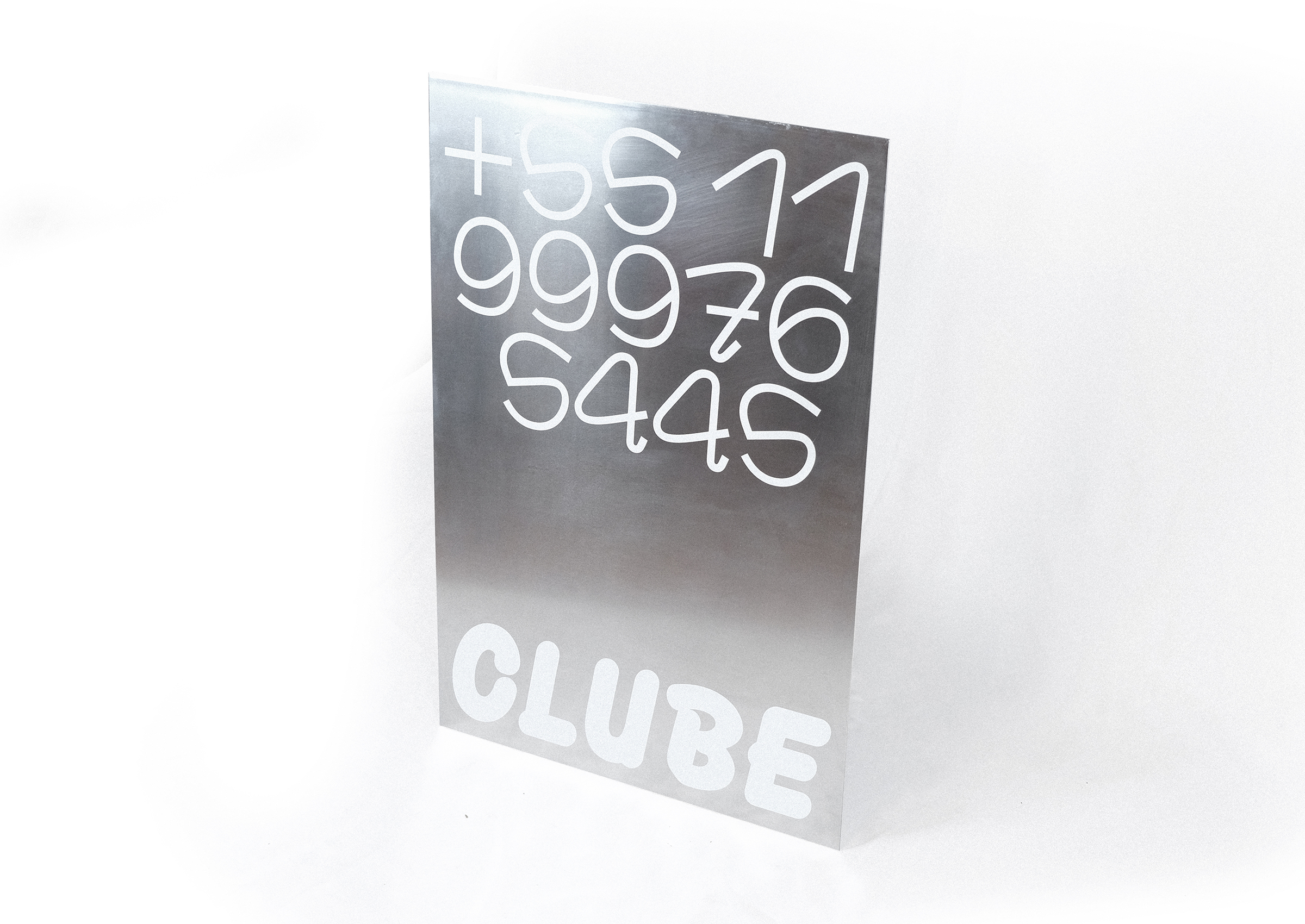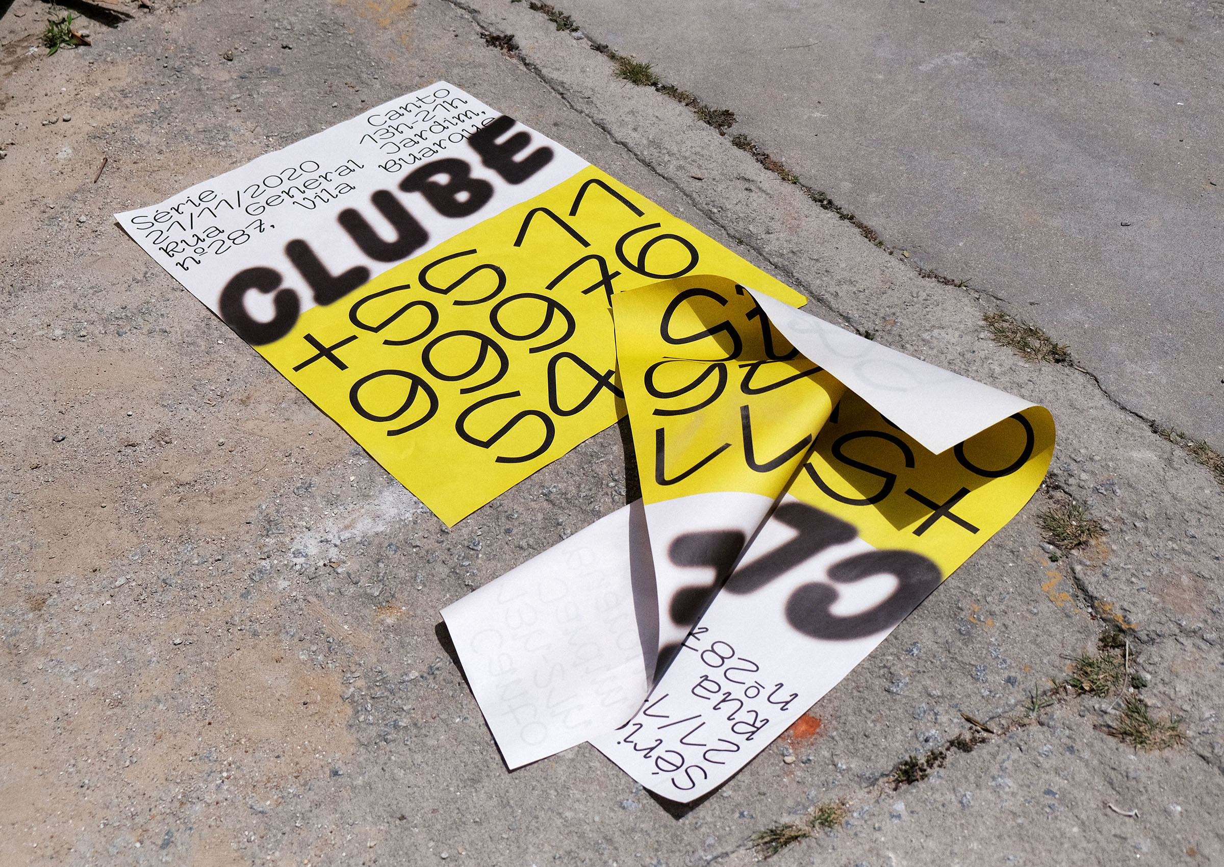 G2 Ciao in use for CLUBE (São Paulo) on an exhibition poster and oversized steel business card.