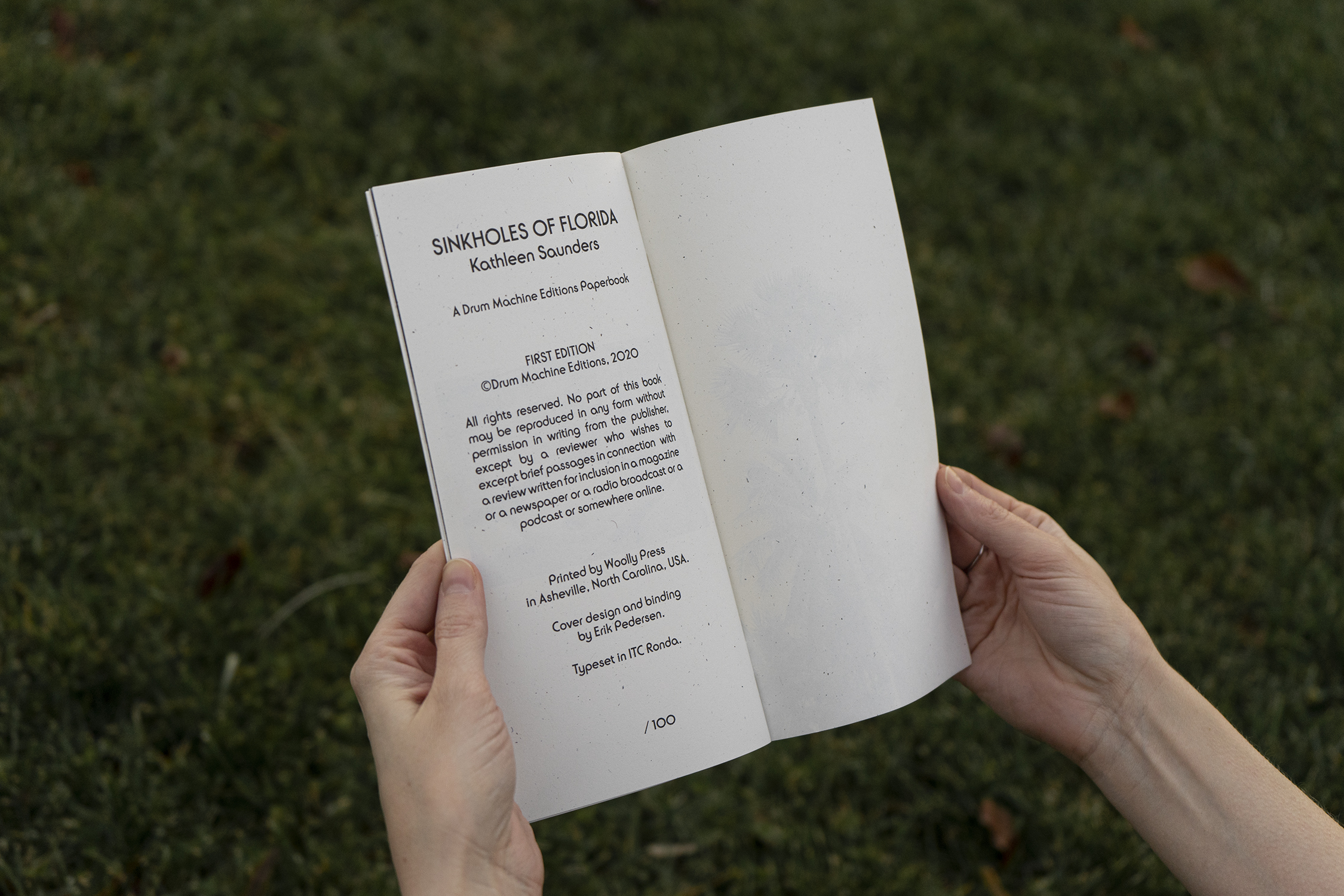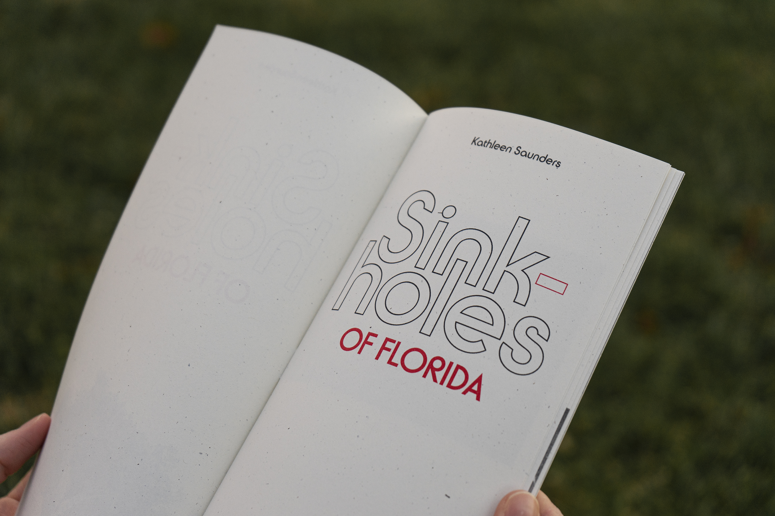 Sinkholes of Florida is a riso-printed photobook by Charleston, SC-based photographer Kathleen Saunders. Cover design, layout, and binding by Erik Pedersen at Drum Machine Editions. Printed by Colin Sutherland at Woolly Press. Cover, title page, and colophon set exclusively in ITC Ronda by Herb Lubalin (ITC, 1970).