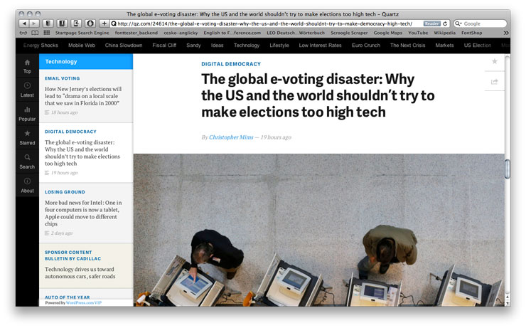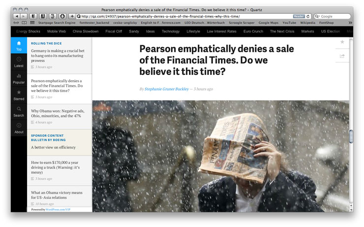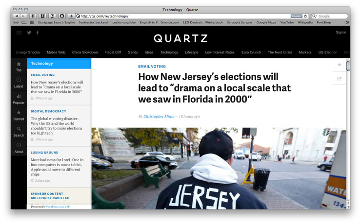 Quartz Contributed by TypeTogether on Apr 29th, 2013. Artwork published in 2012. Source: www.type-together.com License: All Rights Reserved. The Atlantic Media Company recently launched their new digital business news publication, called Quartz. It has been built primarily for mobile devices, tablets and phones. As headline font, they are using Adelle Sans Bold. Source: www.type-together.com License: All Rights Reserved. Source: www.type-together.com http://qz.com/. License: All Rights Reserved. Typefaces More about Adelle SansGet Adelle SansMore about PT Serif Formats Mobile/Tablet (1025) Topics News (554) Designers/Agencies The Atlantic Media Company (2) Tagged withapps (234)webfonts (449)Quartz (publication) (2) In SetsType Designs by Women (Fonts In Use Staff) (1891) Post a comment Name Email – will not be published Website Your response Submit Comment More Adelle Sans in use El universo en un hilo2017César SesioDesign SessionsContributed by TypeTogether Offscreen magazine 20142014Kai BrachContributed by TypeTogether Staff Pick Choreografia: polityczność2018KilkuIdalia SmyczyńskaRobert ZającContributed by TypeTogether Sponsor More in News Bourse René Payot 20132013Solid | Graphic DesignContributed by Franck Doussot Antena 3 Logo2017GédéonAtresmediaContributed by Enrique Hernandez The Wall Street Journal – interiors2001Mario GarcíaContributed by Font Bureau Stavanger Aftenblad2008Contributed by Font Bureau More in Mobile/Tablet Remi Reniers2025Other StudioContributed by Samuel Gadd Joyce N. Ho website2019New AssociationContributed by Julian Hutton Project Space Festival 20242024Erin MitchellContributed by NaN Upworkc. 2022Porto RochaAltoContributed by Out of the Dark More Fonts In Use David Optik logo (1993)1993Vorarlberger GrafikOthmar MotterContributed by Florian Hardwig Staff Pick Snapshot (Flow Festival)2018Joosung KangOona ViskariContributed by Benoît Bodhuin Staff Pick Camera Japan Festival 2013 poster2013ZelootContributed by Stephen Coles Staff Pick Raaka Chocolate2018Andrea Trabucco-CamposSimon BlockleyContributed by Production Type Staff Pick