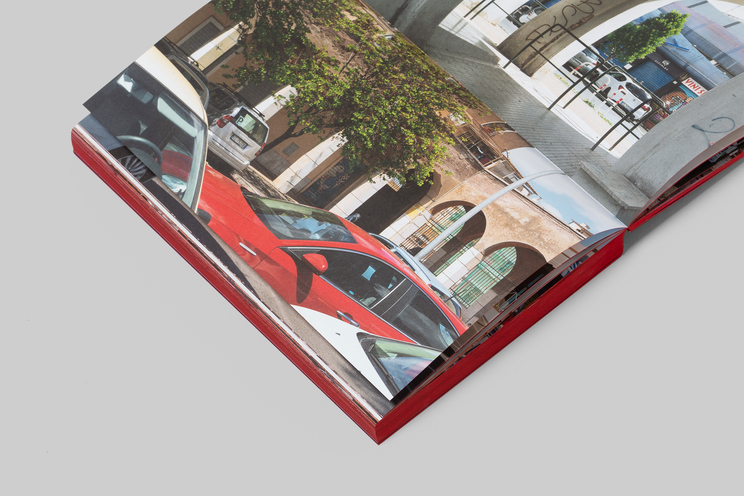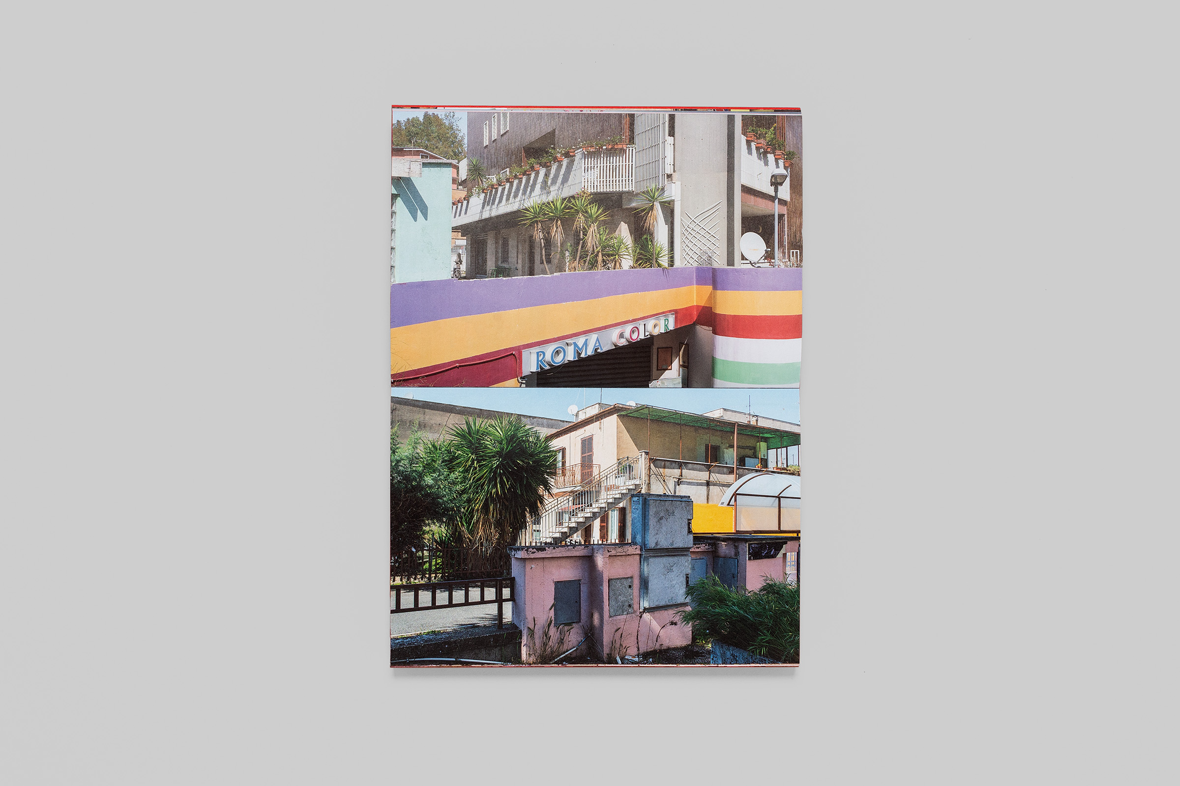 An extensive documentation of the small ugliness of the suburbs of Rome that add up to create a seamless visual noise. A “brick book”, which conveys this overabundance and visual violence. A brick where is predominant the red color in contrast and vibration with the electric blue recreating the visual energy of the photographs.