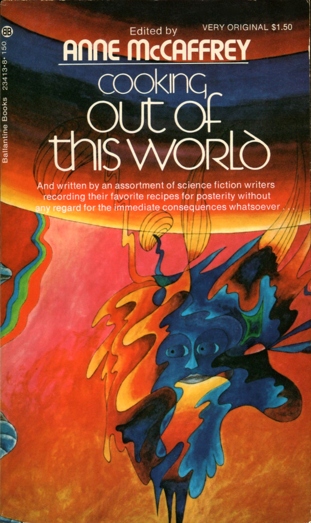 Designed by Sjoerd de Roos in 1939 as a monolinear variation of his Libra (1938), Simplex was ahead of its time. Having shaken off all connotations of medieval monks by eliminating the thick-and-thin of the broad-nibbed pen, it really only went off in the 1970s, when the skeletal uncial was rediscovered as an expression of exotic or otherworldy themes. The cover for Cooking Out of This World as published by Ballantine Books in 1973 is a prime example. The cookbook with recipes from various science fiction writers was edited by Anne McCaffrey (1926–2011). Her name is set in Burko (or maybe the virtually identical Blippo Bold). The cover art is by Jacques Wyrs.
