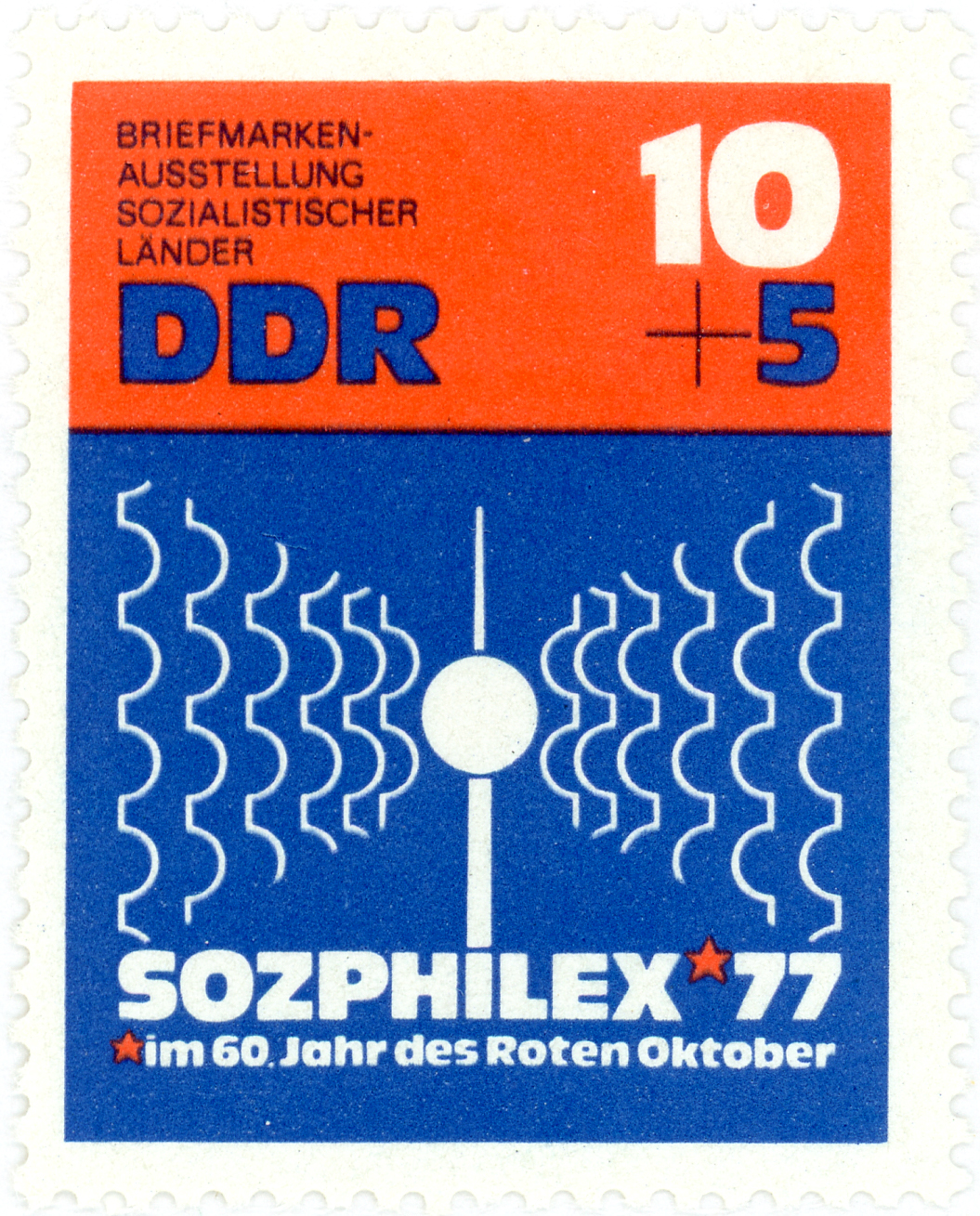 East German postage stamp issued on the occasion of the Sozphilex ’77, a philatelic exhibition of Socialist countries, organized in the 60th year of the Red October, and depicting Berlin’s Fernsehturm.
