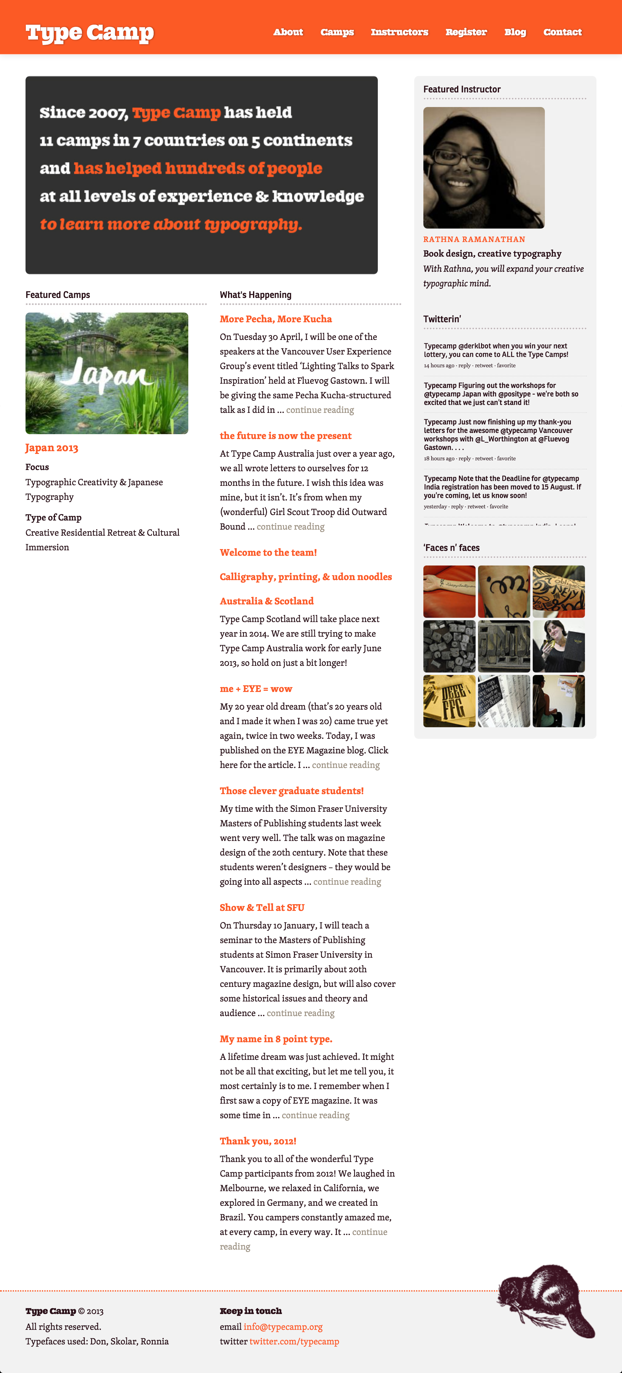 For the website: What is there not to love? Three gorgeous type families, including the exclusive Don. A useful adaptive layout. Lots of vermilion. And a Castor canadensis! That even outweighs the straight apostrophe on the homepage.