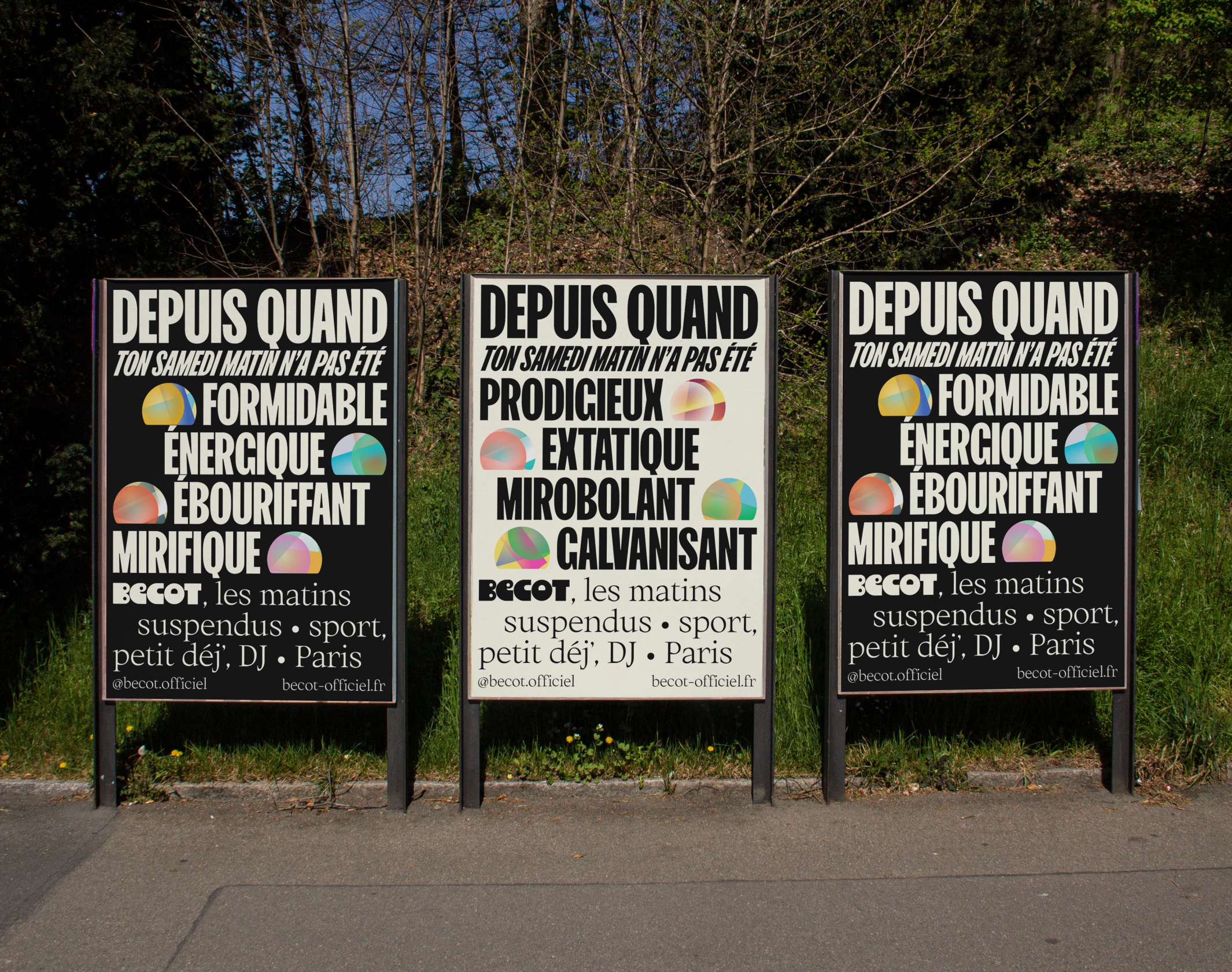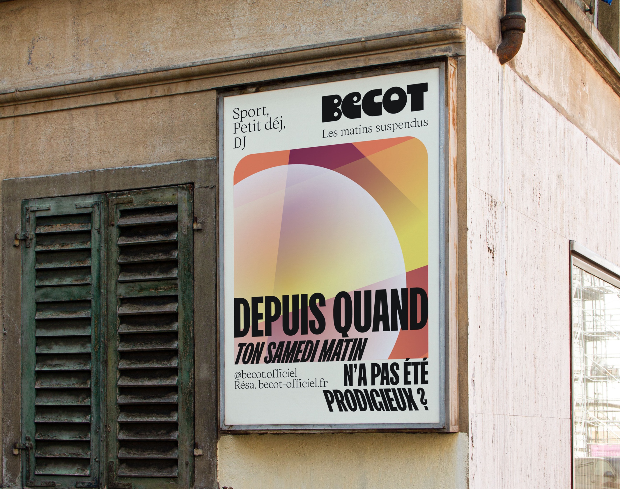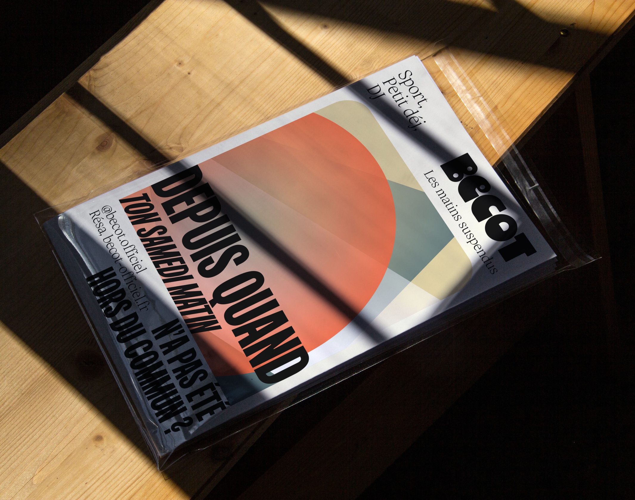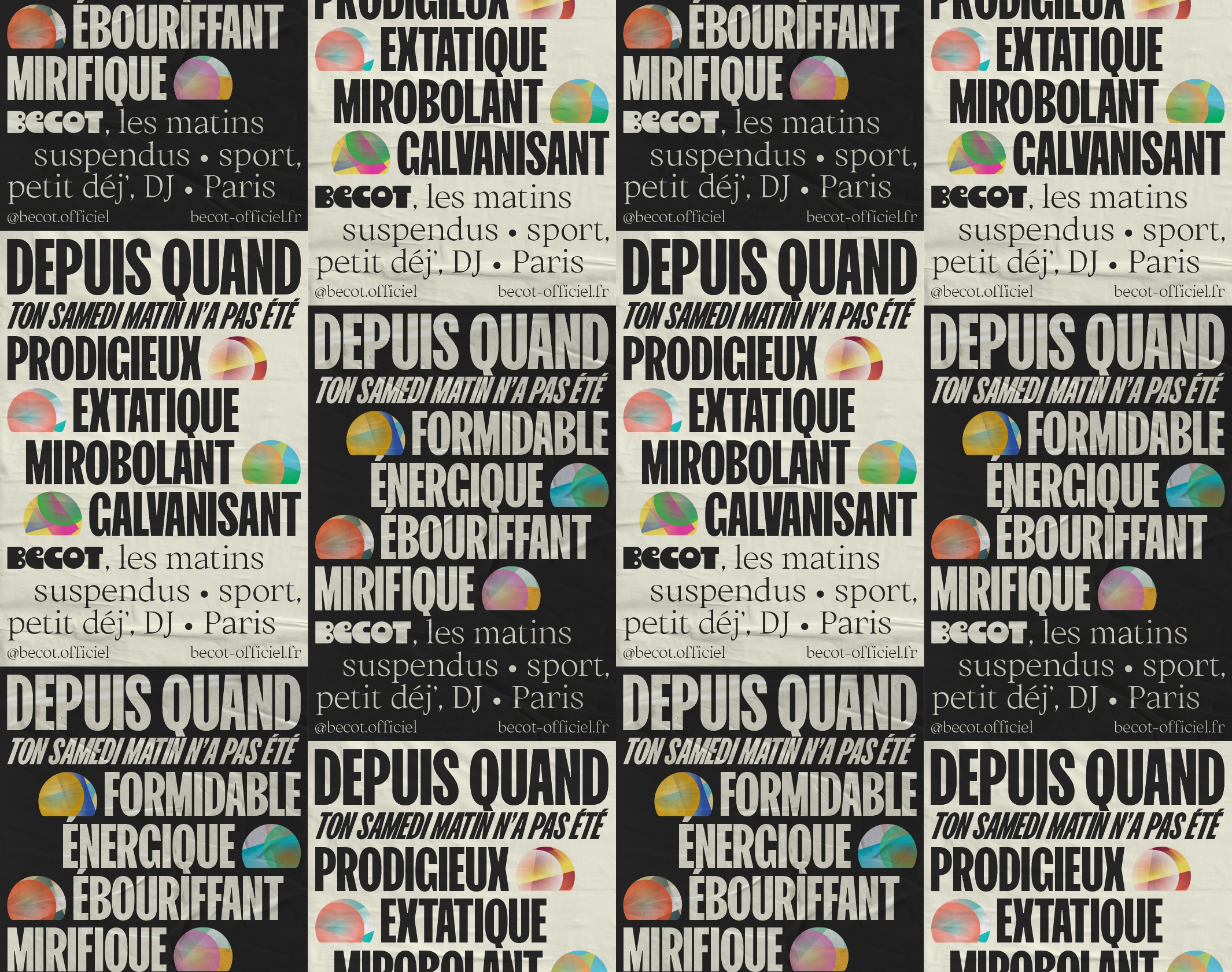 Since when has your Saturday morning not been amazing? Imagined by Marine, Bécot is a creator of morning events based in Paris. Her speciality is to offer galvanising moments by combining sport, DJ, music, breakfast, on a Saturday morning, in a variety of venues. The aim of this movement: to get together, to wake up, to dance. Prior to its official launch in 2021, we were asked to create the graphic identity for these events.