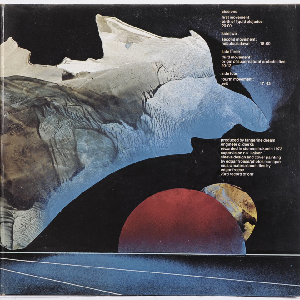 The third studio album by German electronic music group Tangerine Dream was released in 1972 on Ohr Musik. Sleeve design and cover painting by band member Edgar Froese, with photography by Monique.
