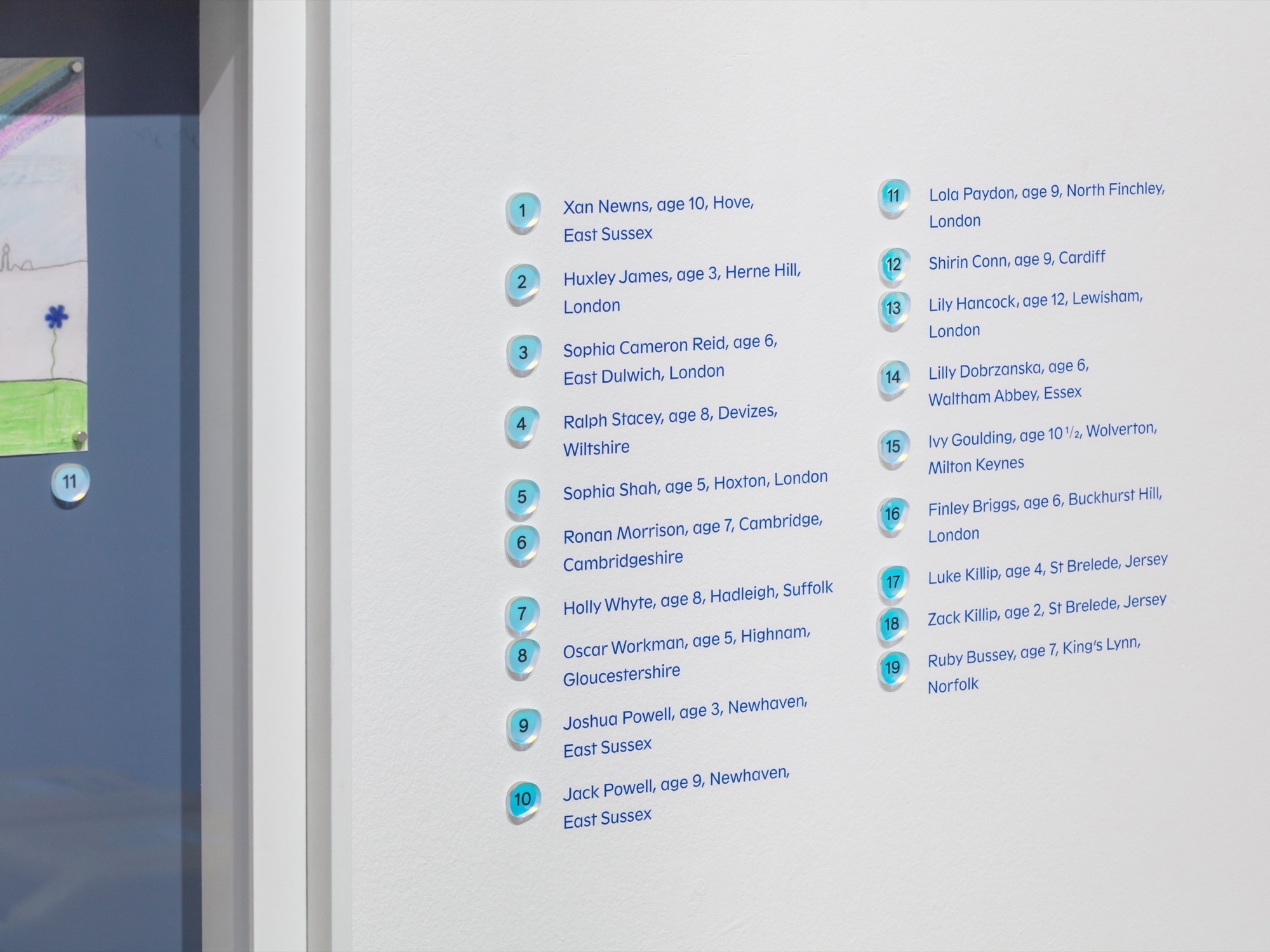 Around 120 drawings are held within eight oversized frames inspired by different window geometries and sky tones creating a ‘windowscape’ bordering each side of the gallery to display the work on mass. A sculptural mobile welcomes visitors in lieu of a regular wall graphic.