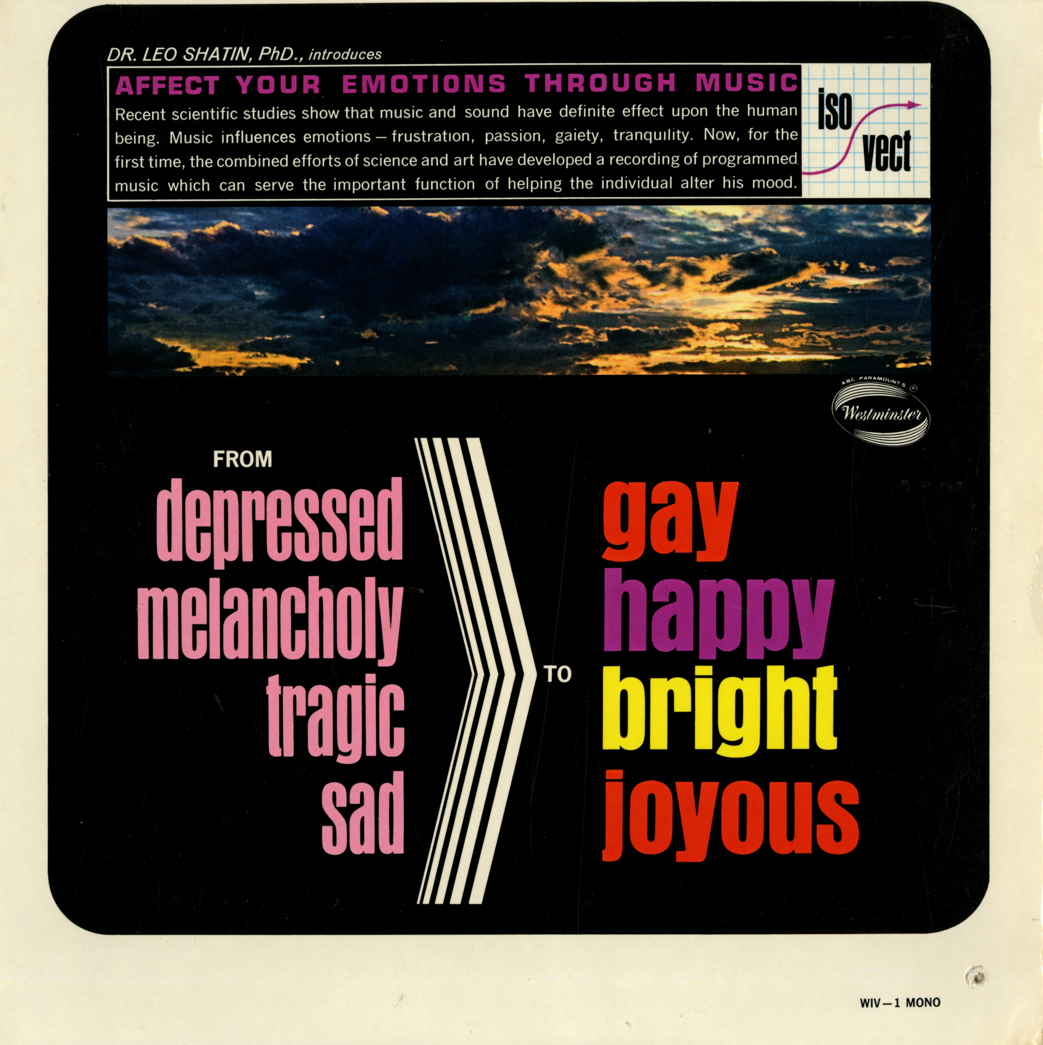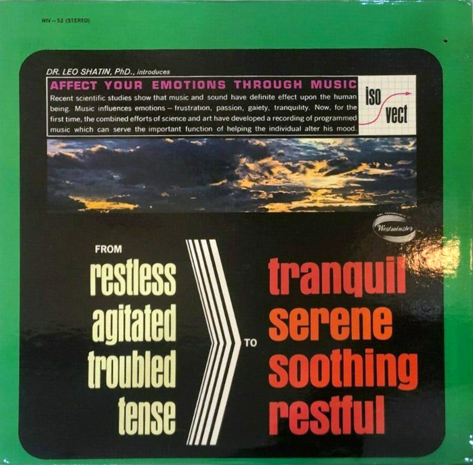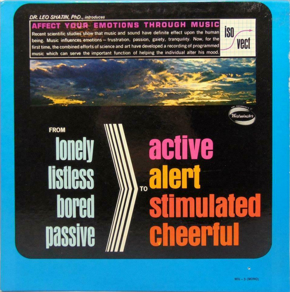 Developed by Dr. Leo Shatin (1919–2019), Professor of Clinical Psychology, and released around 1965, the three records with uplifting orchestral music are supposed to “affect your emotions through music”. From the back cover: