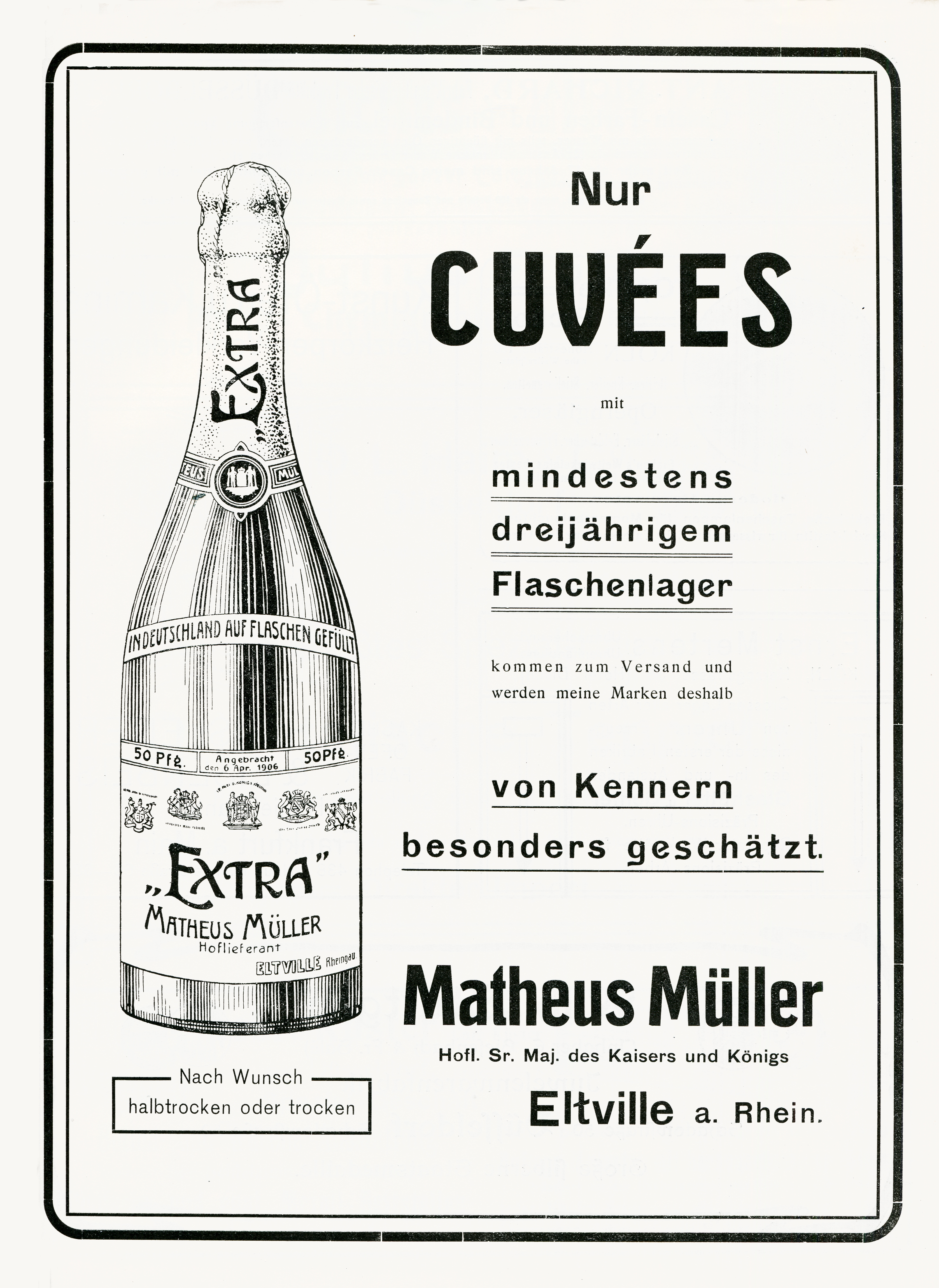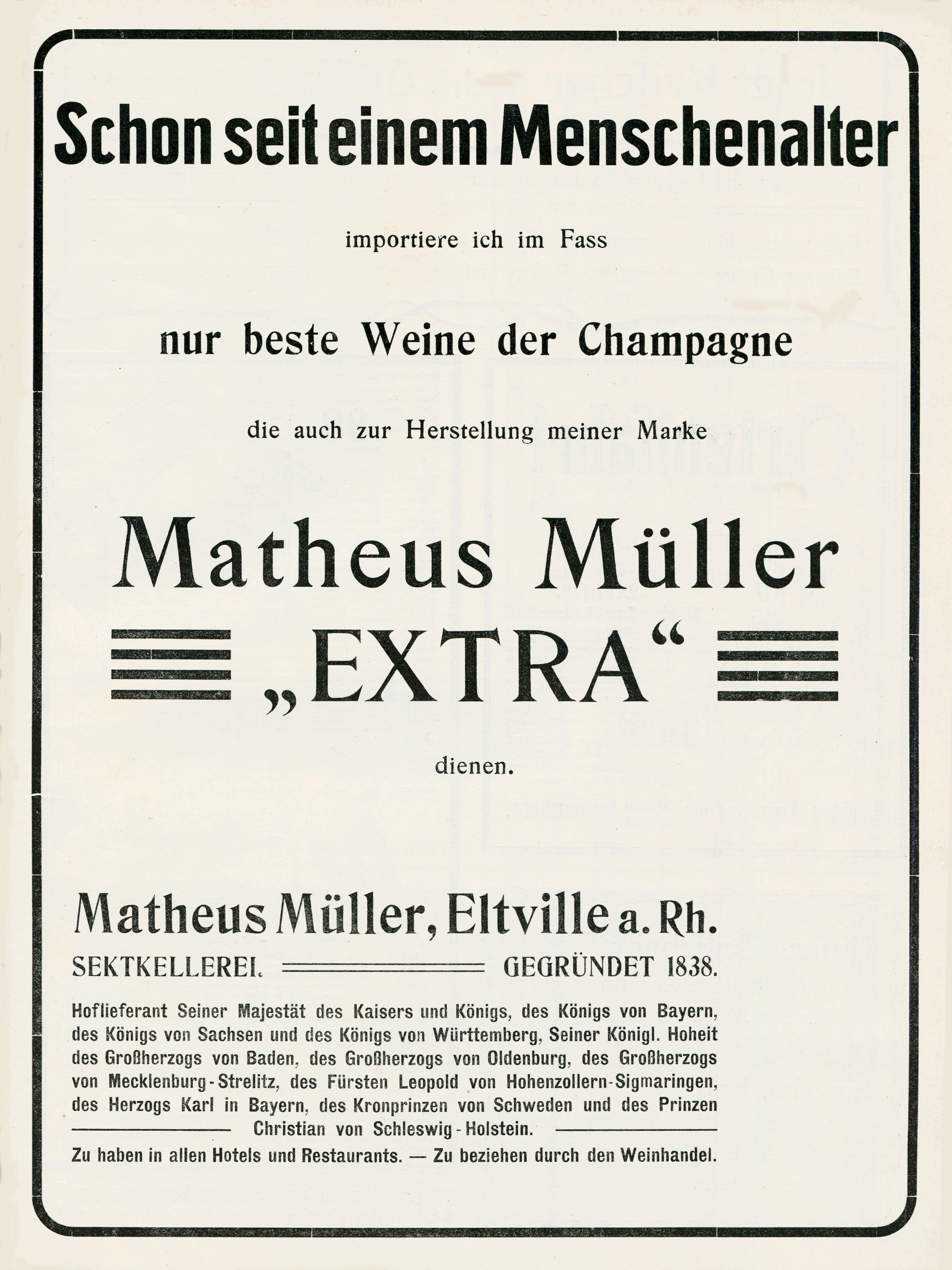 Matheus Müller is a German brand of sparkling wines established in 1838 and named after its founder (1773–1847). These full-page ads from 1906 bring together a number of period typefaces.