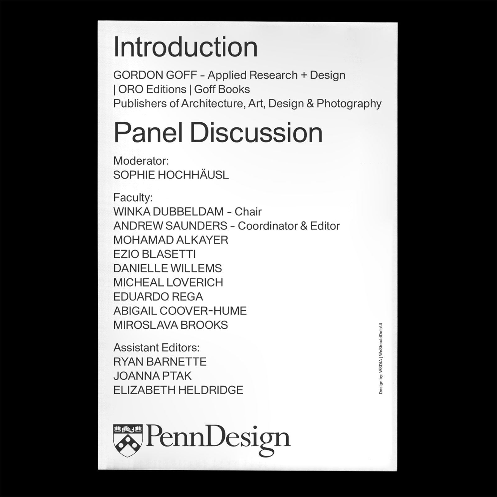57 Pavilions book launch, University of Pennsylvania Contributed by Adrien Menard on Jan 25th, 2021. Artwork published in 2019. Photo: Adrien Menard. License: All Rights Reserved. Embossed invitation/flyer for the 57 Pavilions book launch by Andrew Saunders at University of Pennsylvania, School of Architecture. Designed by WeShouldDoItAll and using Syndicat Grotesk published by edition.studio. License: All Rights Reserved. License: All Rights Reserved. Typefaces More about Syndicat GroteskGet Syndicat Grotesk Formats Posters/Flyers (5803) Topics Institutional (1419) Architecture (1427) Education/Academia (2200) Designers/Agencies WSDIA WeShouldDoItAll (7) Tagged withUniversity of Pennsylvania (2)architecture (524)invitations (236)embossed/debossed (631)silhouettes (115)black and white (2032)one typeface (1758)numerals (1094)Andrew Saunders (1)launch events (59) Artwork location United States (9980) Philadelphia (68) Pennsylvania (60) In Setsposter (miguel anønimo) (67)TYPE (Dunya Ahmad) (361) Post a comment Name Email – will not be published Website Your response Submit Comment More Syndicat Grotesk in use Kunsthalle Münsterc. 2018JMMPContributed by Adrien Menard Staff Pick Spring 2020 lecture series poster, University of Texas at Austin School of Architecture2020WSDIA WeShouldDoItAllContributed by Adrien Menard Ourros2021Plus MûrsContributed by Adrien Menard Sponsor More in Education/Academia Tag der Schrift 2016c. 2016Dominique KerberSchriftgestaltungContributed by Fernando Díaz Ground Lost2007Dejan KršićWhat, How and for Whom/WHWContributed by Jeremy Tankard 20 Jahre – 20 Stimmen2024Sarah FeilmayrLetitia LehnerMOOI DesignContributed by Letitia Lehner The 1943 Silhouette (Agnes Scott College yearbook)1943Contributed by Stephen Coles Staff Pick More in Posters/Flyers T_24c. 2015Alexander VasinContributed by Gayaneh Bagdasaryan Royal Academy of Fine Arts in Antwerp, Open House 2020c. 2020Studio BöreckContributed by Studio Böreck Parables for the Biotech Age at The Tech Interactive poster2024Pearlyn LiiContributed by Inès Davodeau Brussels Museums Nocturnes 20182018Specht StudioContributed by Stephanie Specht Staff Pick More Fonts In Use Footnotes, issue B2017Mathieu ChristeLa PoliceContributed by Mathieu Christe Staff Pick Rolling Stone, Batman Issue, 19931993Fred WoodwardContributed by Stephen Coles Staff Pick Richard Avedon, Observations1959Alexey BrodovitchContributed by Stéphane Darricau Staff Pick real talk lecture poster2024Lea Johanna BeckerContributed by Lea Johanna Becker Staff Pick