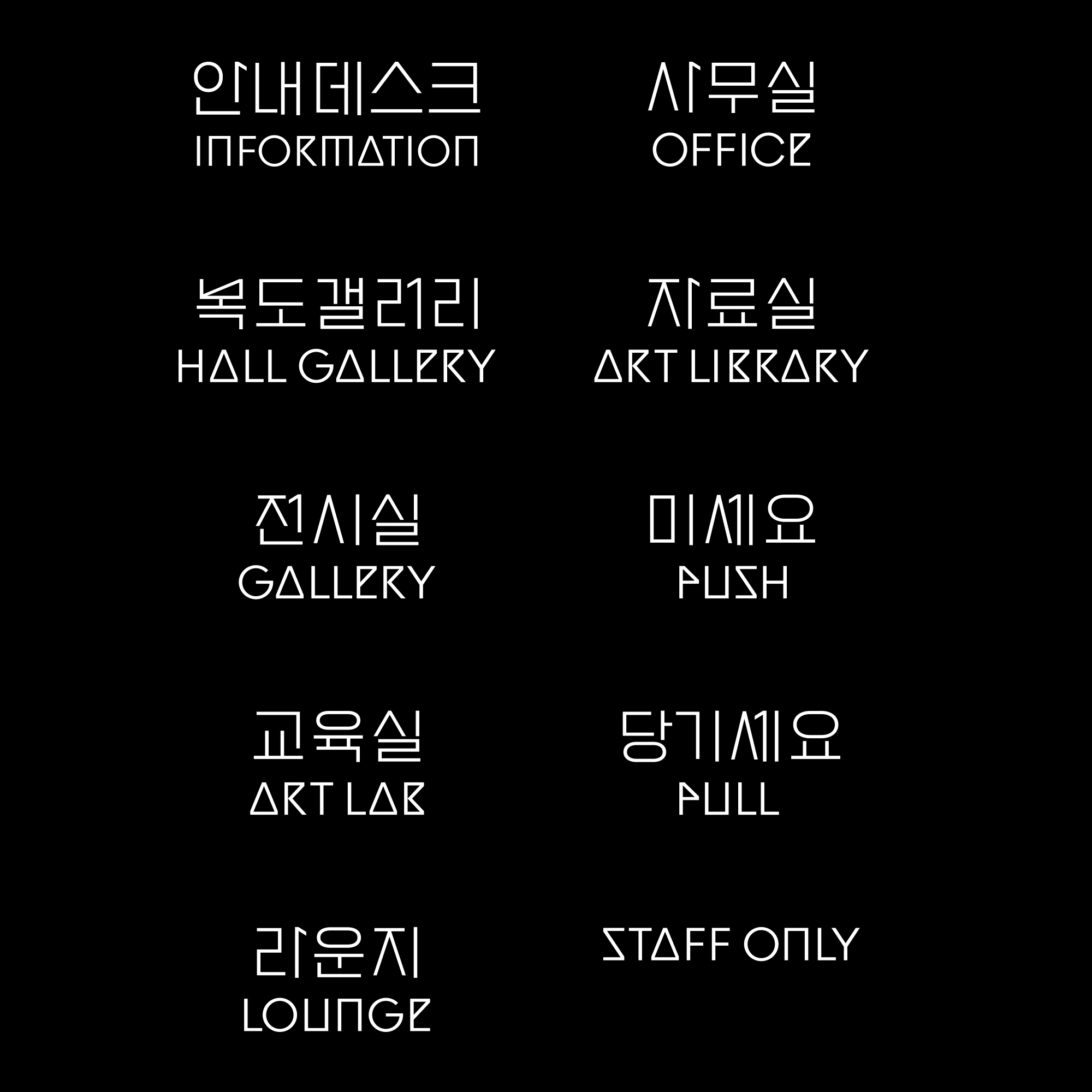 I assume that the Korean is custom designed. A brand manual from 2020 (pdf) states that HG꼬딕씨 40g is used for display purposes in Korean (alongside Ano Angular for English and Noto Sans for text in both languages). The image below shows two signs from the wayfinding system (top row), compared to HG꼬딕씨 40 (bottom). It looks like the lettering is based on this typeface, with some curved details straightened, just like in Ano Angular. But maybe someone with Hangul knowledge can comment on that.
